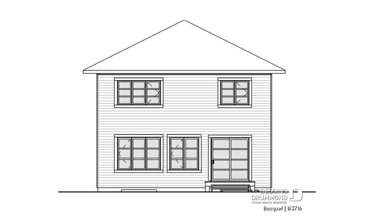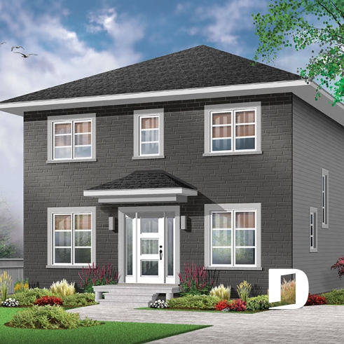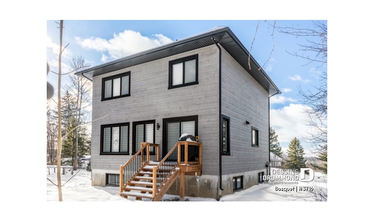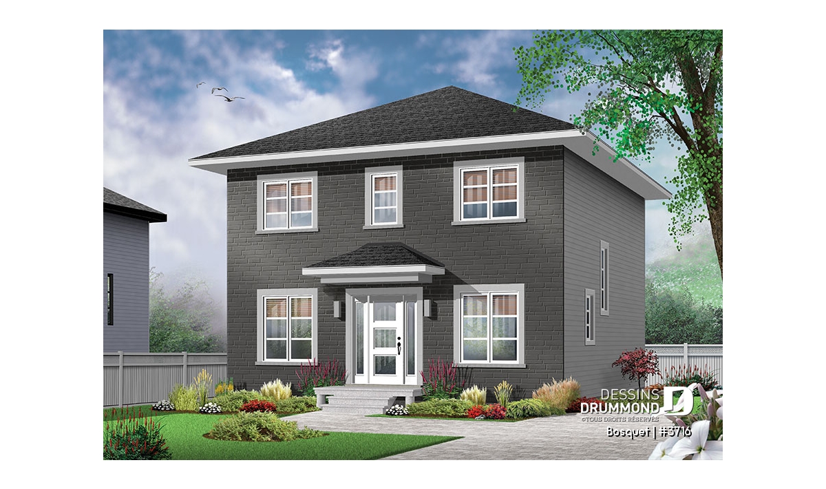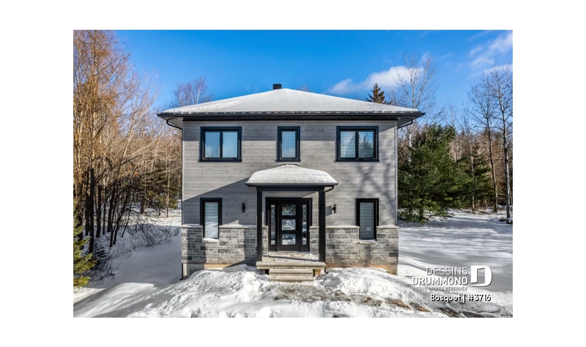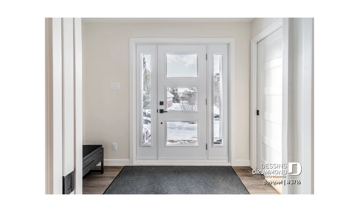 Avec son extérieur plutôt épuré, ce plan recèle toutefois plein d’utilités comme cette entrée facilement convertible en véritable vestibule fermé et dotée à la fois d’une garde-robe de bonnes dimensions et d’un espace banc d’entrée. Il en va aussi de ce bel espace bureau à domicile que certains apprécieront utiliser comme salle de jeux pour les enfants.
