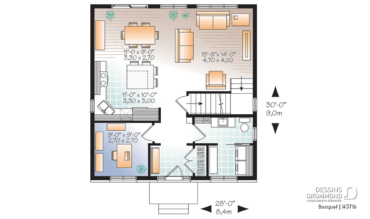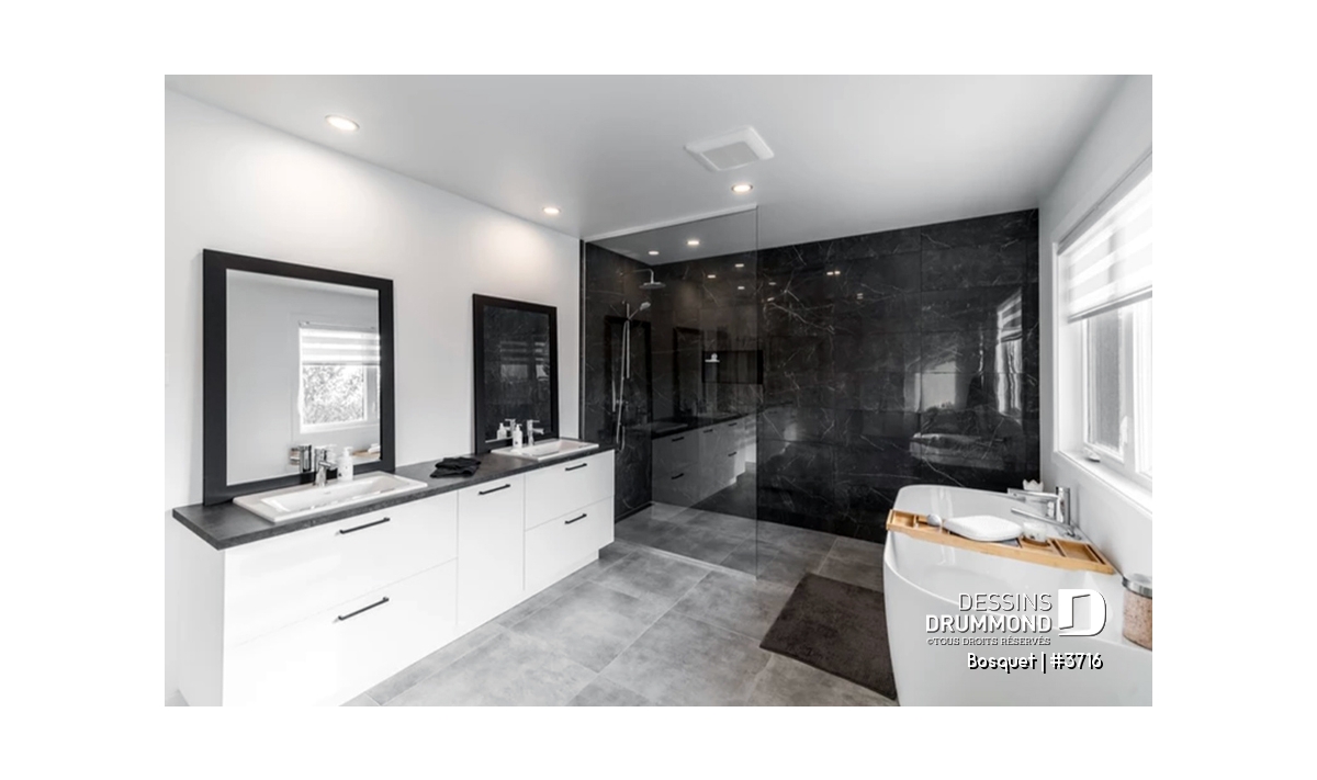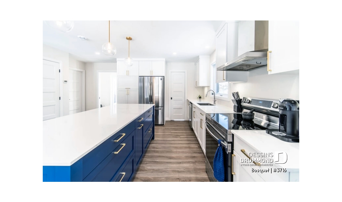 Suite à un sondage réalisé sur notre site internet et mettant en vedette trois aménagements intérieurs de rez-de-chaussée, le choix le plus prisé de la part des internautes fut donc celui retenu pour ce plan contemporain 3716.