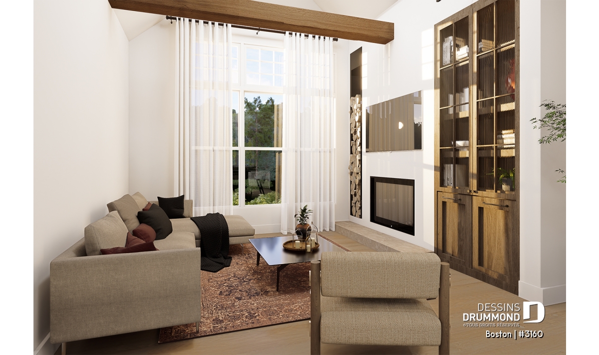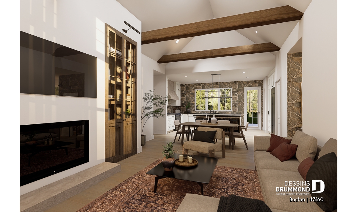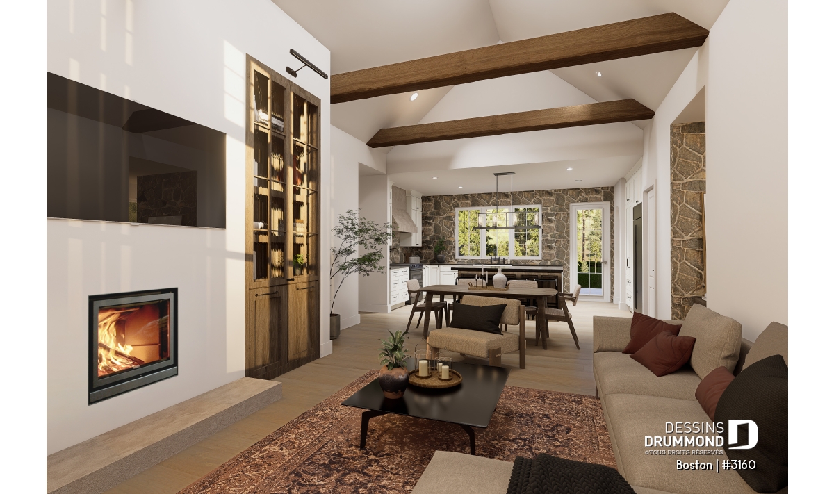 L’aire de vie principale regroupe le salon, la salle à manger et la cuisine dans un grand espace ouvert linéaire baigné de lumière naturelle grâce à un plafond cathédrale de 16'8". Cet agencement crée une ambiance vaste, aérée et conviviale. Au cœur du salon, le foyer à bois STÛV s16-Z proposé devient la pièce maîtresse : il apporte chaleur, style et confort, transformant chaque moment passé dans cet espace en expérience accueillante et raffinée.