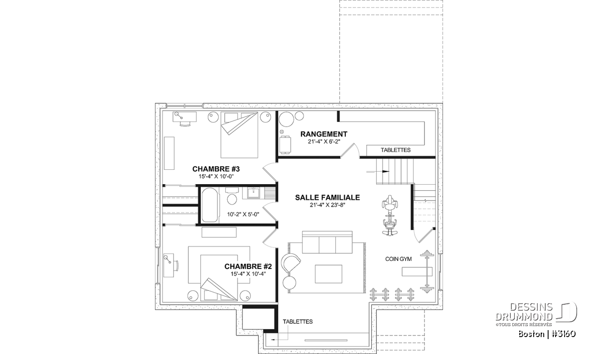 Si vous décidez d'aménager le sous-sol comme proposé sur la fiche du plan, ceci ajoutera une grande valeur à cette maison. L'aménagement proposé comprend deux chambres secondaires, séparées par une salle de bain complète, une salle mécanique avec rangement optimisé, une salle de jeux conviviale et même un coin gym pour bouger sans quitter la maison.