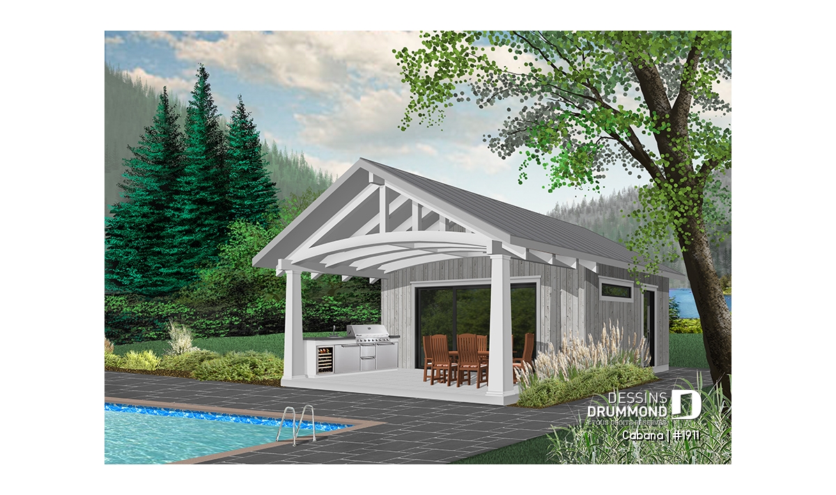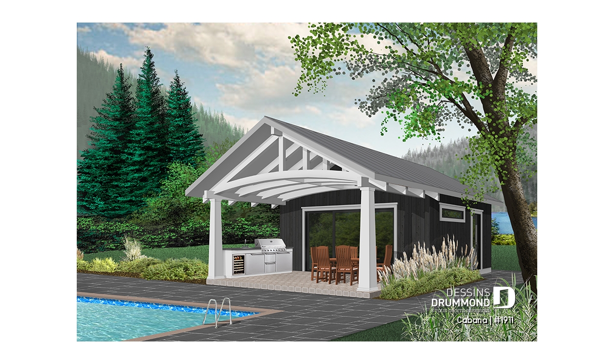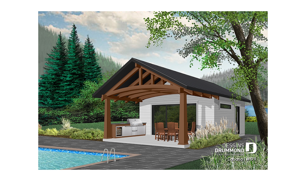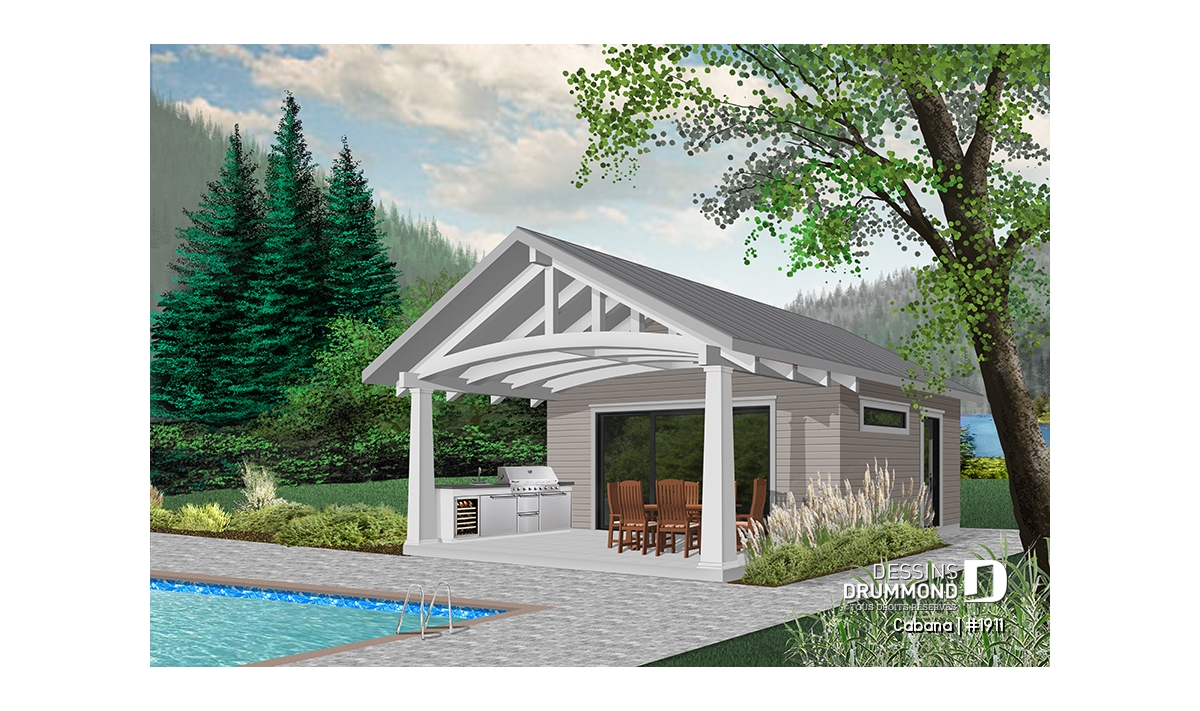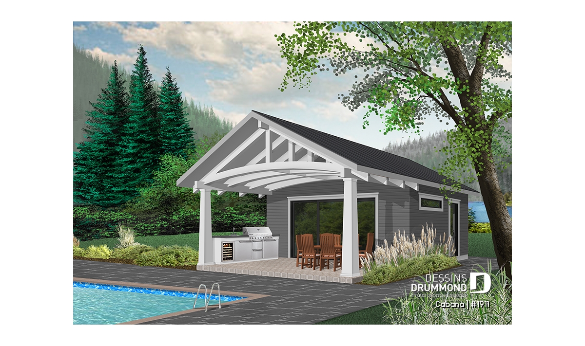 Ce nouveau plan de pavillon de jardin de Dessins Drummond, ou grand cabanon pour piscine, vous procurera de l’espace habitable et rangement supplémentaire, durant la belle saison. En effet, ce nouveau modèle de pavillon « Le Cabana » ou plan # 1911 de Dessins Drummond, offre plusieurs commodités à ne pas passer sous silence, tel sa grande terrasse couverte. Cette dernière est suffisamment grande pour contenir un coin cuisine avec BBQ, évier et réfrigérateur. De plus, un coin salle à manger extérieur, avec espace suffisant pour recevoir une table de 6 à 10 personnes, est bien pratique avec son toit. Une télévision pourrait même être installée à l’extérieur et des fauteuils pourraient remplacer la table, à vous de choisir!