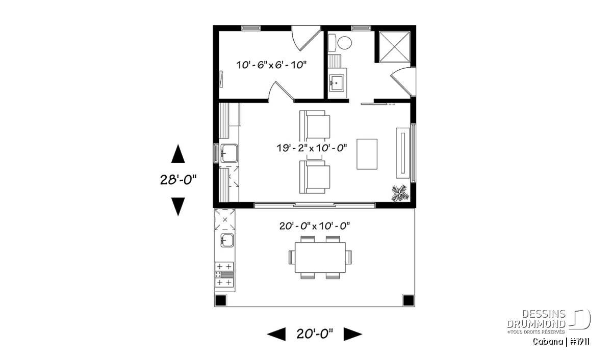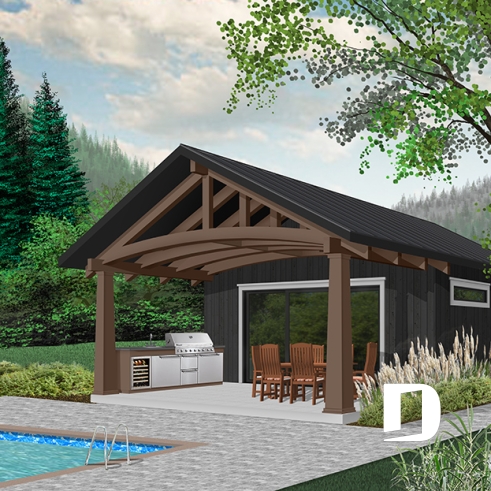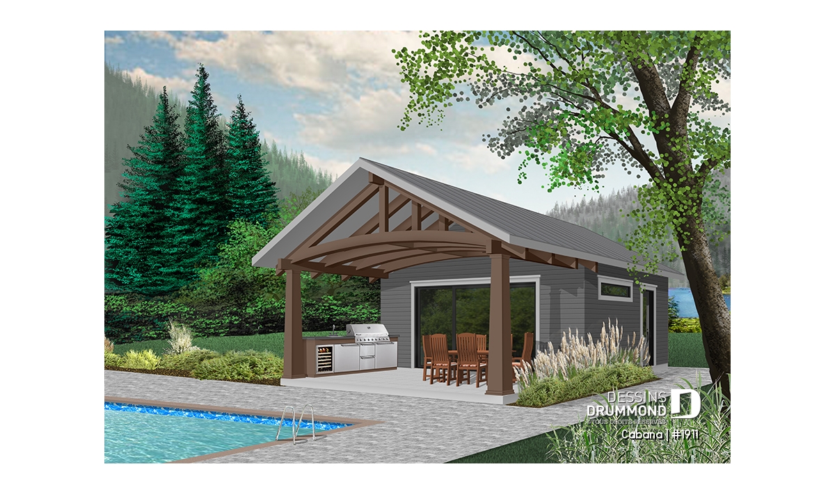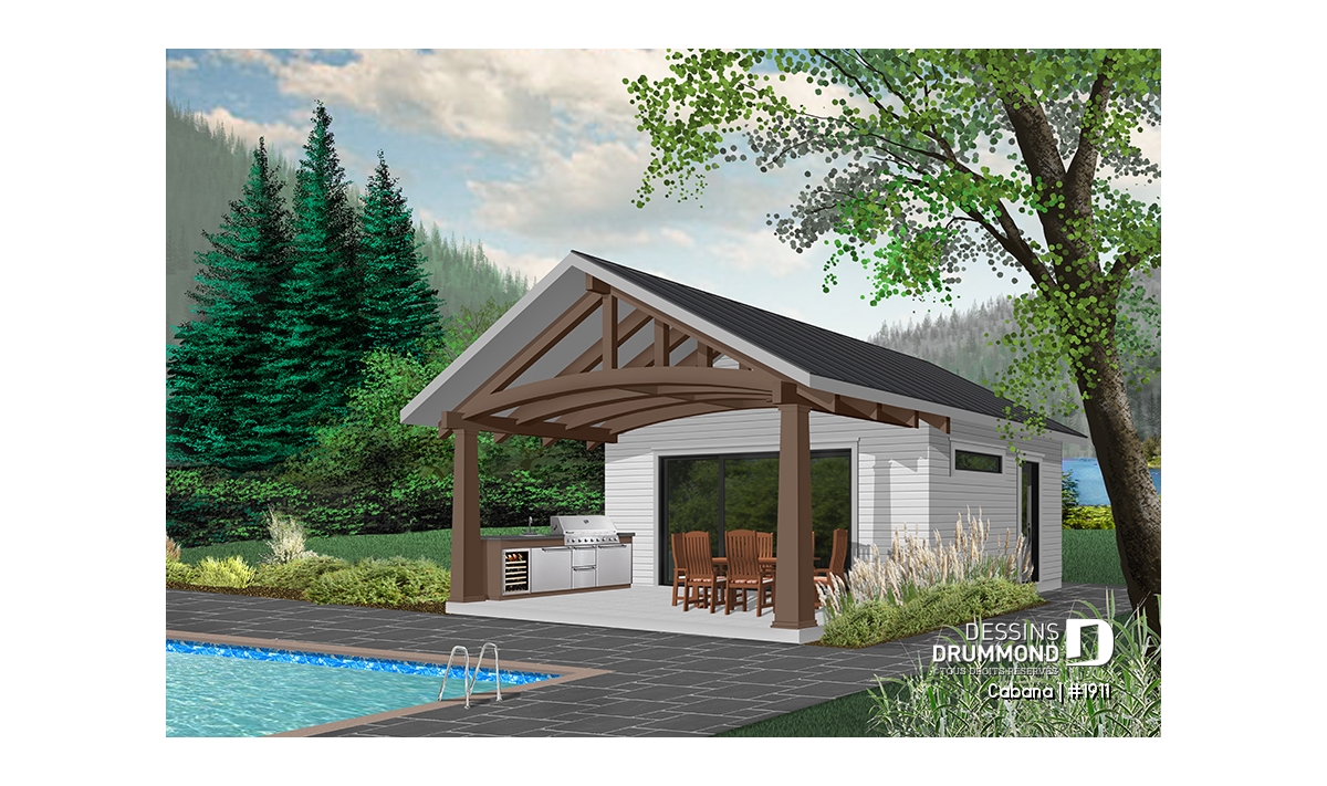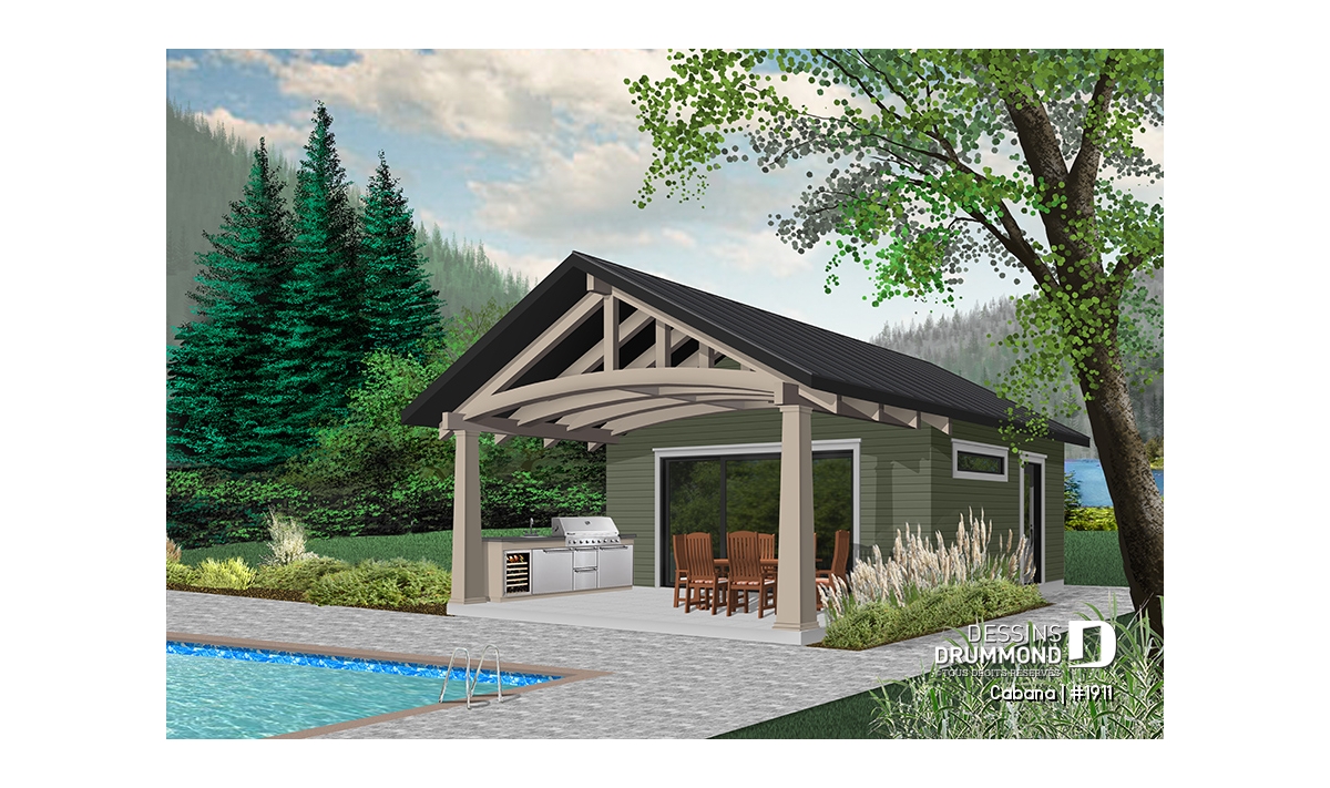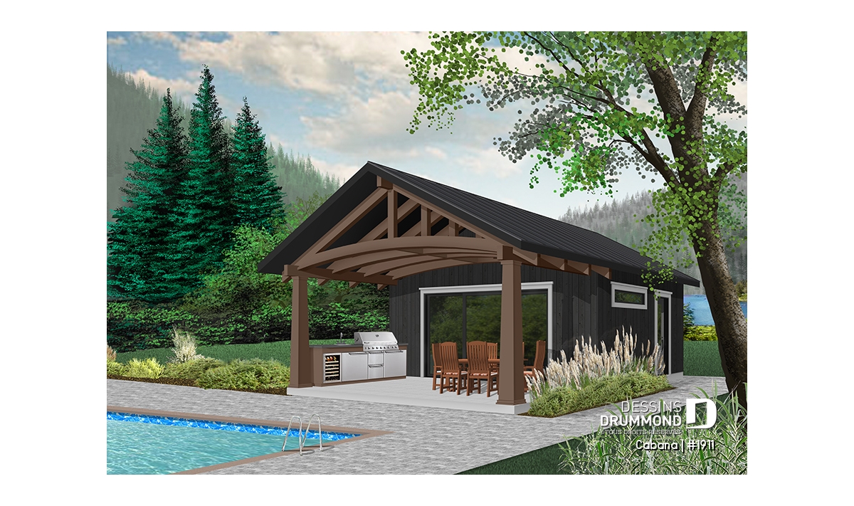 Ce nouveau plan de pavillon de jardin de Dessins Drummond, ou grand cabanon pour piscine, vous procurera de l’espace habitable et rangement supplémentaire, durant la belle saison. En effet, ce nouveau modèle de pavillon « Le Cabana » ou plan # 1911 de Dessins Drummond, offre plusieurs commodités à ne pas passer sous silence, tel sa grande terrasse couverte. Cette dernière est suffisamment grande pour contenir un coin cuisine avec BBQ, évier et réfrigérateur. De plus, un coin salle à manger extérieur, avec espace suffisant pour recevoir une table de 6 à 10 personnes, est bien pratique avec son toit. Une télévision pourrait même être installée à l’extérieur et des fauteuils pourraient remplacer la table, à vous de choisir!