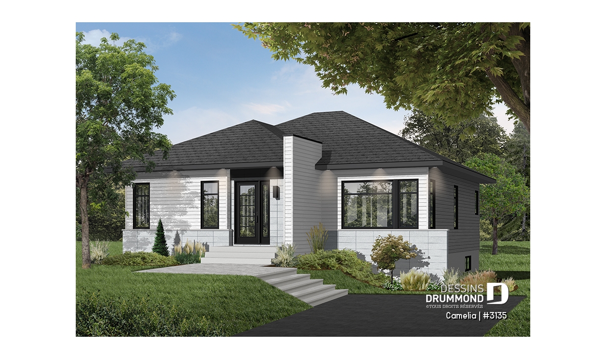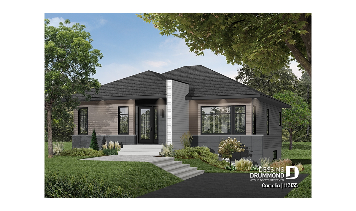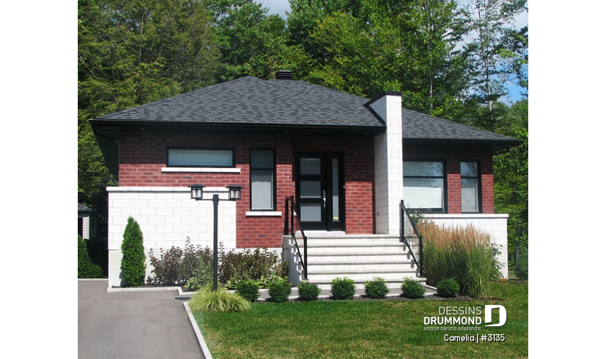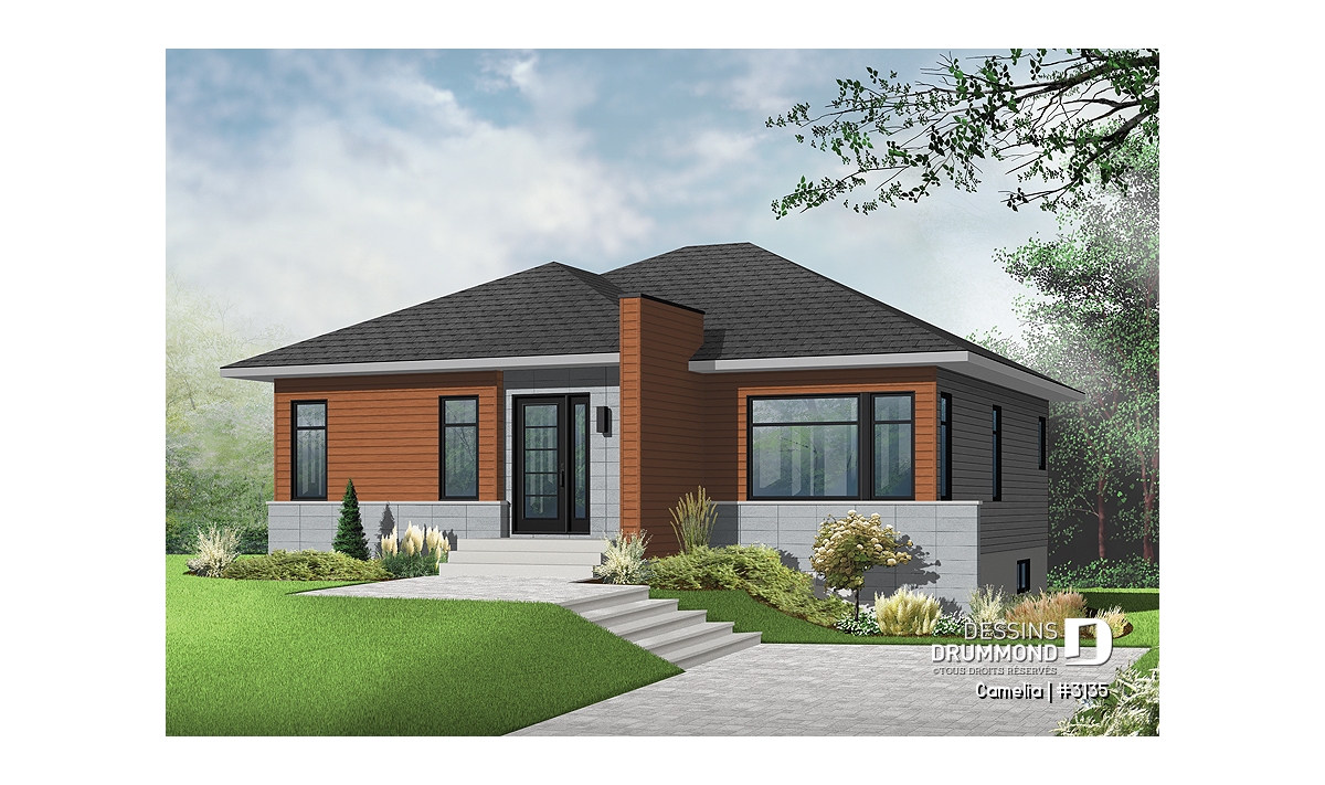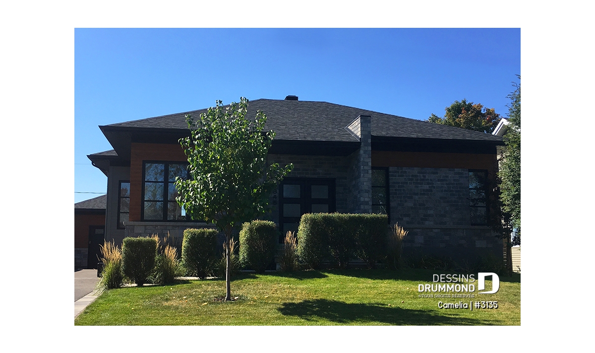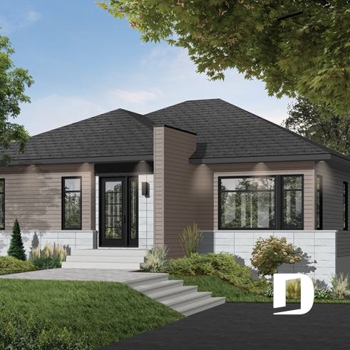 Ce plan est la preuve qu'une maison plein pied de petit format peut être très attrayante! Le style architectural de l'entrée et les fenêtres modernes foncées donnent un style originale à cette belle maison contemporaine.