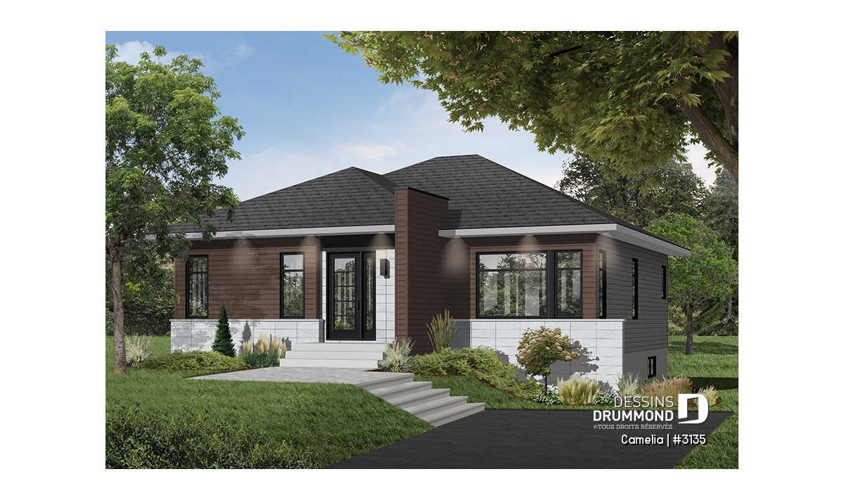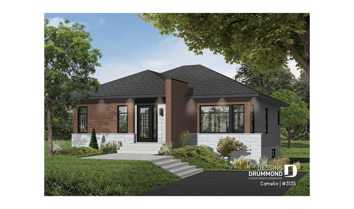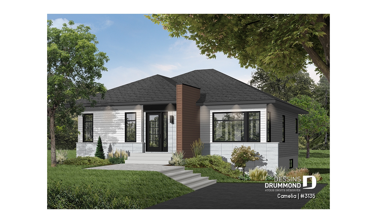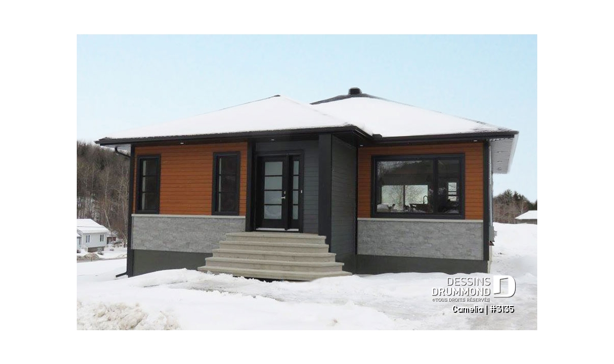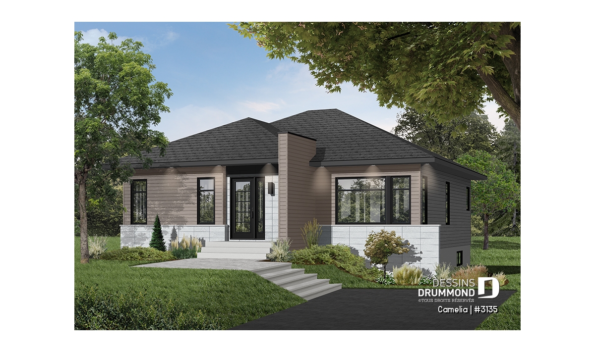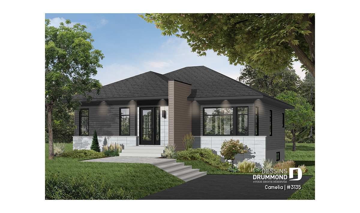 Ce plan est la preuve qu'une maison plein pied de petit format peut être très attrayante! Le style architectural de l'entrée et les fenêtres modernes foncées donnent un style originale à cette belle maison contemporaine.