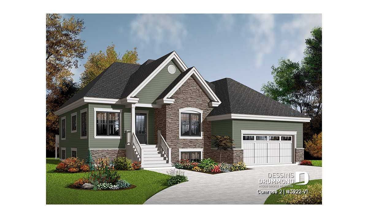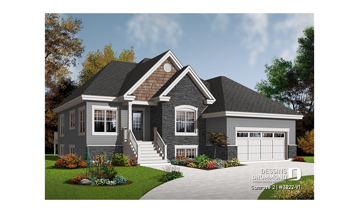 Après que le plan original 3222 ait obtenu un vif succès sur le marché québécois, les concepteurs ont finalement constaté que ce modèle était fréquemment modifié dans les Agences de Dessins Drummond afin de convertir le garage simple en garage double. De plus, la plupart de ces plans avaient vu leur rez-de-chaussée passer d’un plafond de 8 pi à un plafond de 9 pi de hauteur. Voici donc, enfin dirons certains, ce modèle 3222-V1 avec garage double et plafond à 9 pi au rez-de-chaussée.