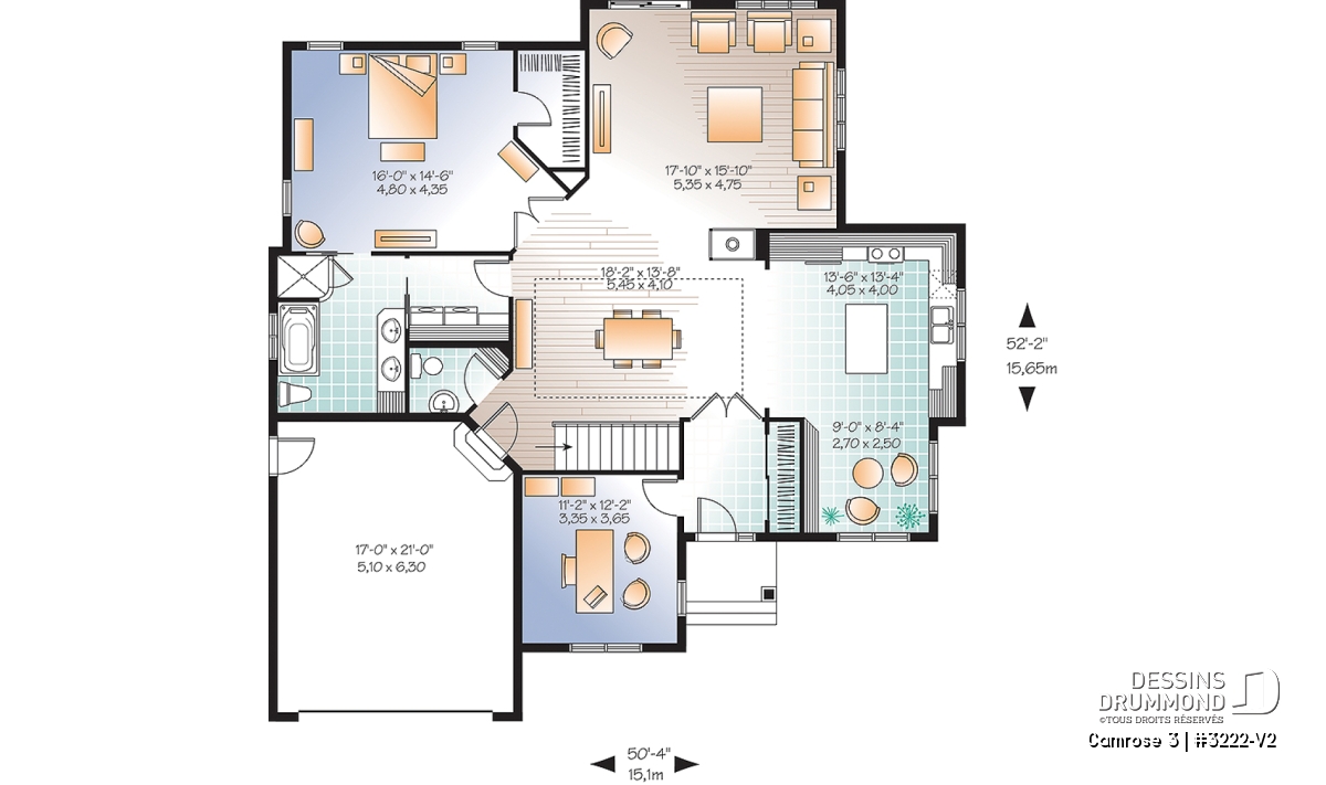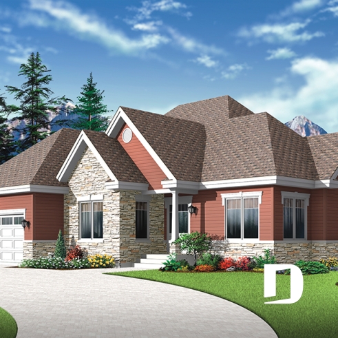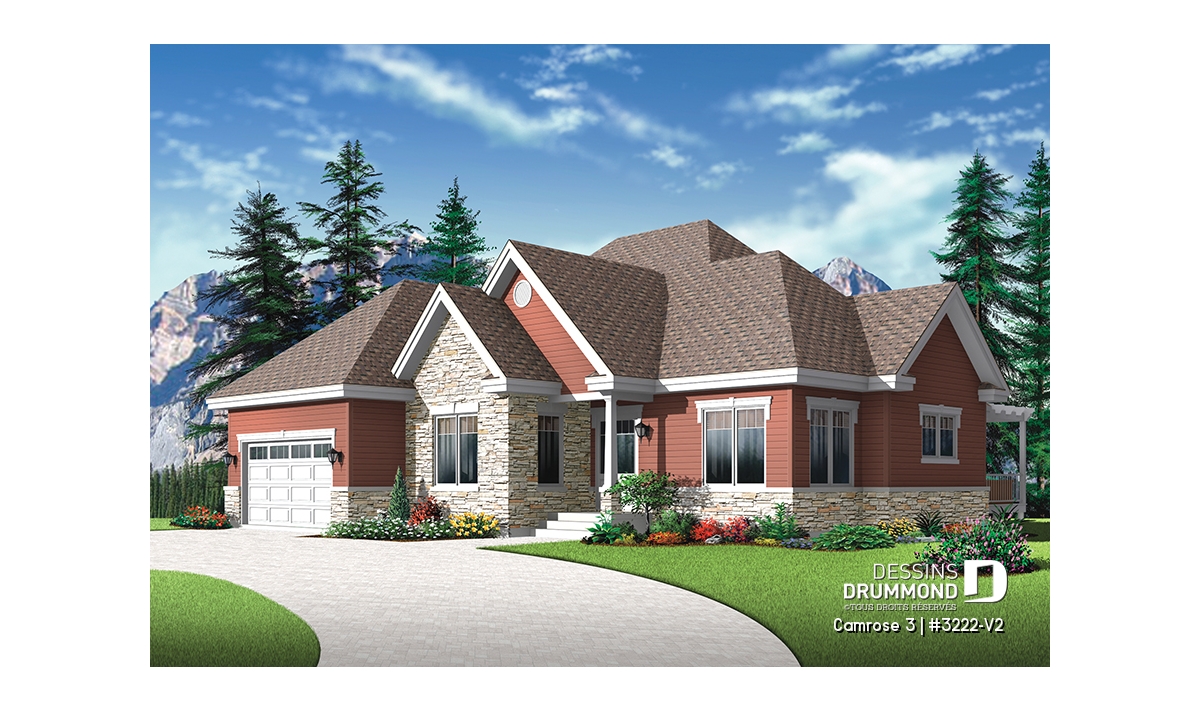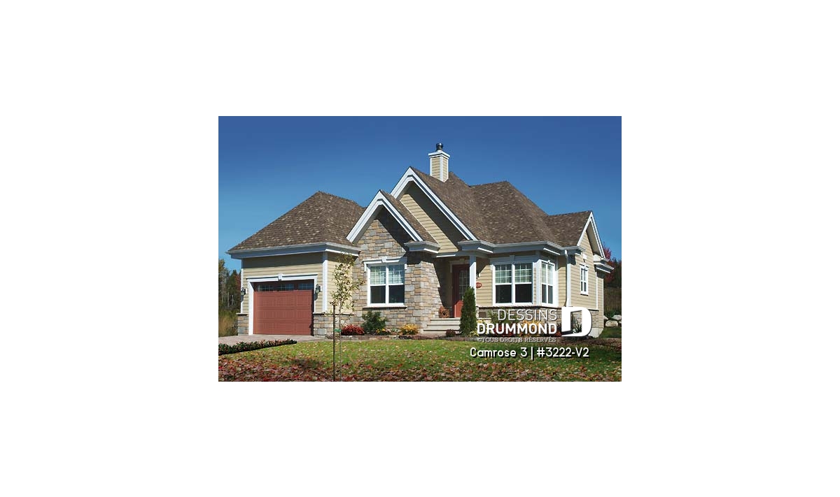 Déjà fort populaire sous le numéro 3222, ce plan de plain-pied offre davantage d’utilités avec la réalisation du premier modèle version 3222-V1 proposant un garage double et un coin buanderie au rez-de-chaussée alors que pour ce 3222-V2, mis à part le garage, toutes les pièces font un gain d’espace et la chambre 1 devient suite des maîtres avec salle de bain privée.