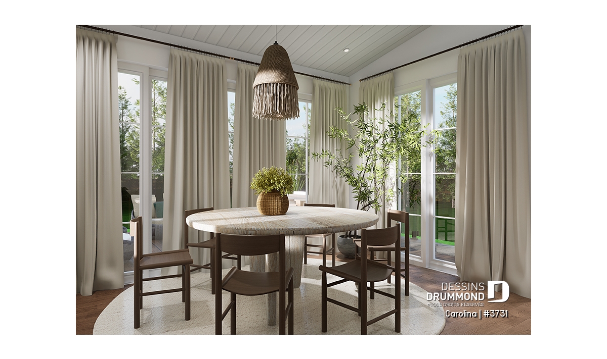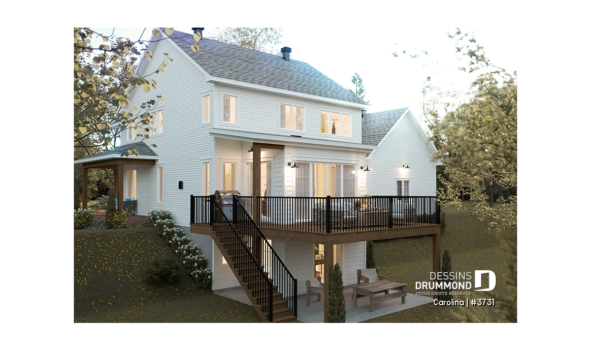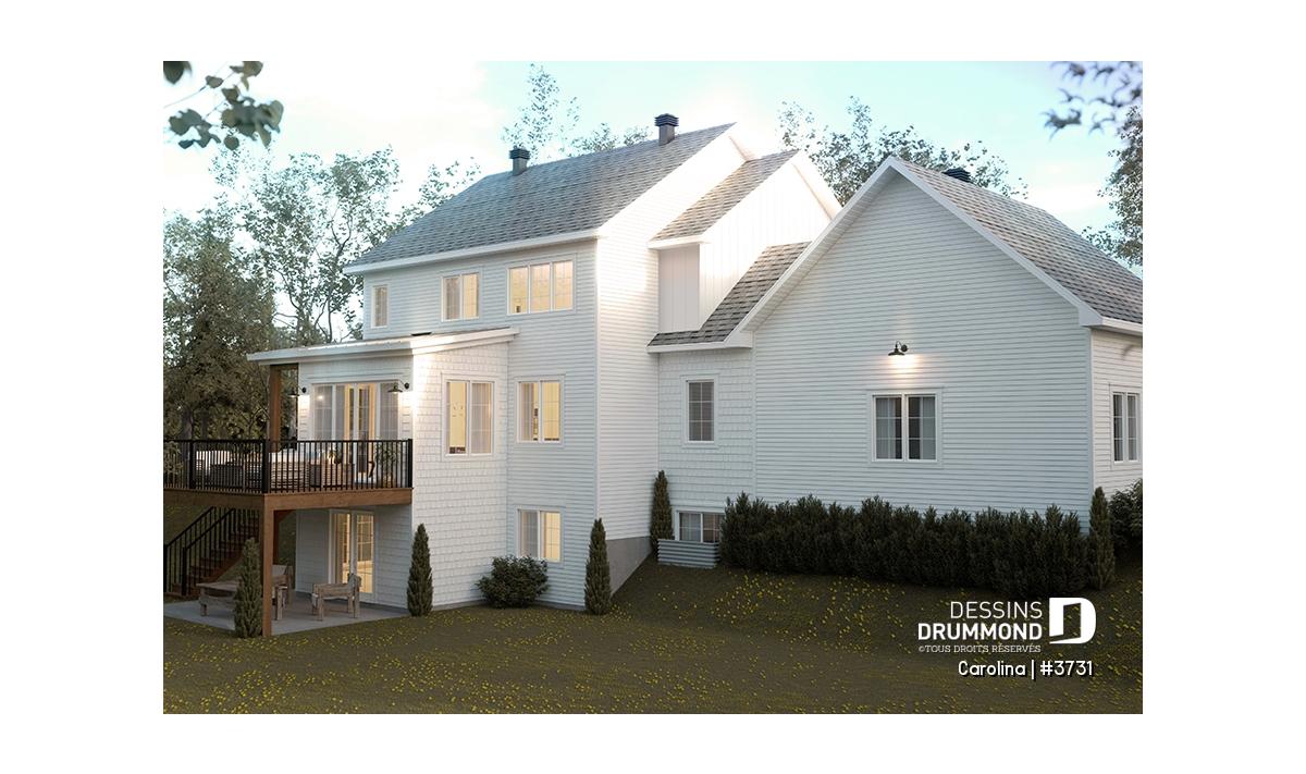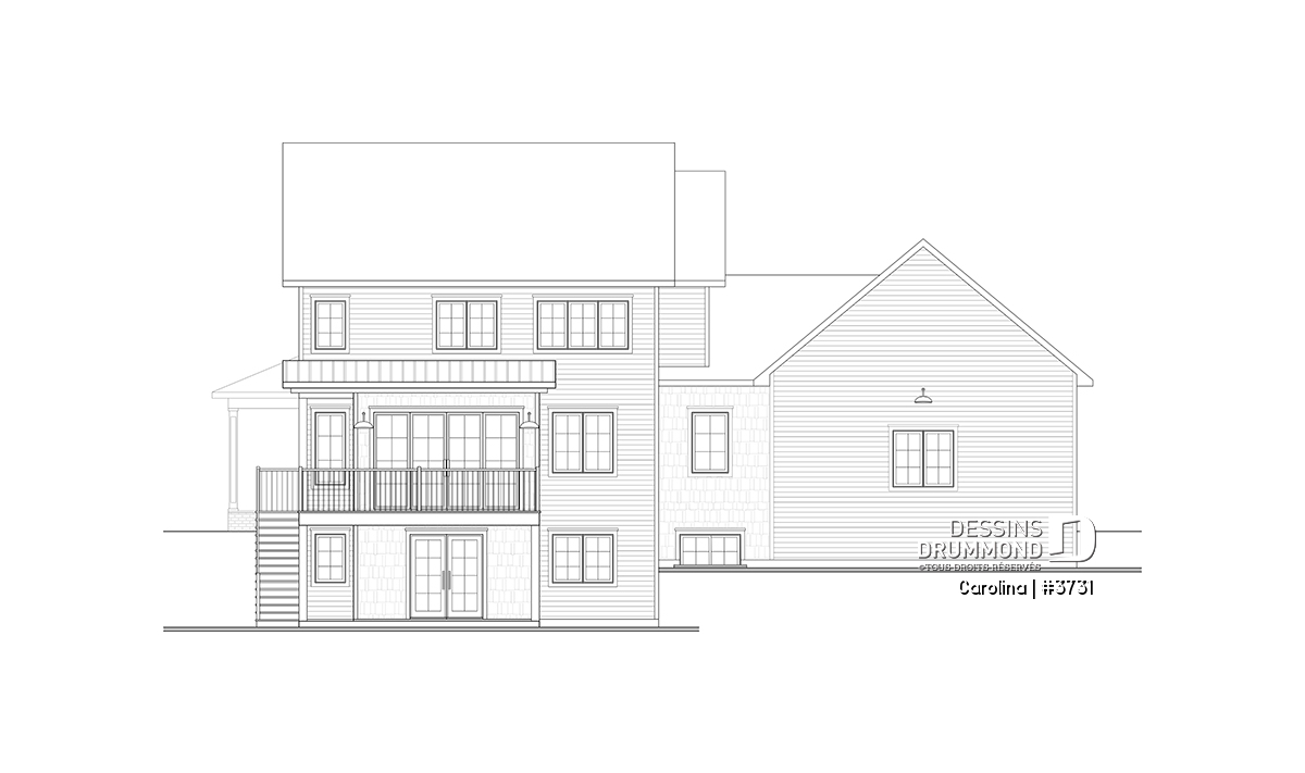 Le plan de maison CAROLINA (#3731) propose un spacieux 3759 pi.ca. de surface habitable, aménagés sur 3 planchers, incluant un rez-de-jardin fini. De plus un garage double est prévu, ainsi que deux terrasses. L'une est abritée et localisée au niveau du rez-de-jardin et l'autre est non couverte et est située au niveau du plancher principale.
