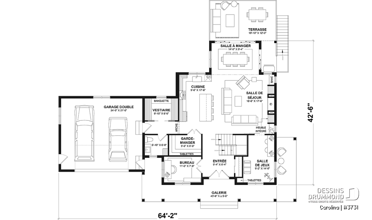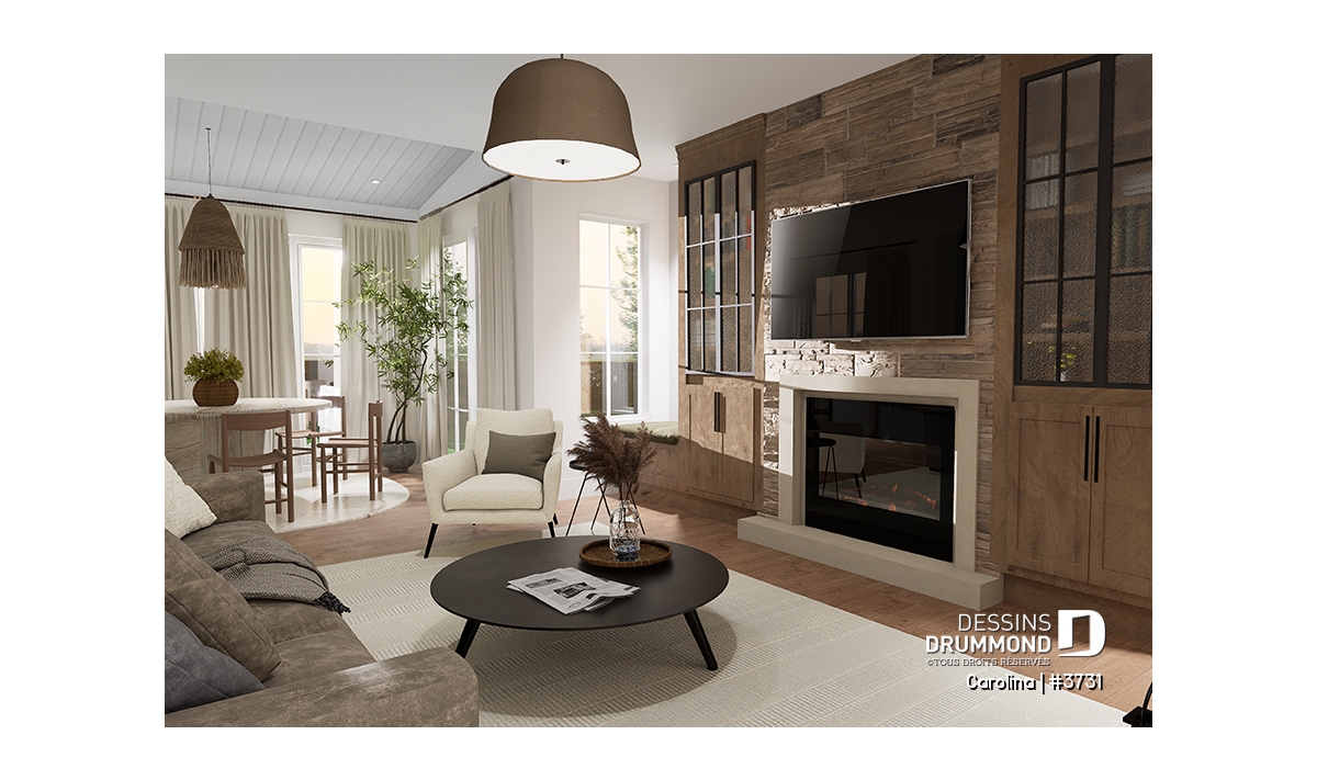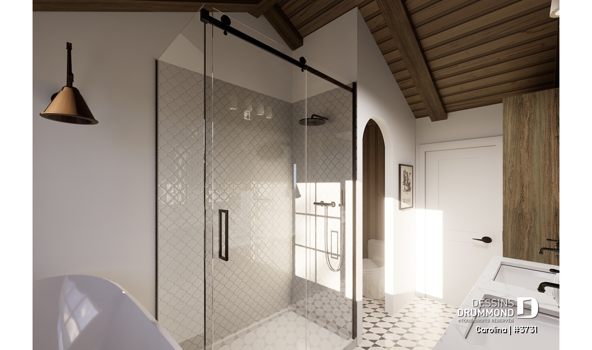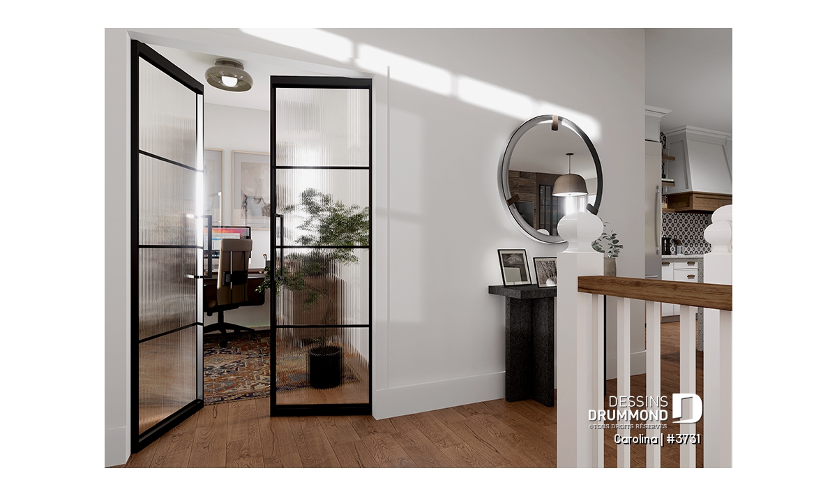 Le plan de maison CAROLINA (#3731) propose un spacieux 3759 pi.ca. de surface habitable, aménagés sur 3 planchers, incluant un rez-de-jardin fini. De plus un garage double est prévu, ainsi que deux terrasses. L'une est abritée et localisée au niveau du rez-de-jardin et l'autre est non couverte et est située au niveau du plancher principale.