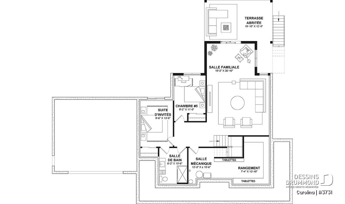 Une suite d'invités prévues au sous-sol, ainsi qu'une chambre additionnelle (chambre #6), une salle familiale et salle mécanique.