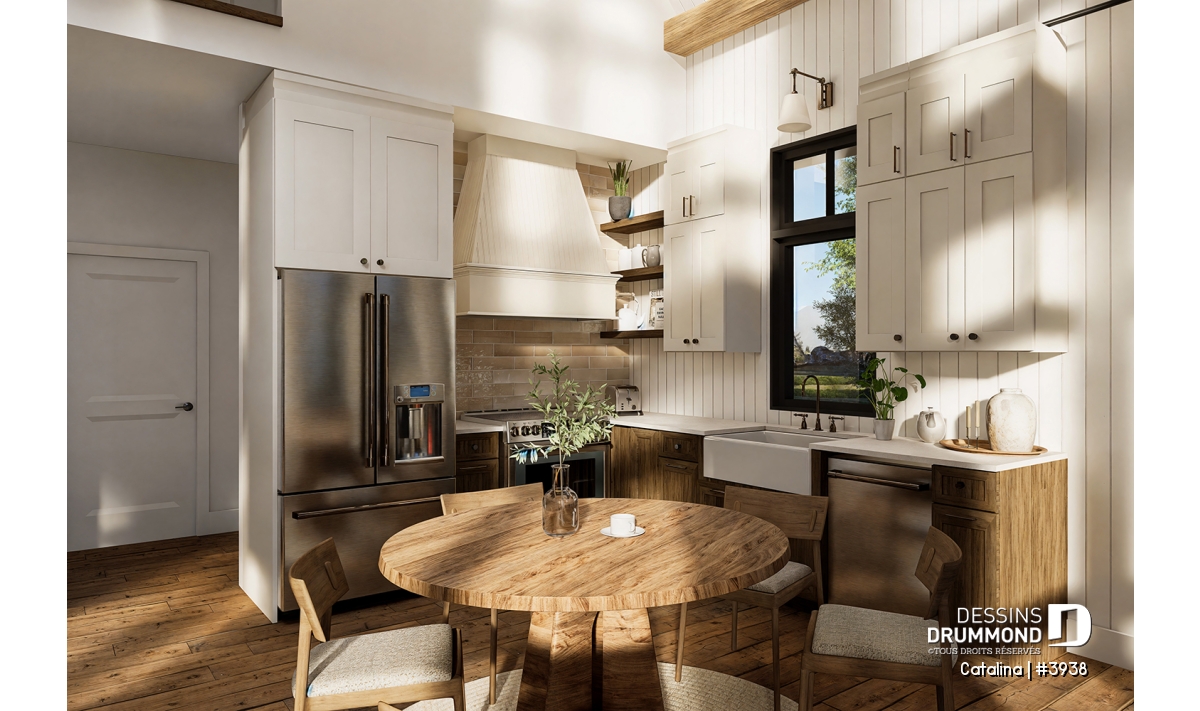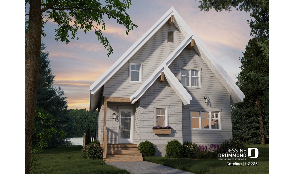 Ce plan de chalet 4 saisons de style rustique a été pensé pour les amoureux de la nature qui souhaitent profiter pleinement de leur environnement en toute période de l’année. Avec son design chaleureux et sa fenestration abondante orientée vers le panorama, il offre une vue imprenable sur le paysage environnant, qu’il s’agisse d’un lac, d’une montagne ou d’une forêt. Son allure authentique et intemporelle en fait un refuge idéal autant pour les vacances que pour la vie quotidienne.