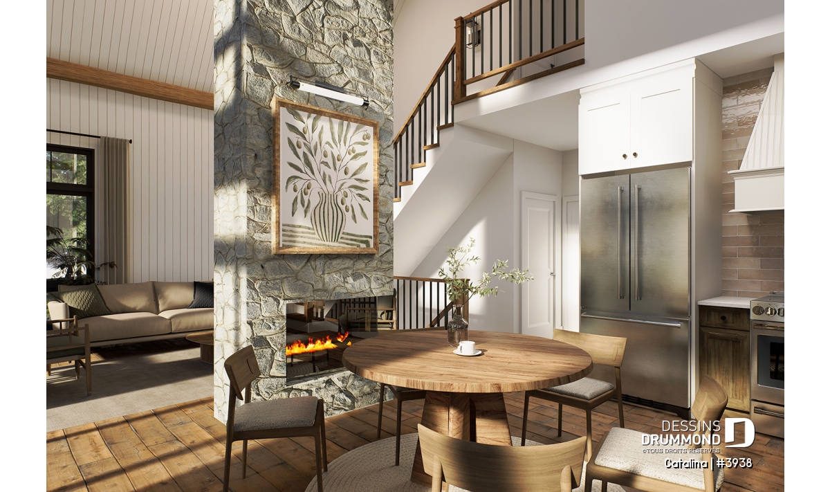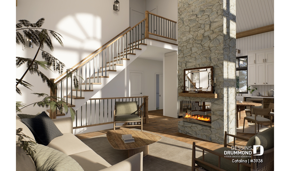 Le tout est sublimé par un foyer central spectaculaire, ouvert sur deux étages, qui devient le cœur de la maison et invite à la détente.
