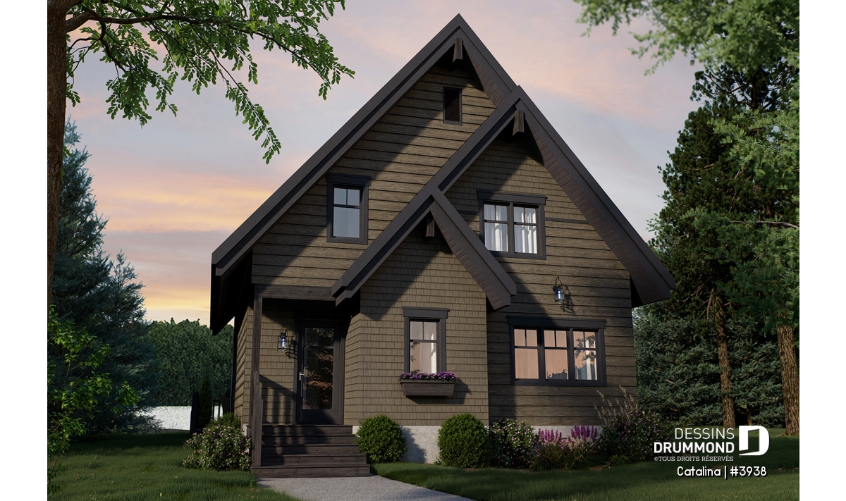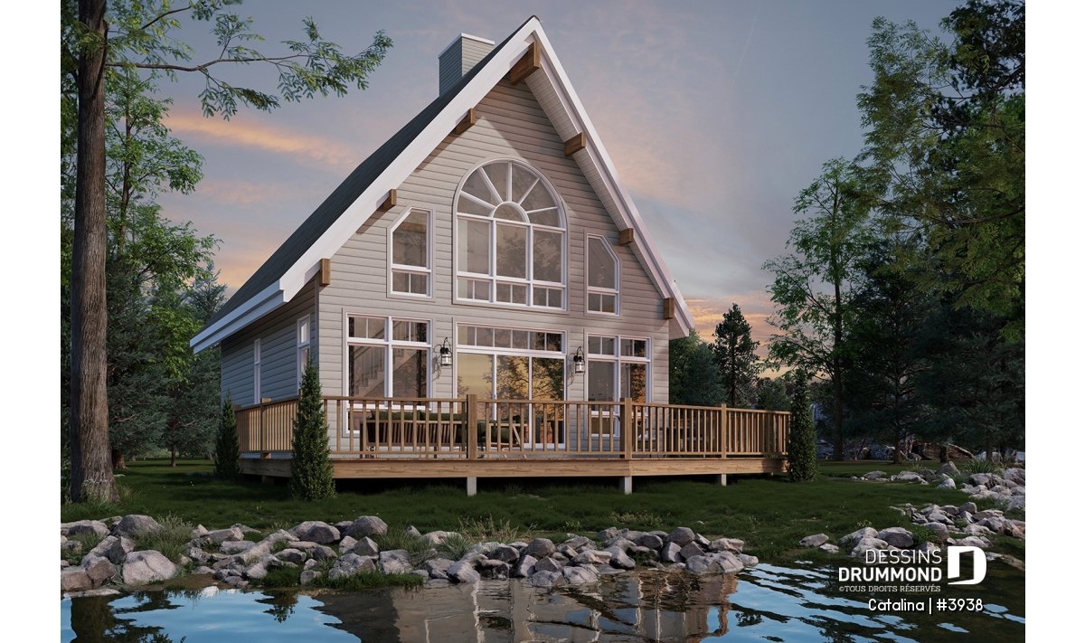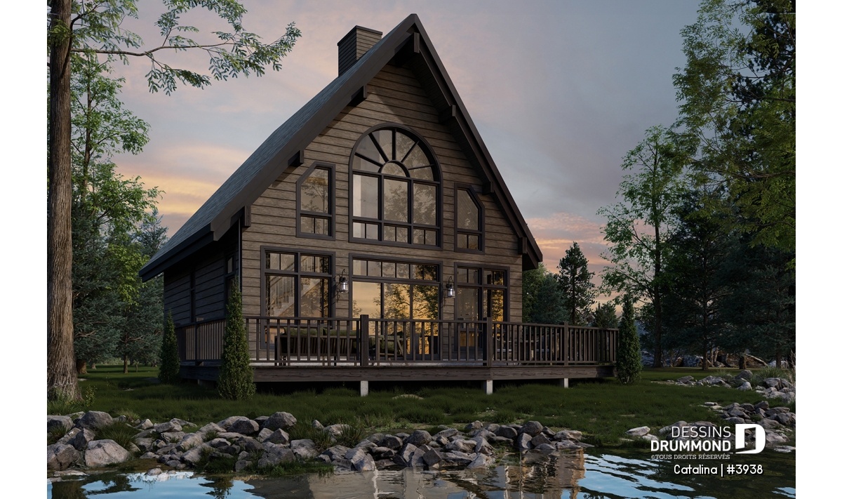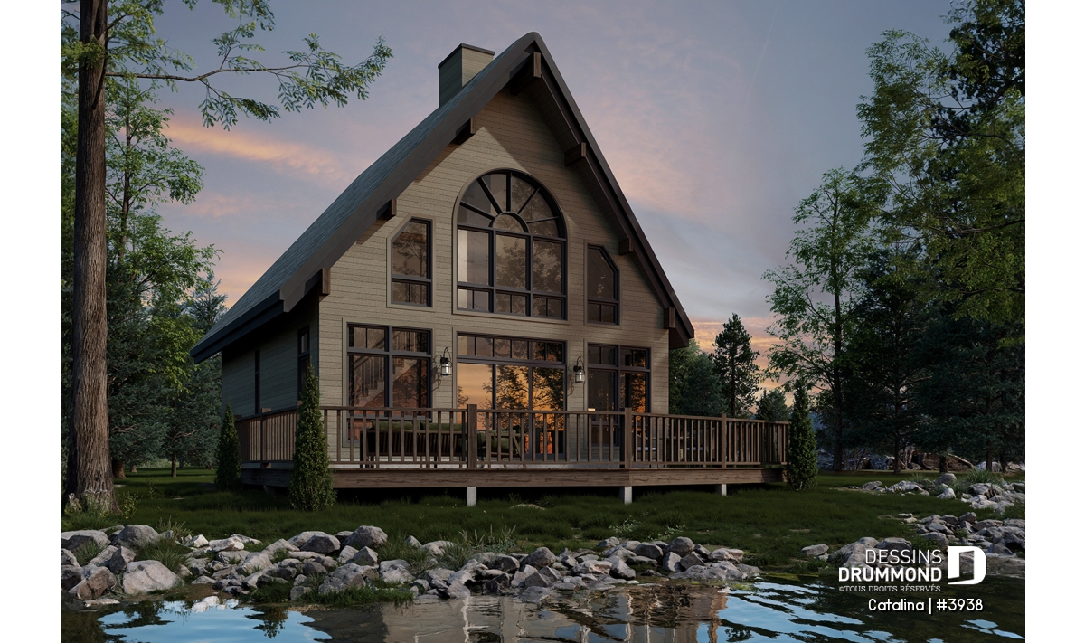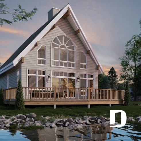 Plan de chalet de type A-frame ( à toit en A ), superbe luminosité, plancher convivial, mezzanine à l'étage
