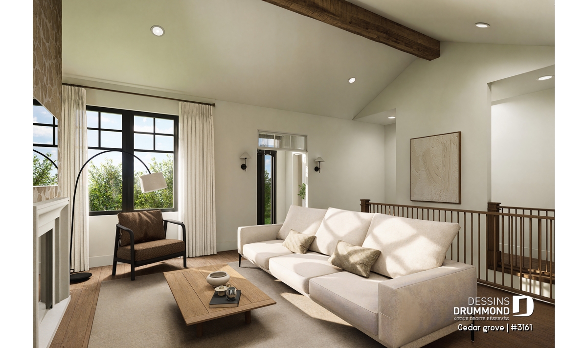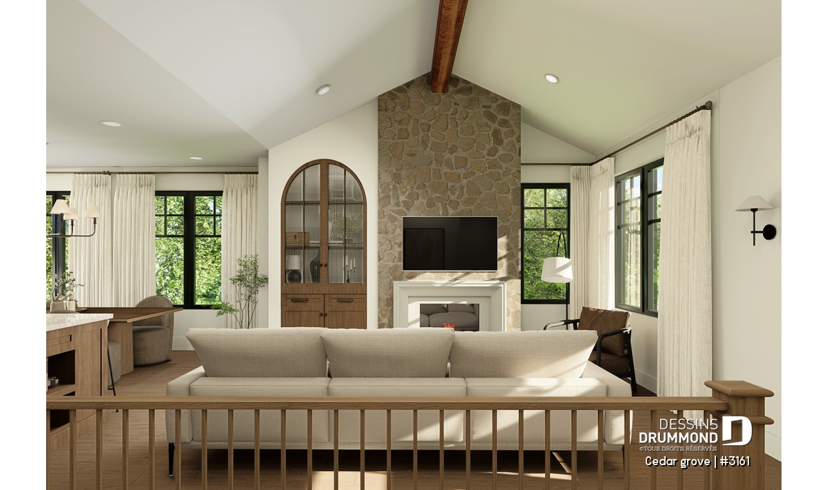 Bel espace décloisonné rassemblant la cuisine et le salon avec la salle à manger attenante. Avec un beau foyer prévu au salon, cet espace commun est idéal pour instaurer une atmosphère chaleureuse et harmonieuse.