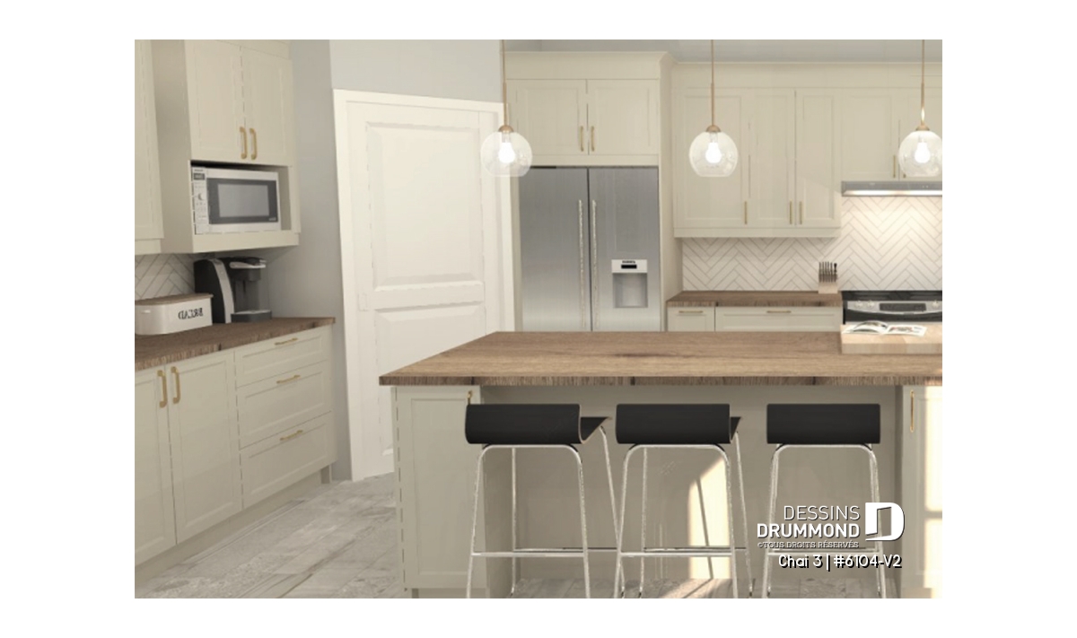 Cuisine avec grand îlot et garde manger de type walk-in.
