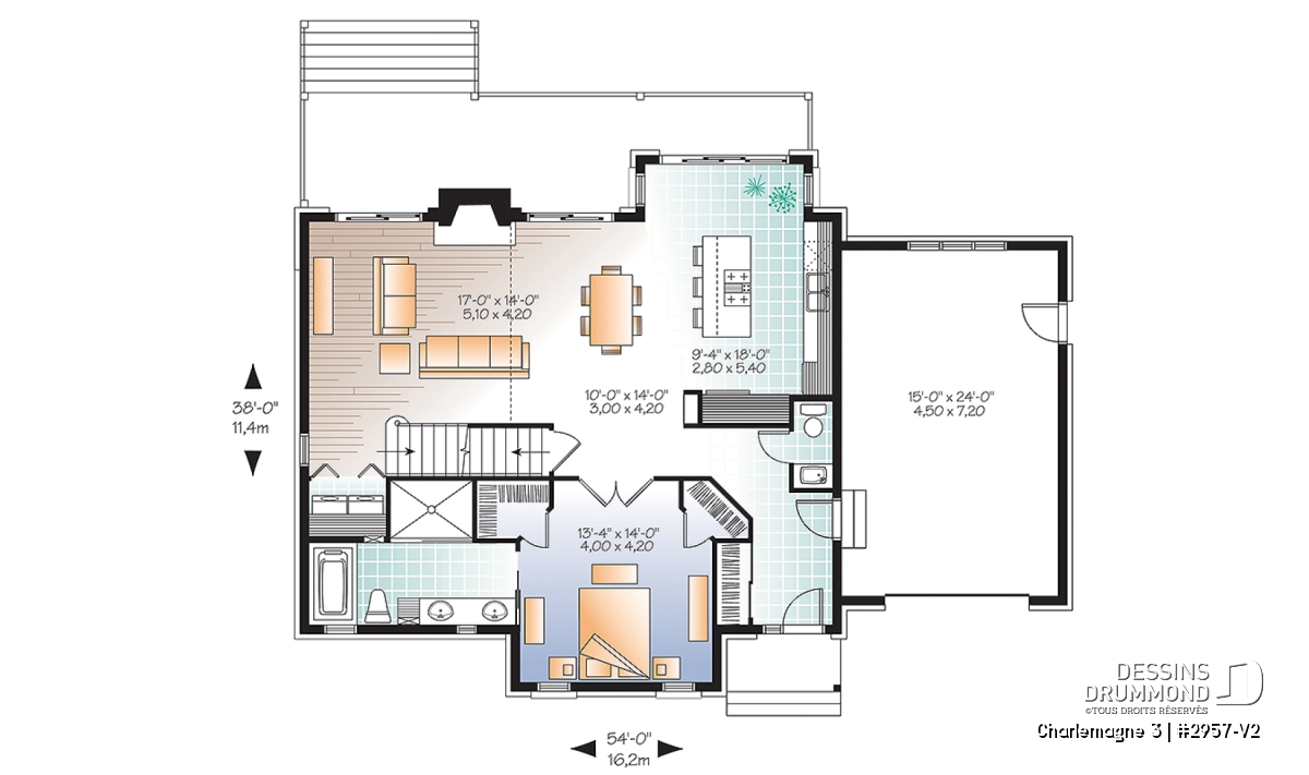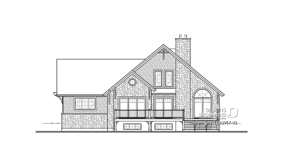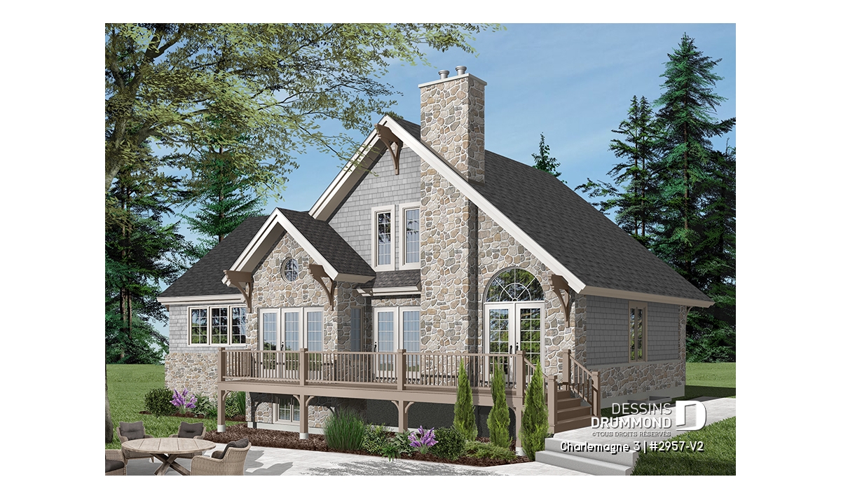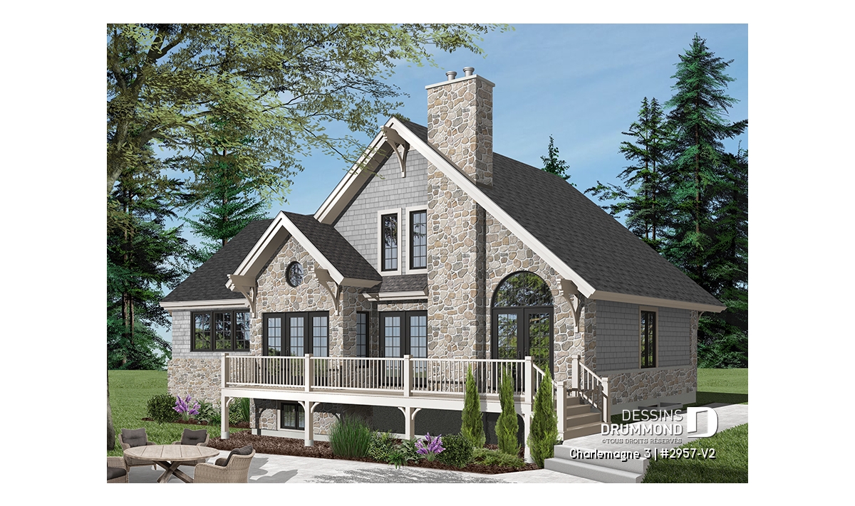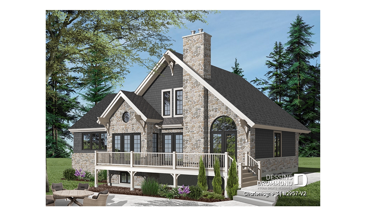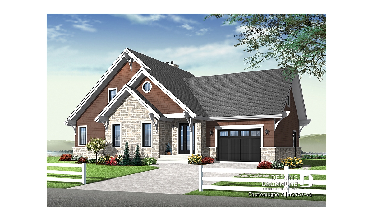 Suite à une demande récurrente visant l’addition d’un garage au populaire chalet 2957 ainsi qu’un rapprochement de la cuisine avec ce nouveau garage, Dessins Drummond vous suggère donc ce « chalet » 2957-V2 avec garage ajouté et intérieur revisité.