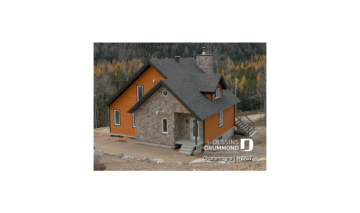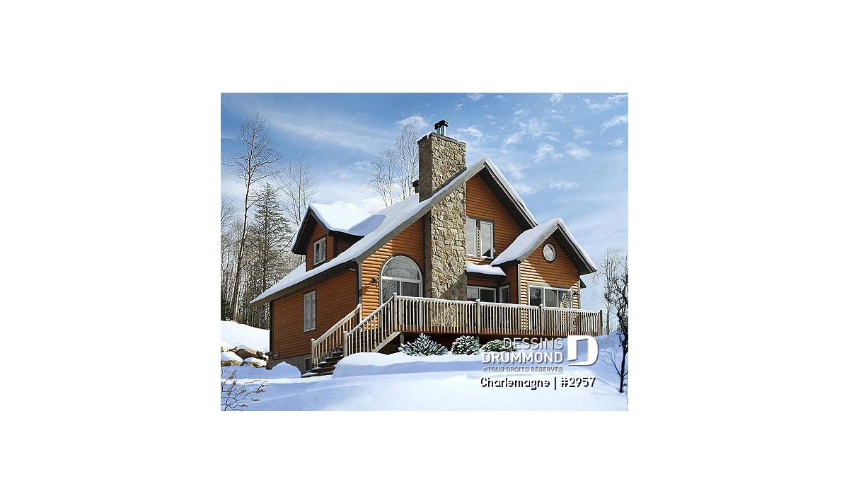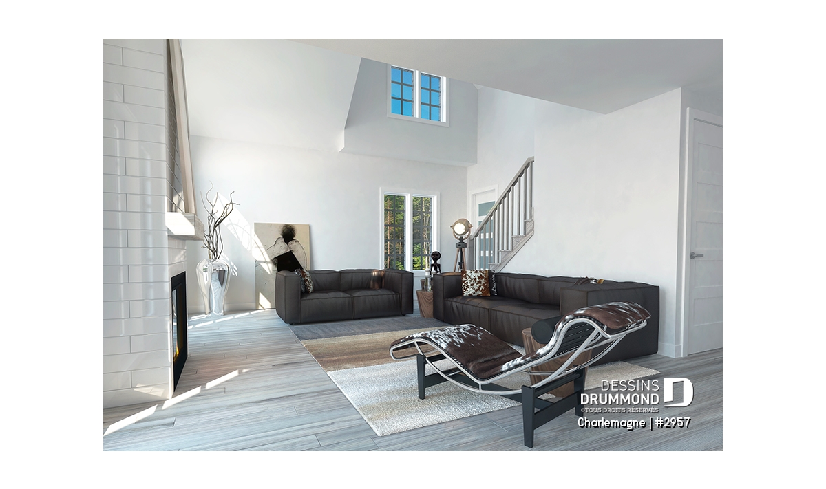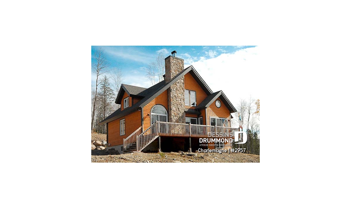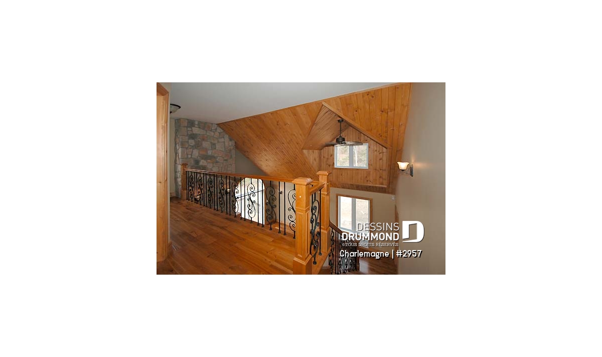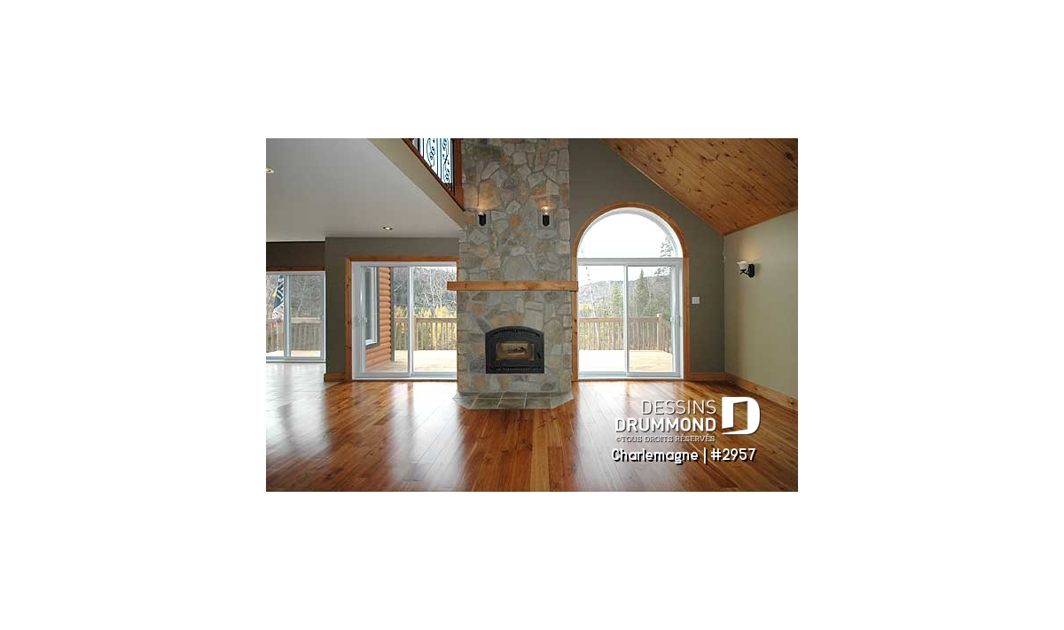 Nous voici dans le vestibule, caractérisé par un grand rangement, indispensable à une telle demeure. Passé celui-ci, un bel espace salle de séjour, un foyer central, des portes françaises et un plafond cathédrale retiennent notre attention en plus de cette lucarne qui alimente de lumière l’escalier. Plus loin, une grande cuisine permet l’insertion d’une table pour au moins six convives avec vue arrière assurée par un volume abondamment fenêtré et en saillie. Toujours sur ce plancher, une chambre des maîtres, avec vue partielle sur l’arrière, bénéficie d’un grand rangement et côtoie une salle de bain complète.