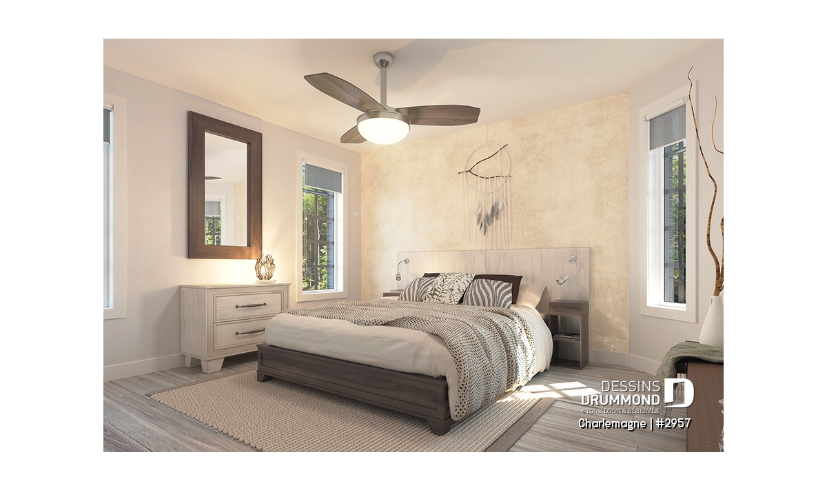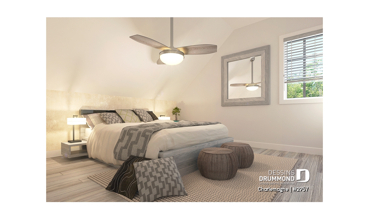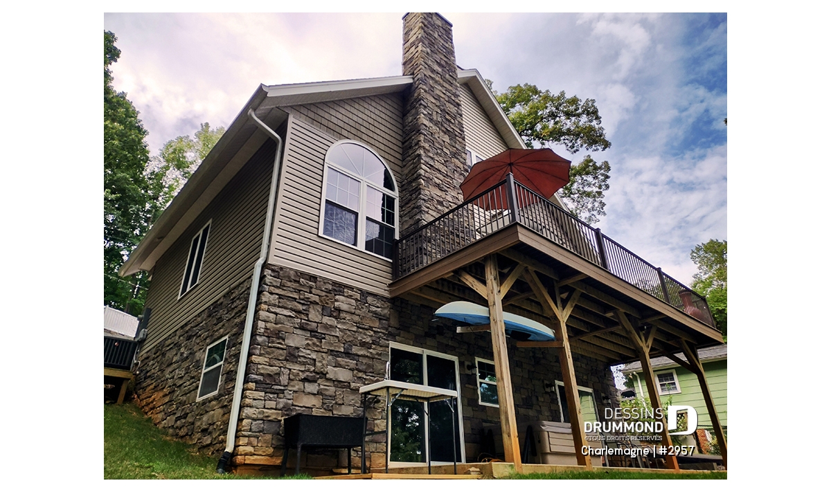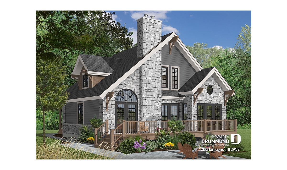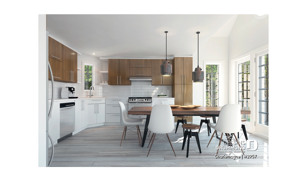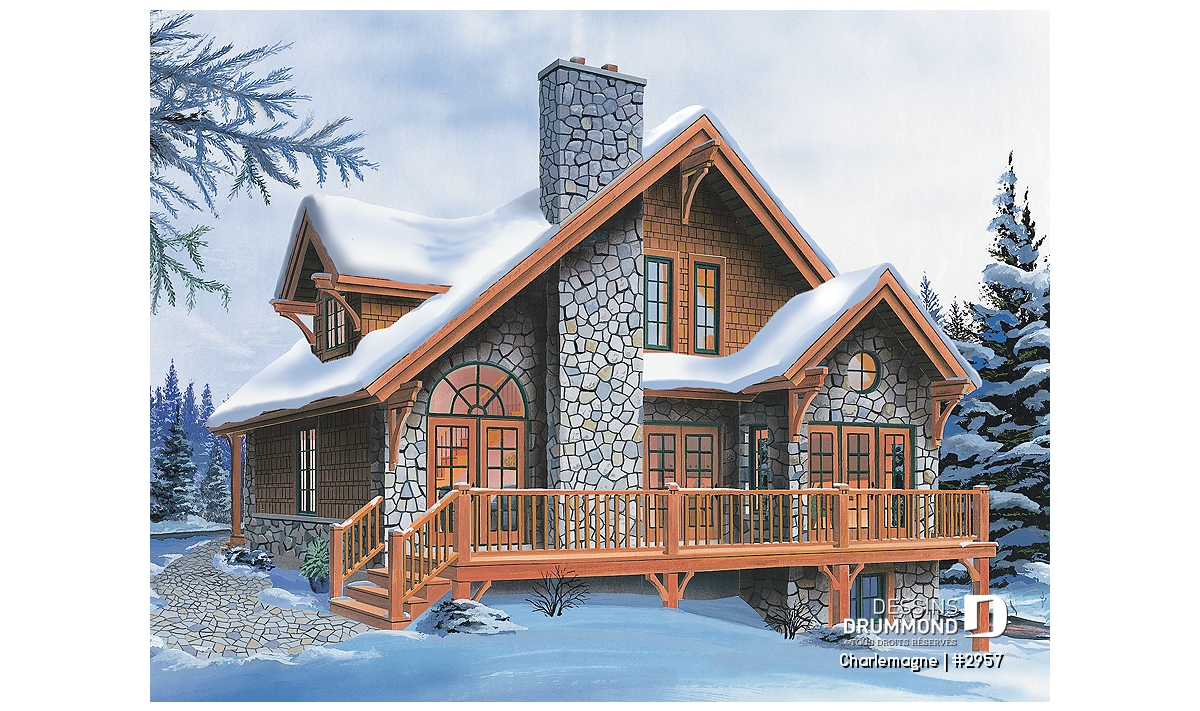 Nous voici dans le vestibule, caractérisé par un grand rangement, indispensable à une telle demeure. Passé celui-ci, un bel espace salle de séjour, un foyer central, des portes françaises et un plafond cathédrale retiennent notre attention en plus de cette lucarne qui alimente de lumière l’escalier. Plus loin, une grande cuisine permet l’insertion d’une table pour au moins six convives avec vue arrière assurée par un volume abondamment fenêtré et en saillie. Toujours sur ce plancher, une chambre des maîtres, avec vue partielle sur l’arrière, bénéficie d’un grand rangement et côtoie une salle de bain complète.