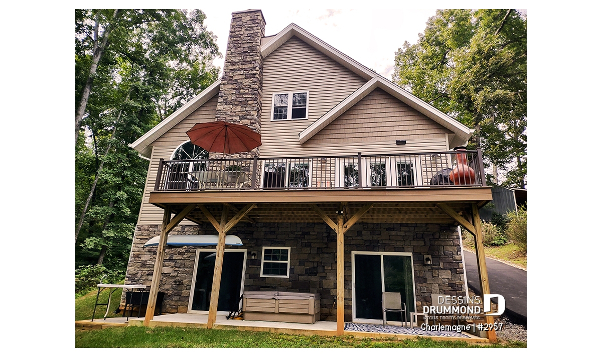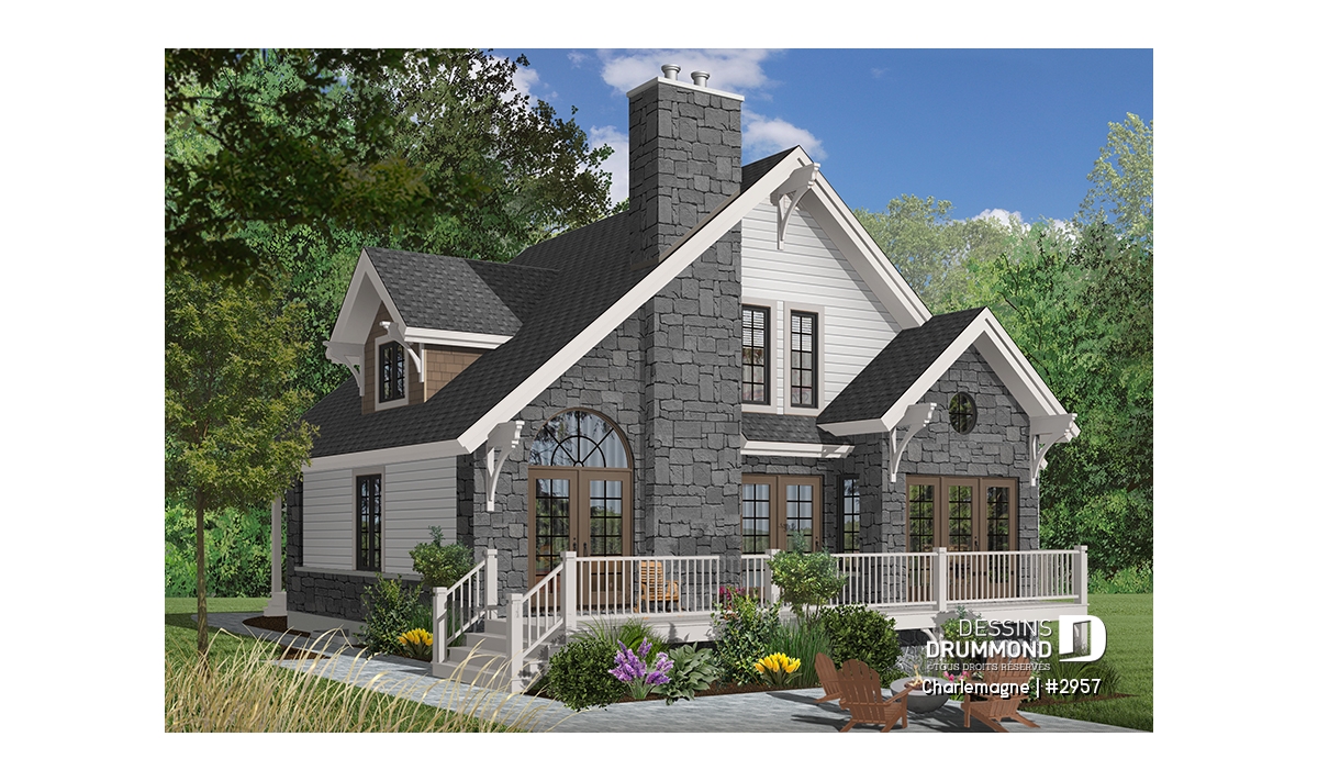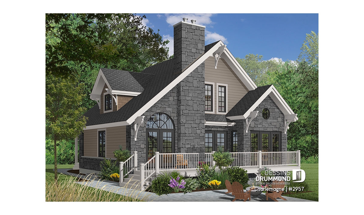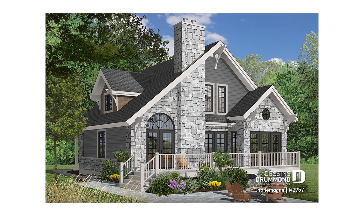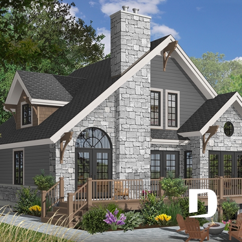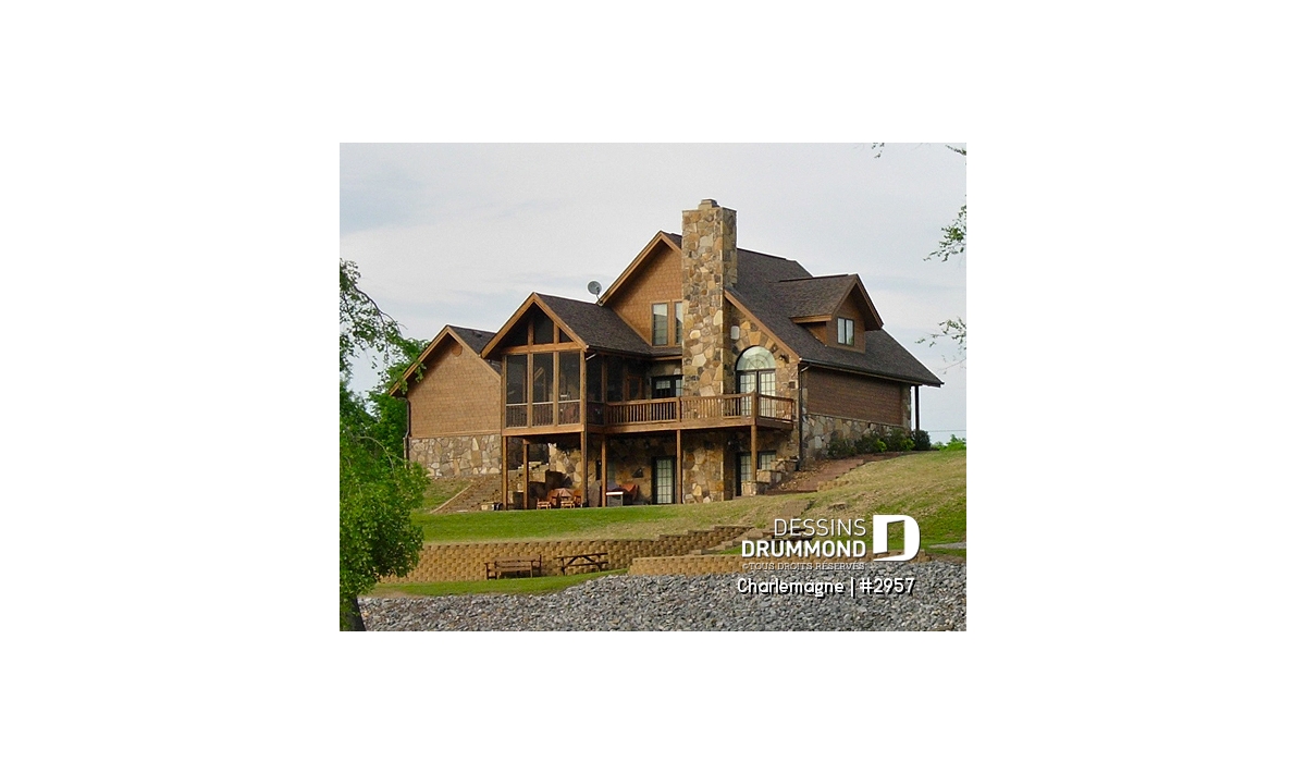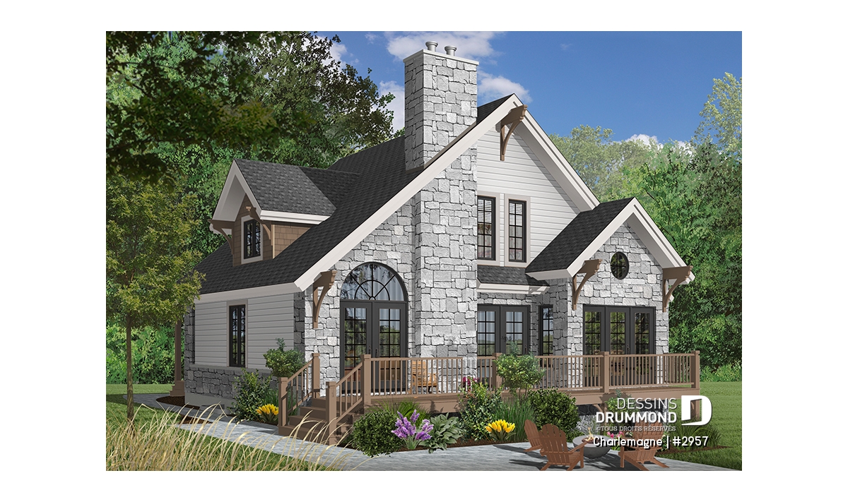 Nous voici dans le vestibule, caractérisé par un grand rangement, indispensable à une telle demeure. Passé celui-ci, un bel espace salle de séjour, un foyer central, des portes françaises et un plafond cathédrale retiennent notre attention en plus de cette lucarne qui alimente de lumière l’escalier. Plus loin, une grande cuisine permet l’insertion d’une table pour au moins six convives avec vue arrière assurée par un volume abondamment fenêtré et en saillie. Toujours sur ce plancher, une chambre des maîtres, avec vue partielle sur l’arrière, bénéficie d’un grand rangement et côtoie une salle de bain complète.