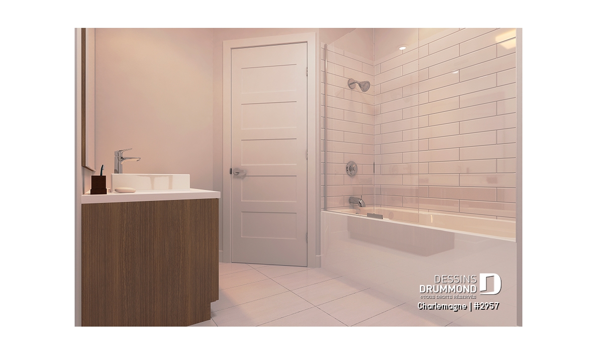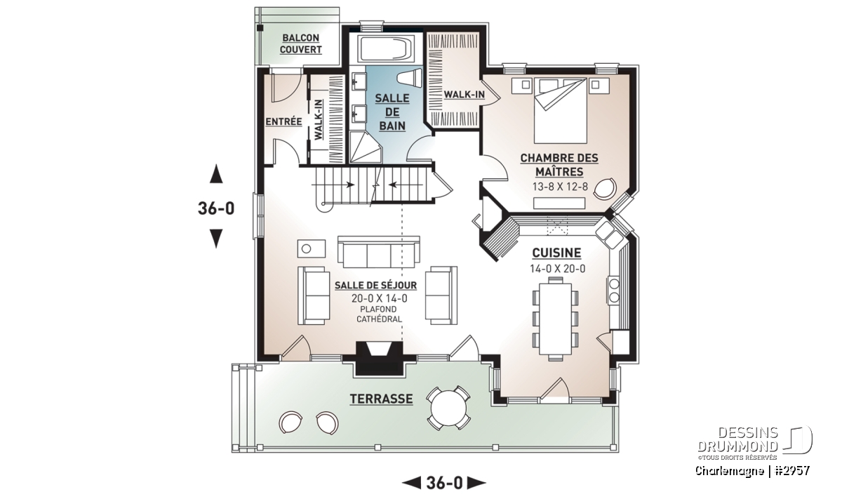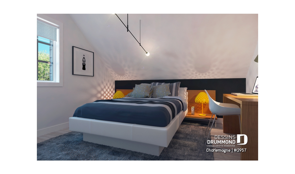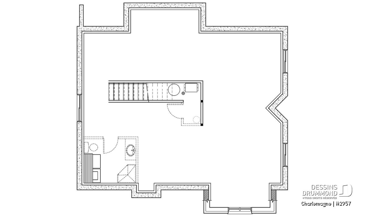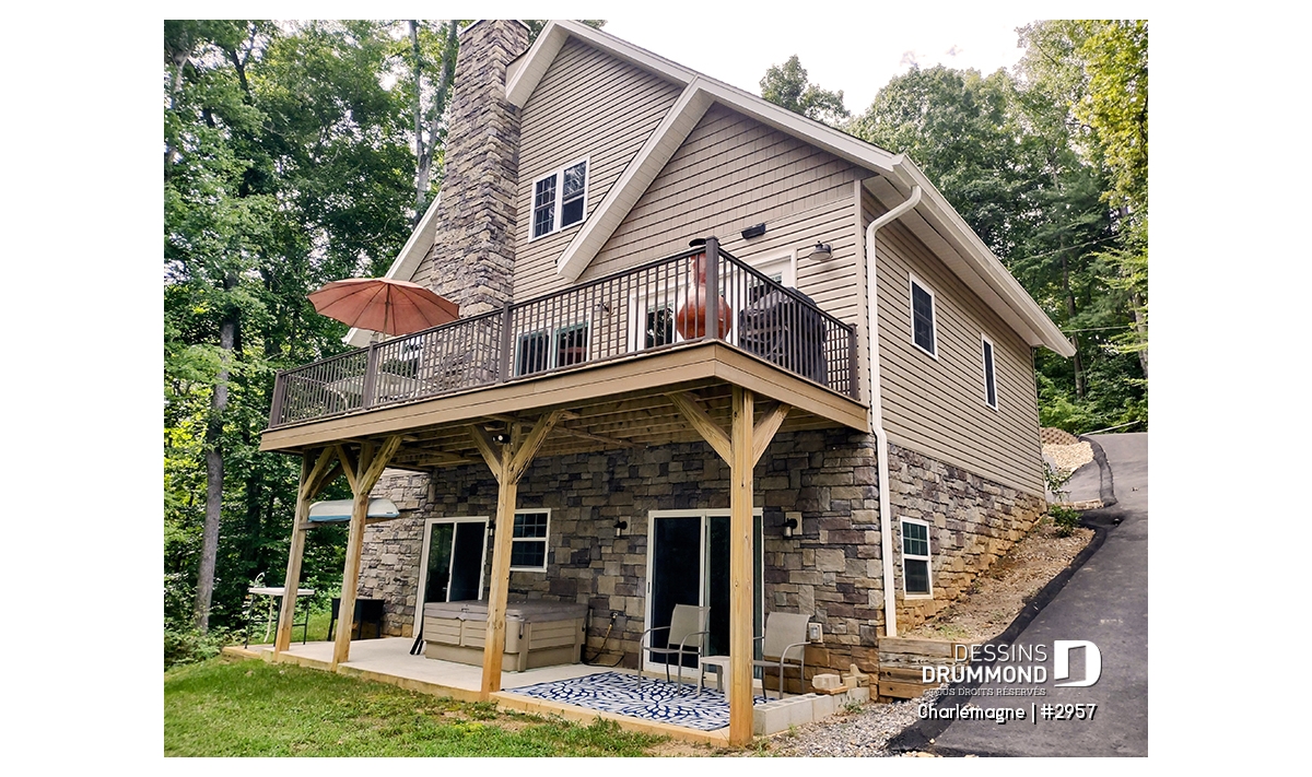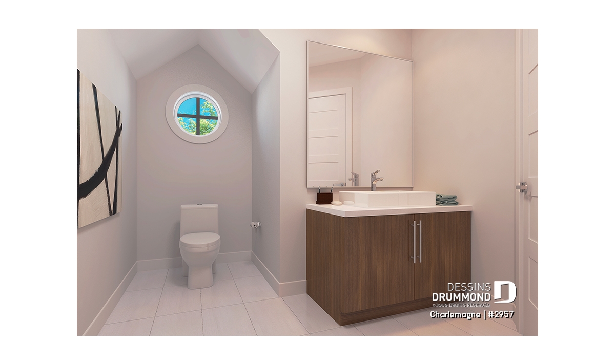 Nous voici dans le vestibule, caractérisé par un grand rangement, indispensable à une telle demeure. Passé celui-ci, un bel espace salle de séjour, un foyer central, des portes françaises et un plafond cathédrale retiennent notre attention en plus de cette lucarne qui alimente de lumière l’escalier. Plus loin, une grande cuisine permet l’insertion d’une table pour au moins six convives avec vue arrière assurée par un volume abondamment fenêtré et en saillie. Toujours sur ce plancher, une chambre des maîtres, avec vue partielle sur l’arrière, bénéficie d’un grand rangement et côtoie une salle de bain complète.