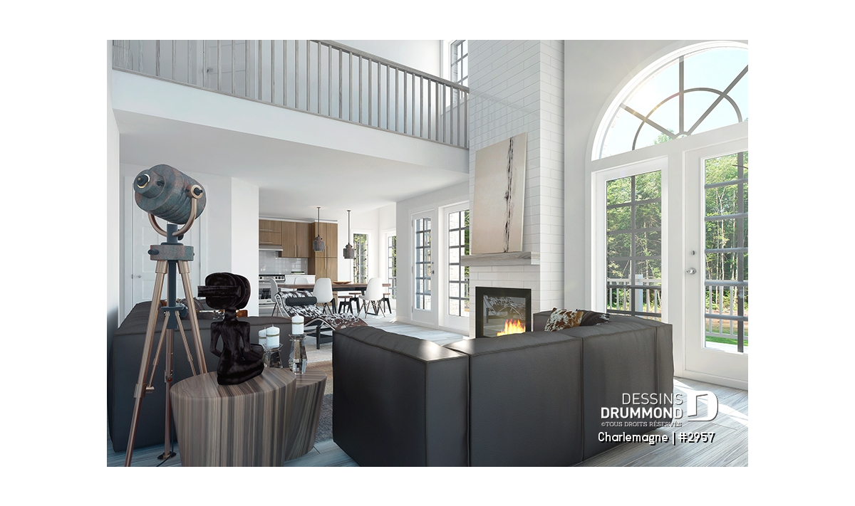 Salle de séjour remarquable avec plafond cathédrale, mezzanine, foyer et fenêtrage abondant.