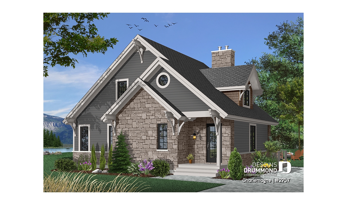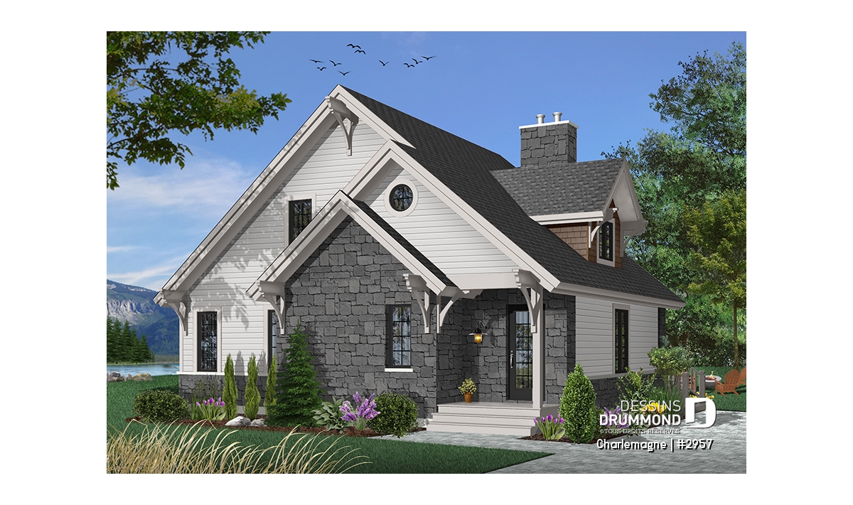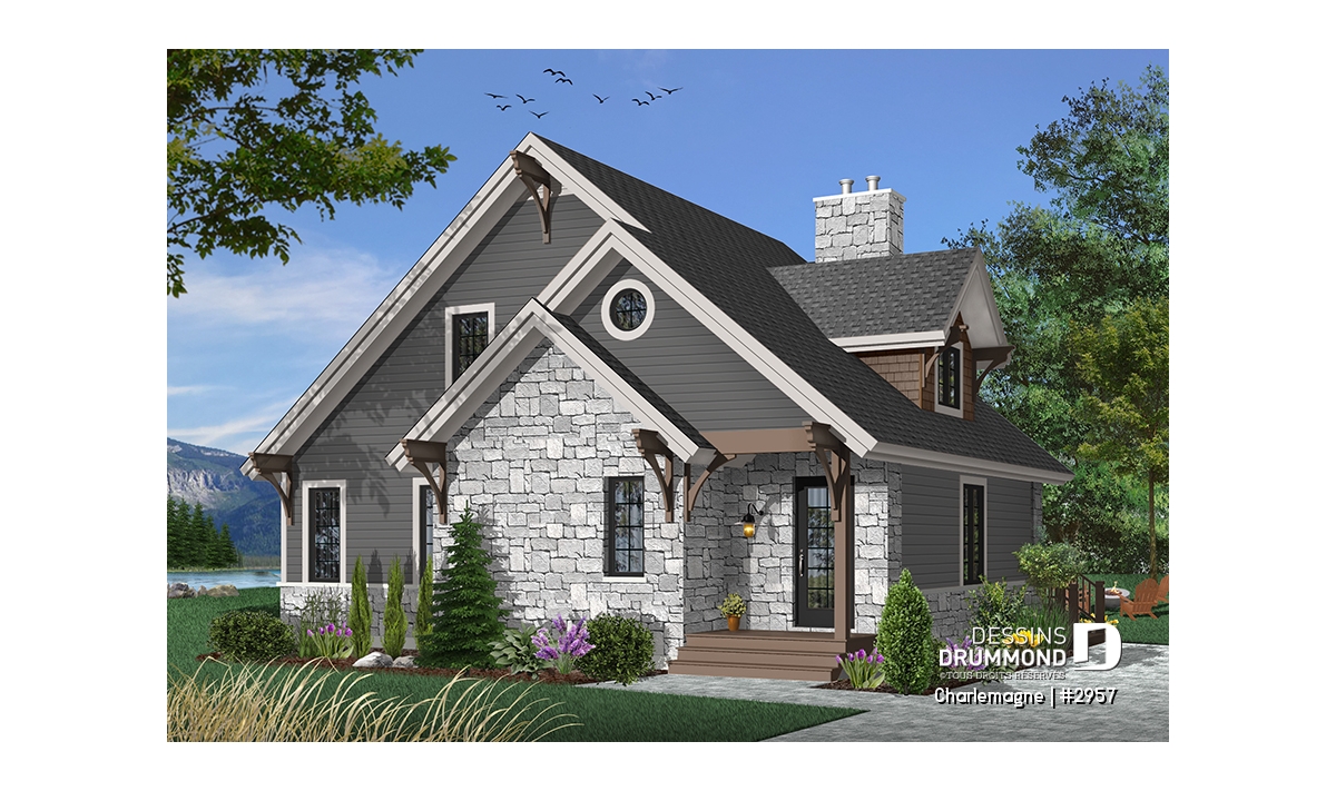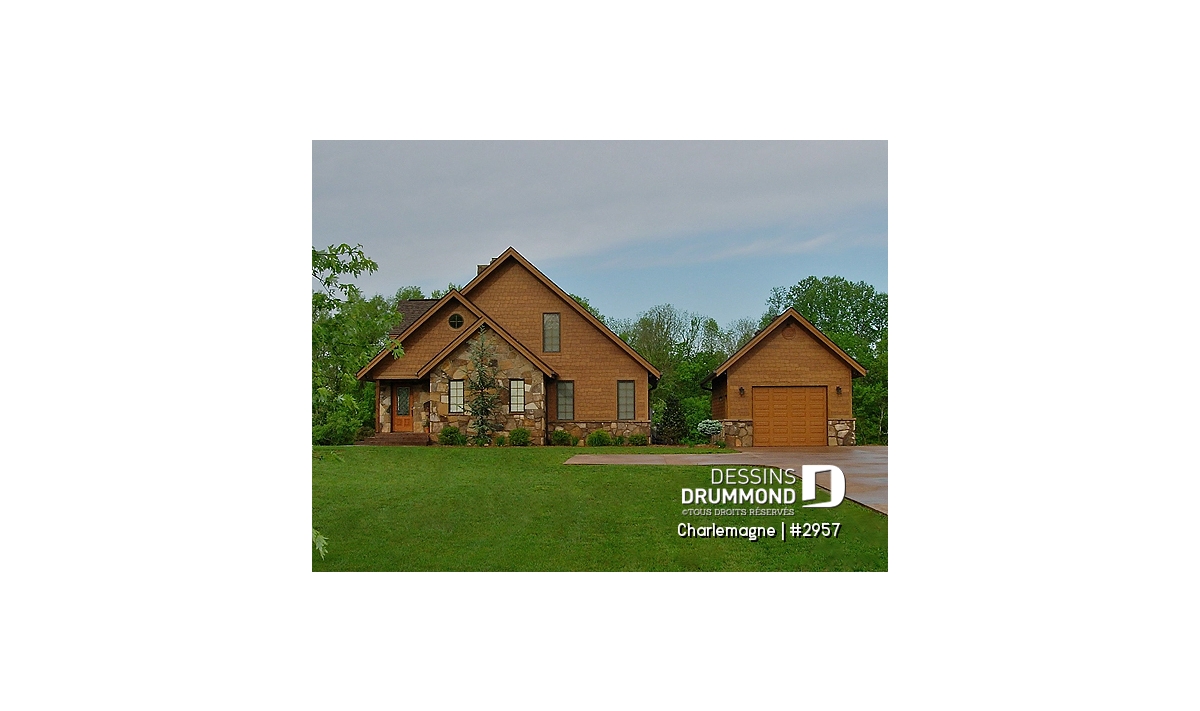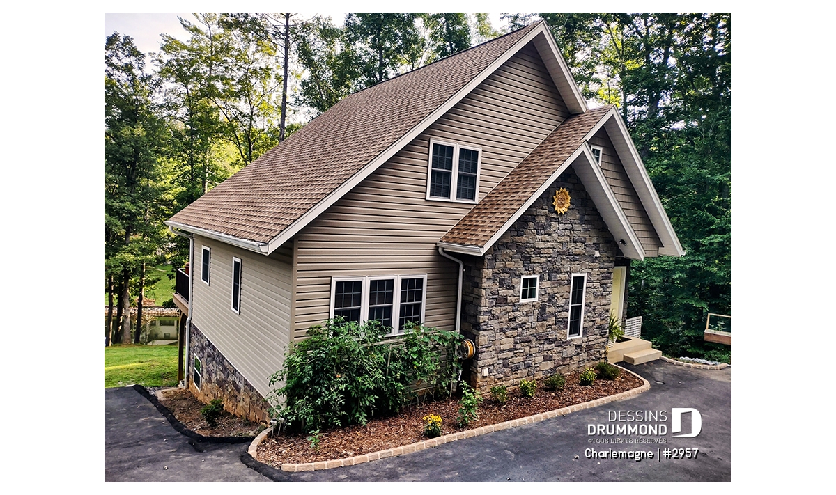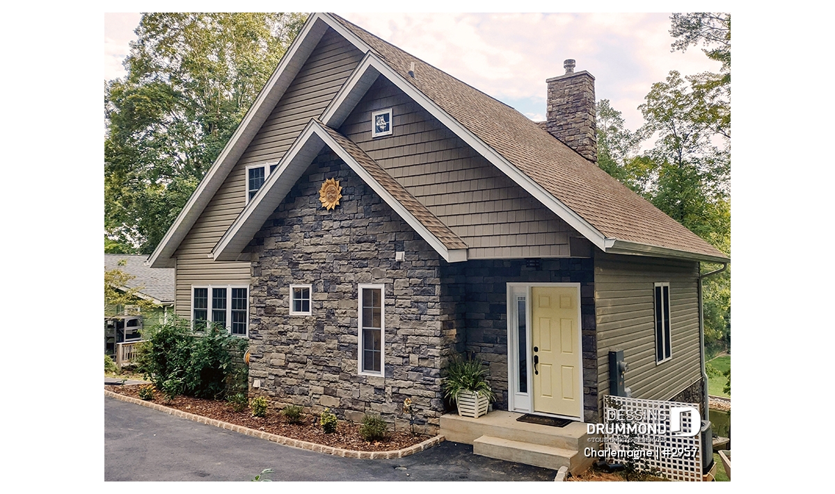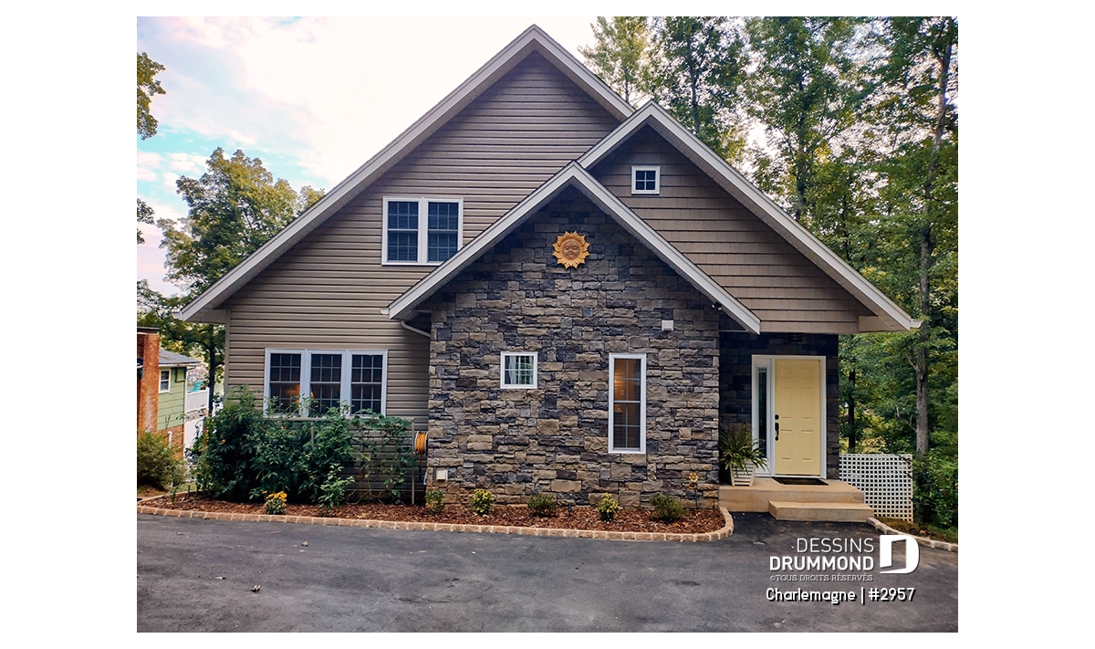 Maison idéale, se voulant chaleureuse à souhait et véritablement pas avare de fenêtres tout en proposant un mariage heureux des matériaux, des pentes de toit, des moulures et des équerres décoratives. Entrons donc sans plus tarder.