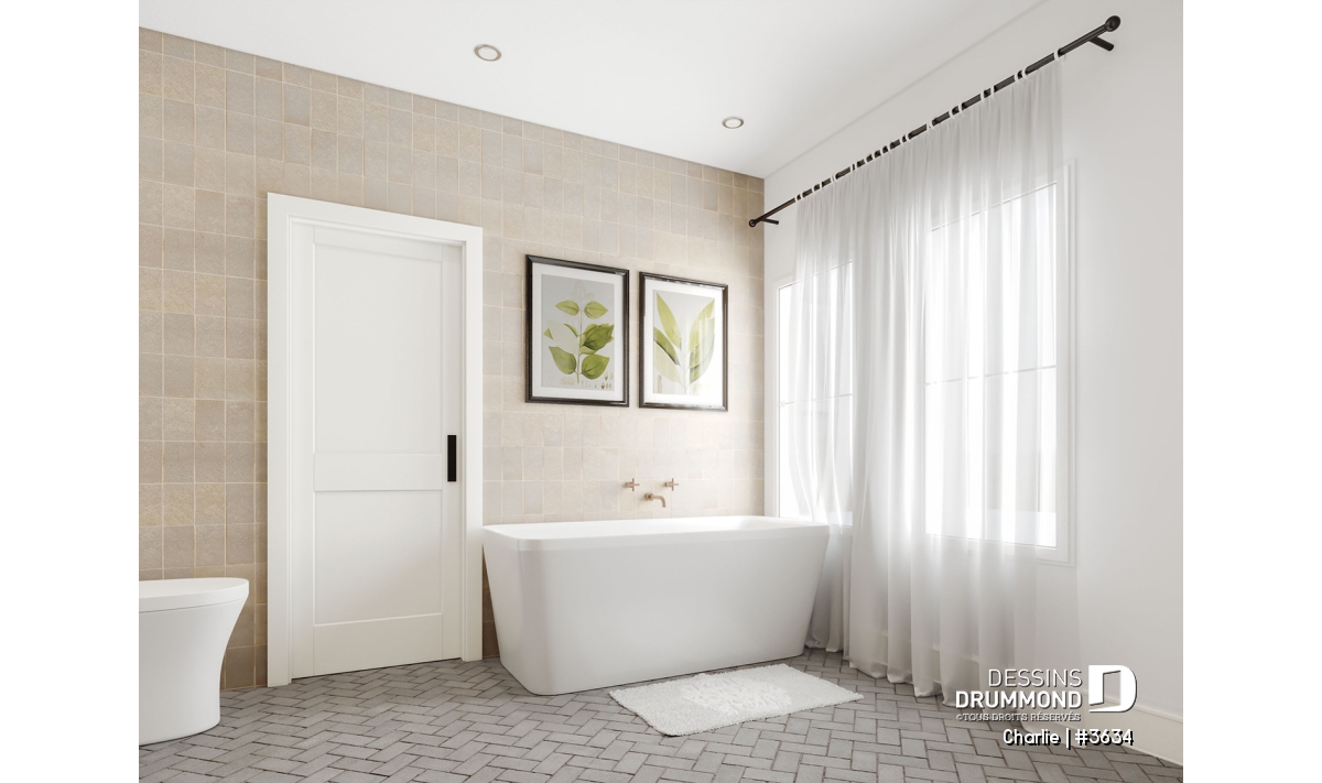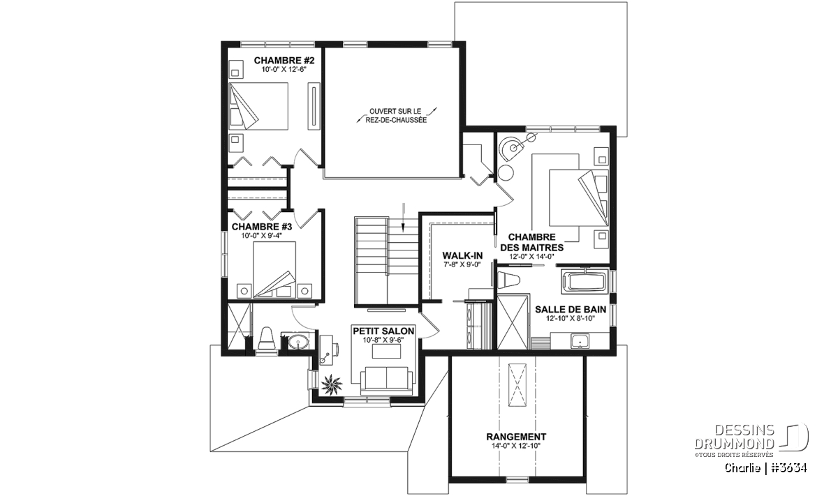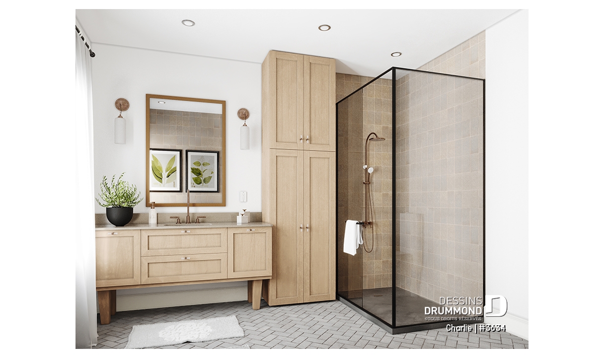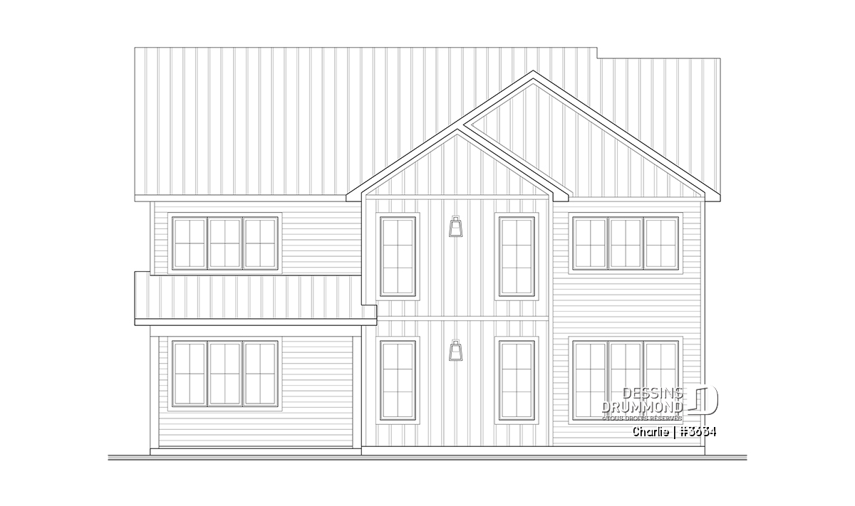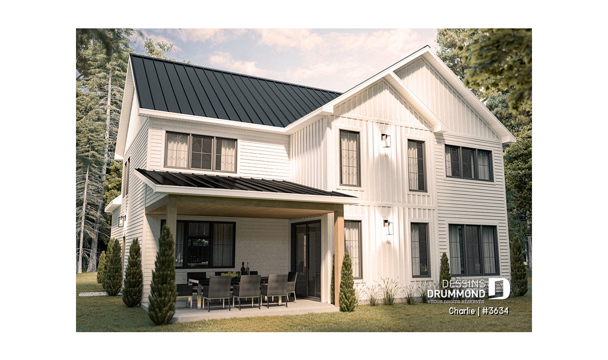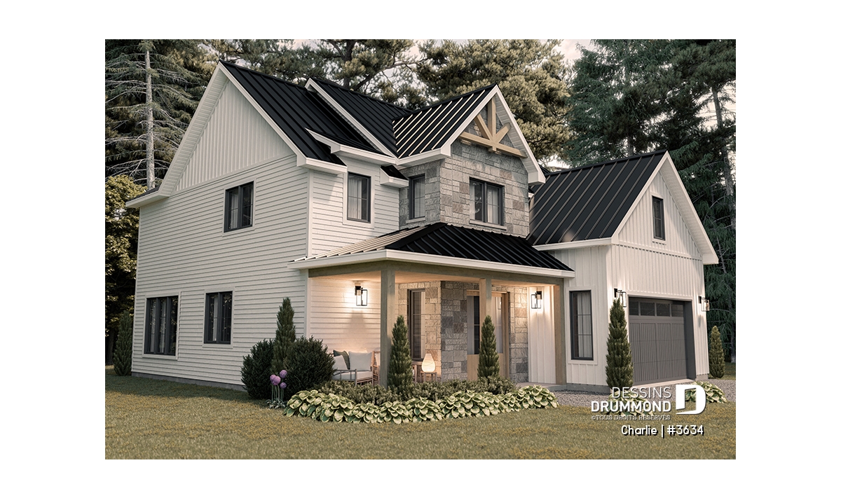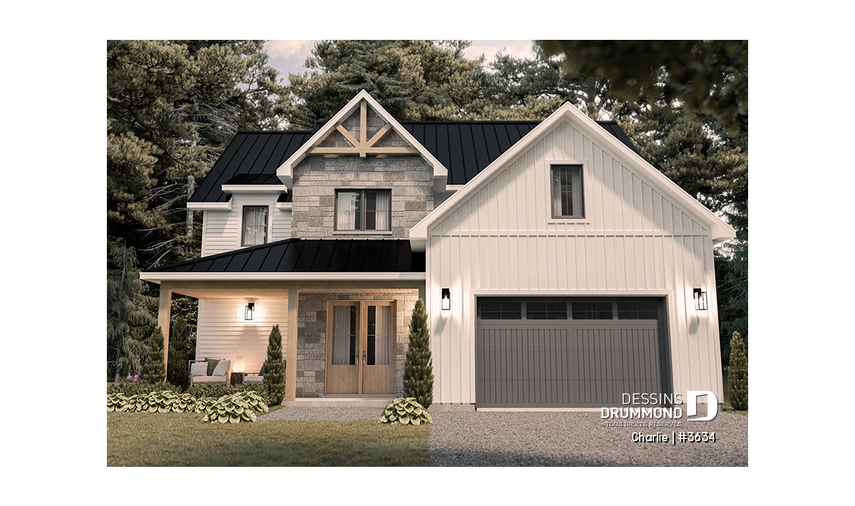 Côté pratique, la maison propose un rangement supplémentaire au-dessus du garage, accessible par trappe, ainsi qu’un garage spacieux qui peut accueillir un coin atelier ou jardinage. Enfin, ce plan s’adapte à vos besoins grâce à plusieurs options de fondation disponibles.