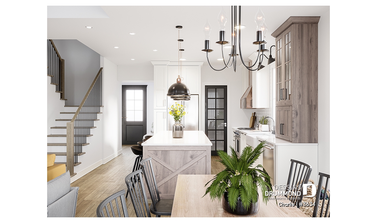 Cuisine avec garde-manger, ouverte sur la salle à dîner et le salon pour une ambiance conviviale.