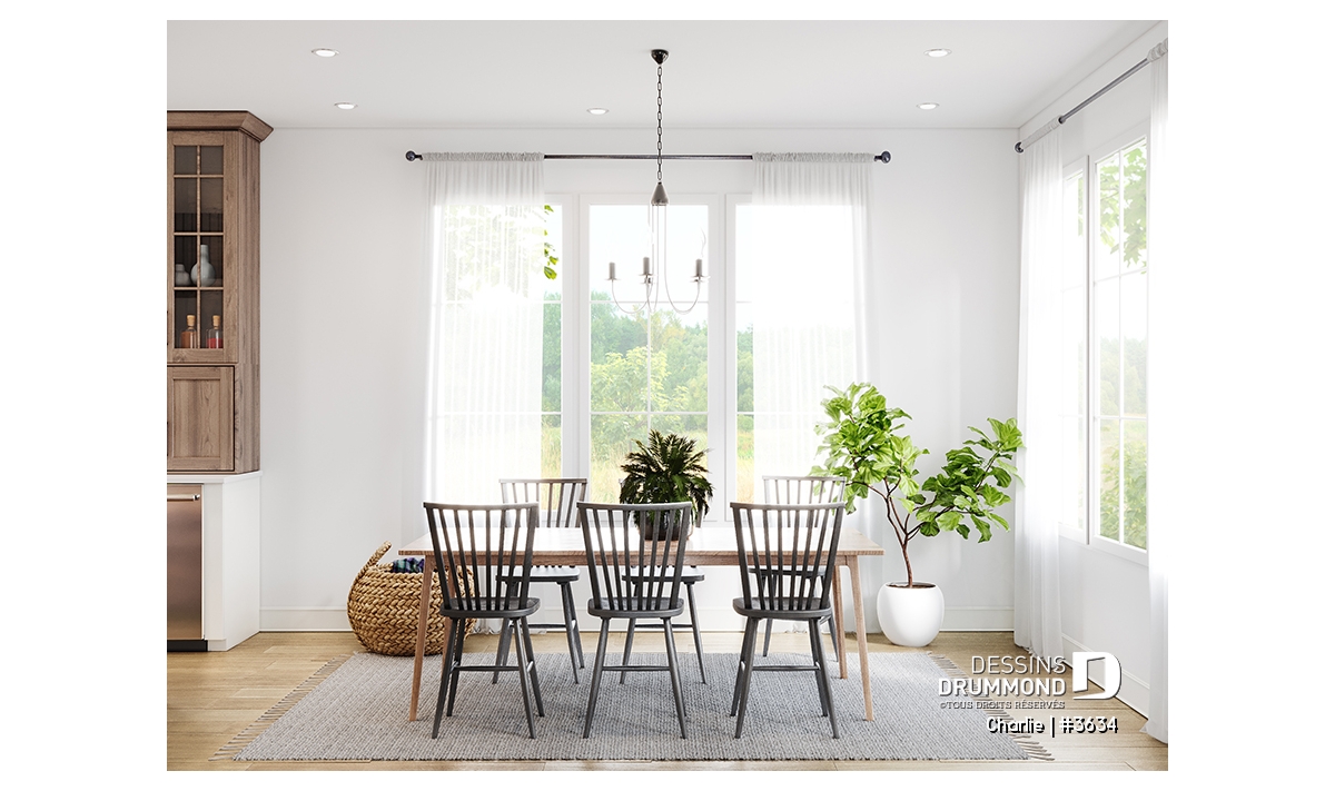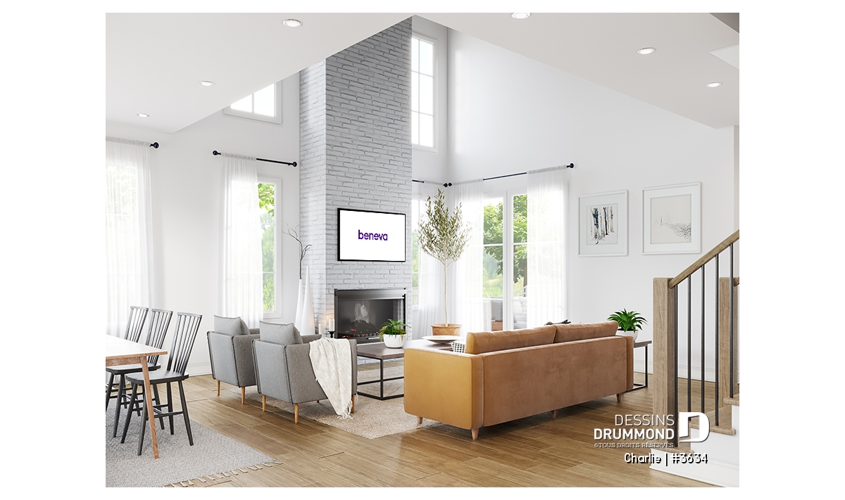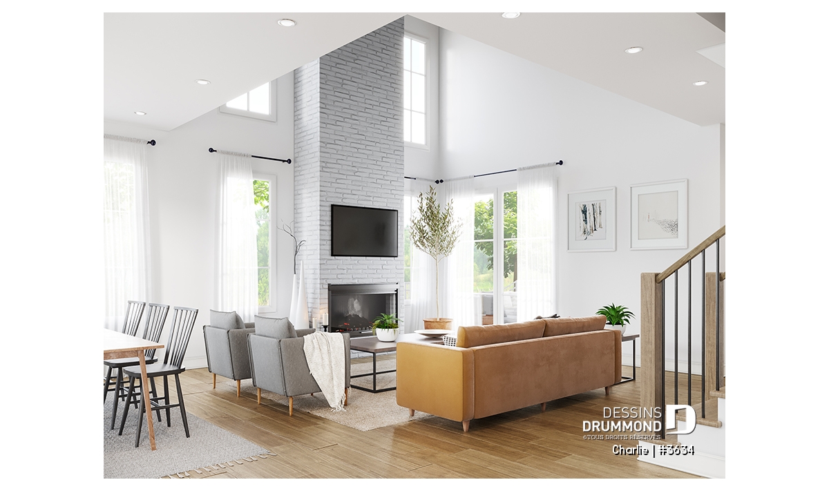 Plafonds de 9' au rez-de-chaussée et de 18'6'' à la salle de séjour, pour une impression de grandeur.