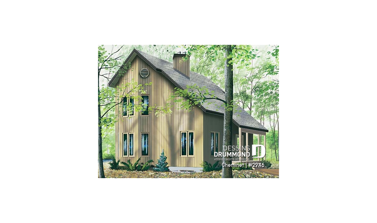 Plan de chalet d'inspiration scandinave, 2 chambres, salle familiale fermée, portes françaises, mezzanine