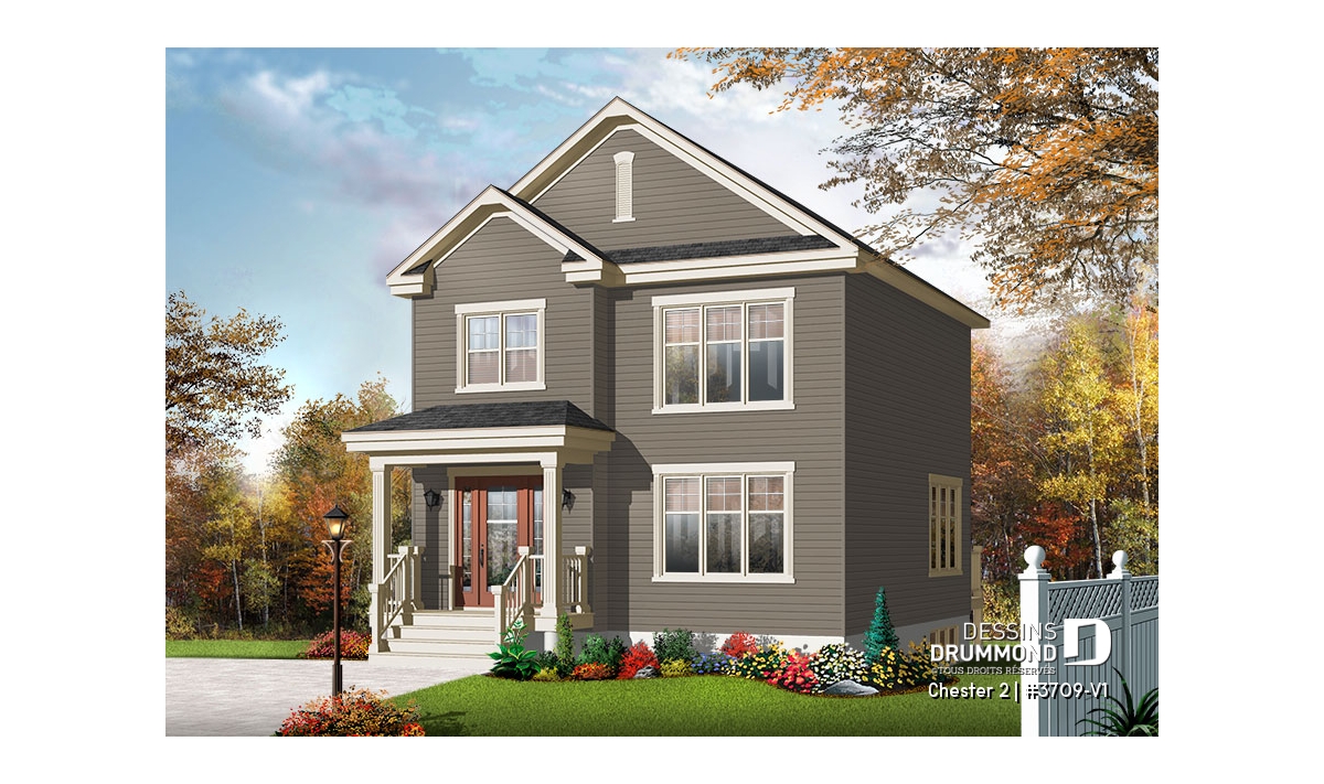 Plan de maison idéale pour terrain étroit, 2 étages, 3 chambres, petit bar à café, grande s.bain familiale