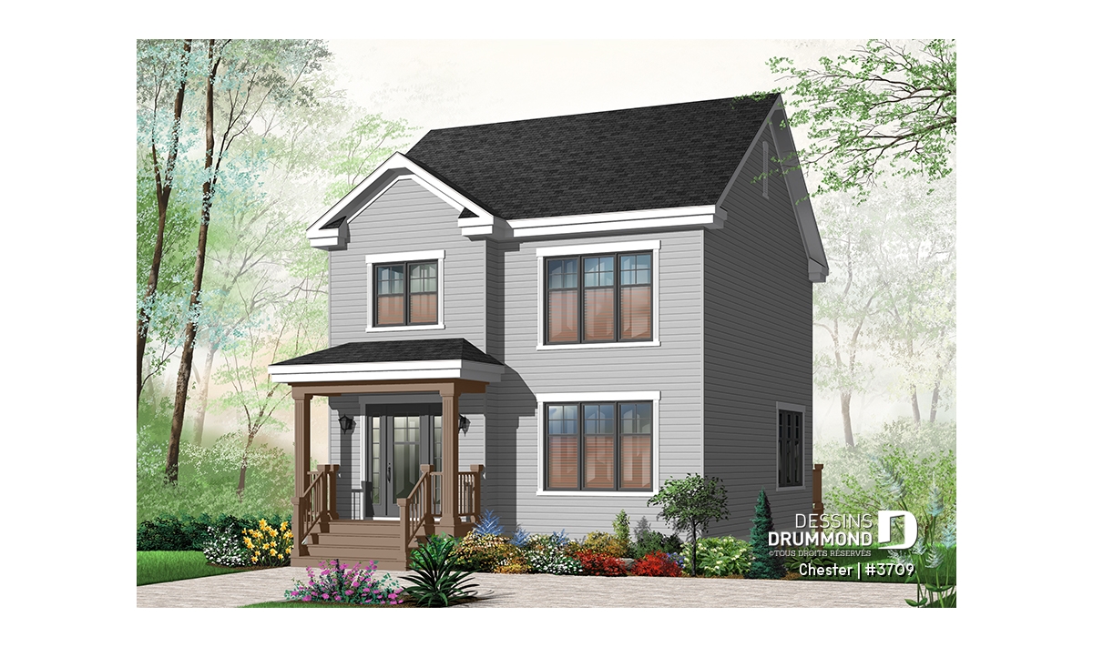 À l’extérieur, des lignes simples et un volume en saillie pour l’entrée avant procurent à ce cottage une allure passablement attrayante et un prix de revient l’étant tout autant.