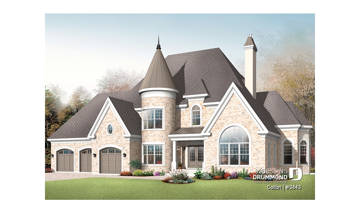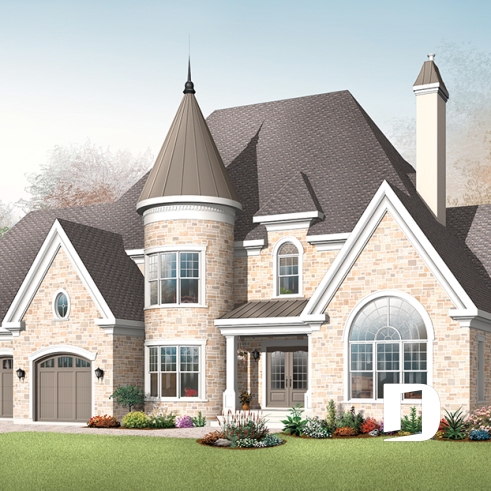 Regroupant une bonne quantité de caractéristiques propres aux maisons de genre manoir dont la somme des pièces, les quelques foyers, un volume en tourelle et des corniches plus élaborées, pour ne nommer que ceux-là, ce cottage fut d’abord remarqué comme toile de fond des expositions auxquelles Dessins Drummond inc. participa en 2004. Voyons donc ensemble ce qu’il a à offrir.
