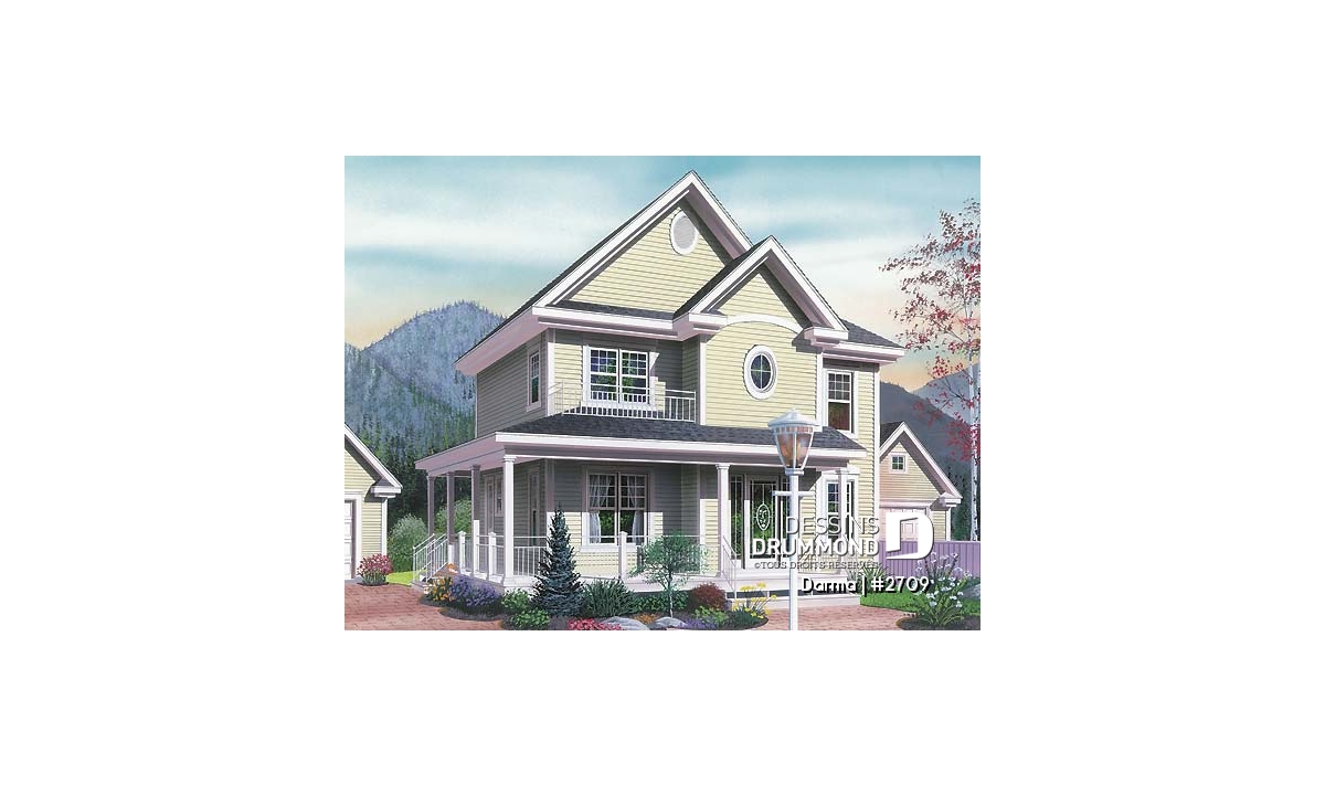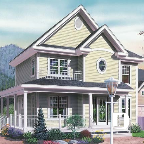 Plan de maison traditionnelle, à étage, grand balcon couvert avant/côté, 3 chambres, bureau à domicile
