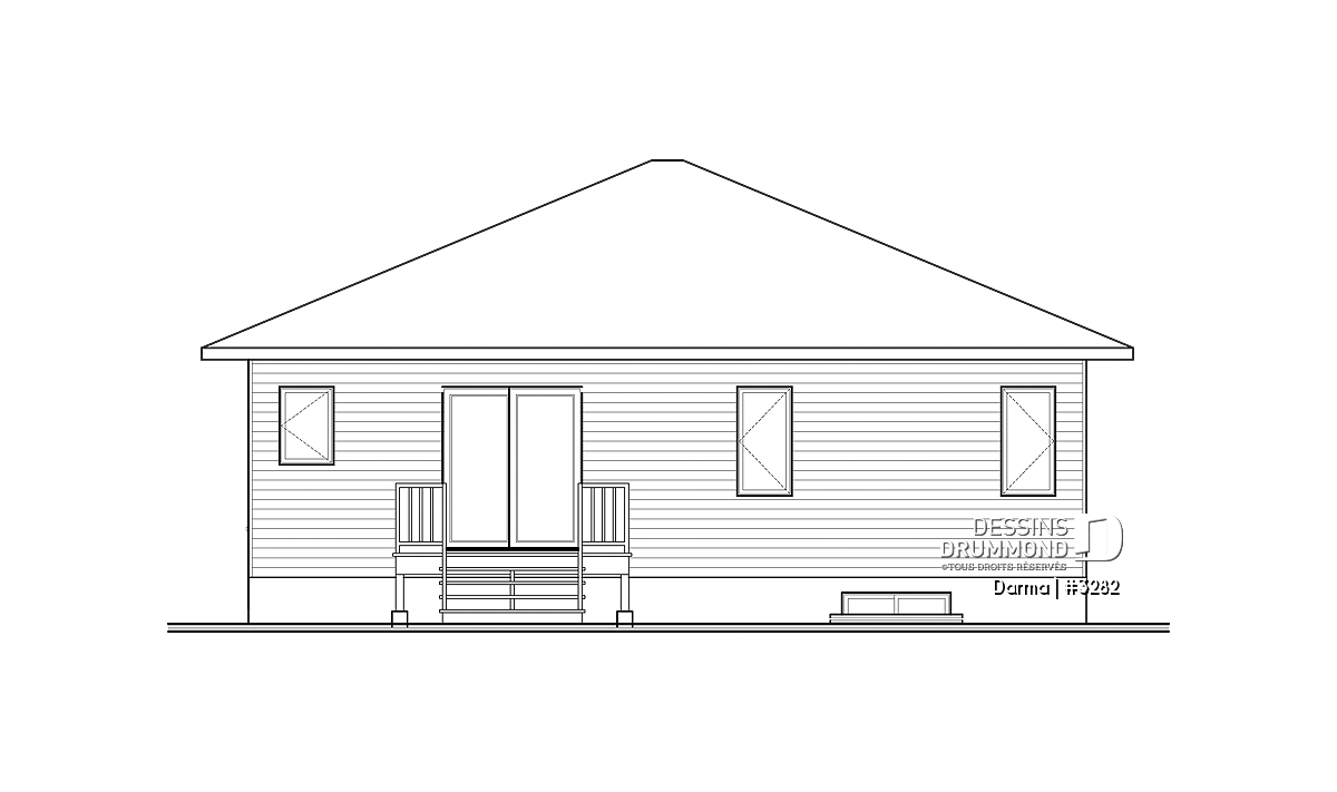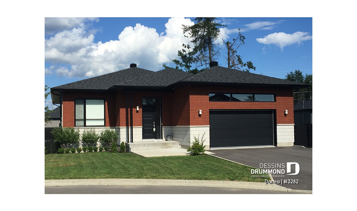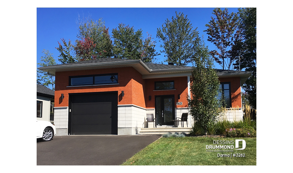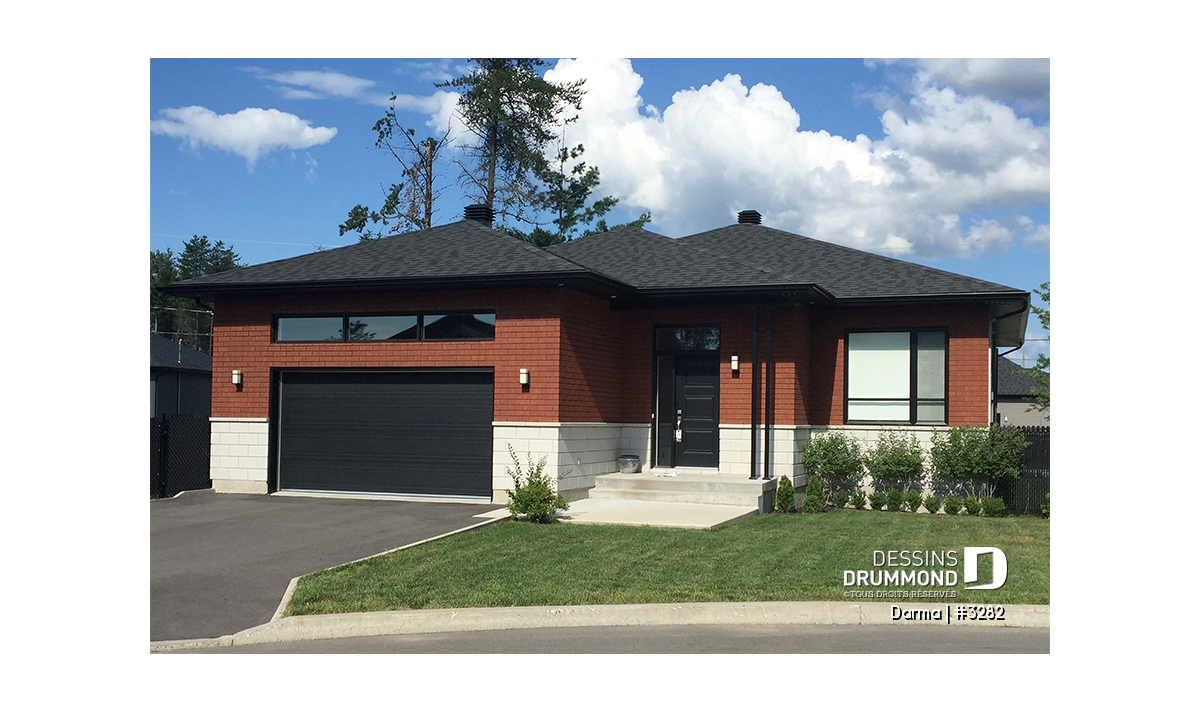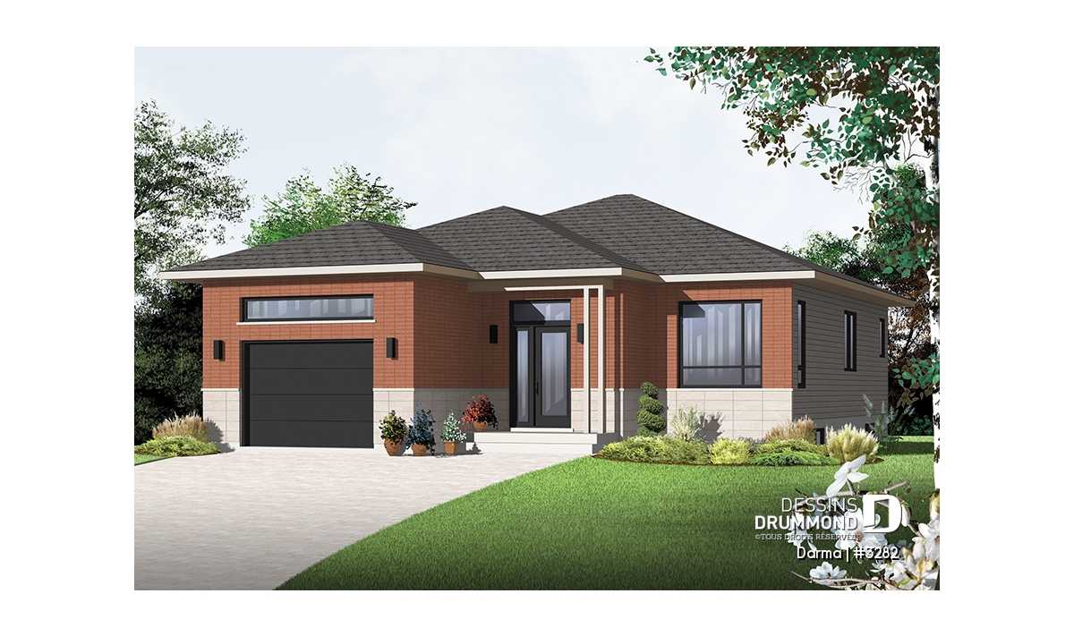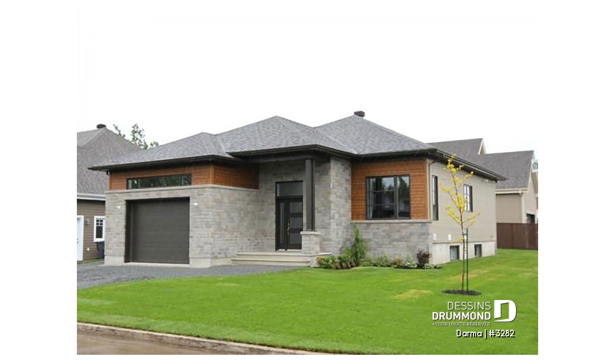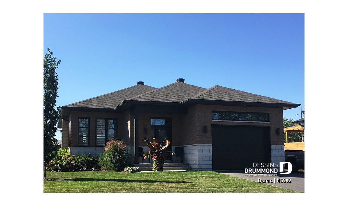 Plutôt fière de sa collection de plans de style contemporain Dessins Drummond suggère ici, en guise de complément à cette collection, un plan de plain-pied faisant 36pi de largeur par 50pi de profondeur avec garage bien intégré de 14pi x 20pi intérieur et toiture simplifiée permettant de consacrer une certaine part du budget de construction aux pi2 habitables plutôt qu’à une toiture complexe comme on en a tant vue ces dernières années.