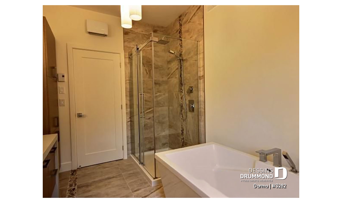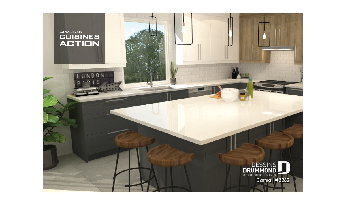 À l’intérieur, à l’instar du modèle similaire 3281, on constate une entrée dégagée avec garde-robe de 5pi de largeur et accès au garage tout près, un secteur activités entièrement ouvert et rempli de lumière naturelle ainsi qu’une cuisine avec plein de rangement, un îlot-lunch de 60po x 48po et une porte-patio donnant sur l’arrière. On apprécie un coin laveuse/sécheuse prévu au rez-de-chaussée, deux chambres de très beau format avec chacune sa garde-robe walk-in et on est agréablement surpris par une salle de bain suggérant un combo bain/douche faisant 5pi x 7pi et comme de plus en plus aménagé dans les salles de bain contemporaines.