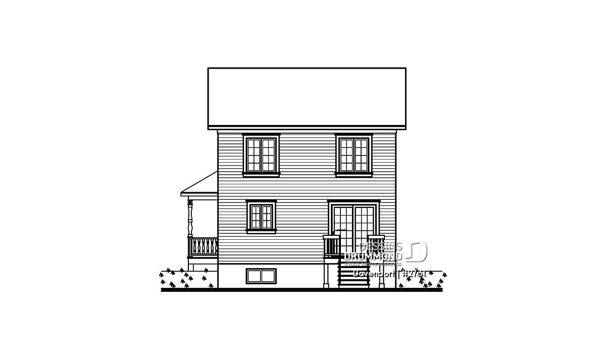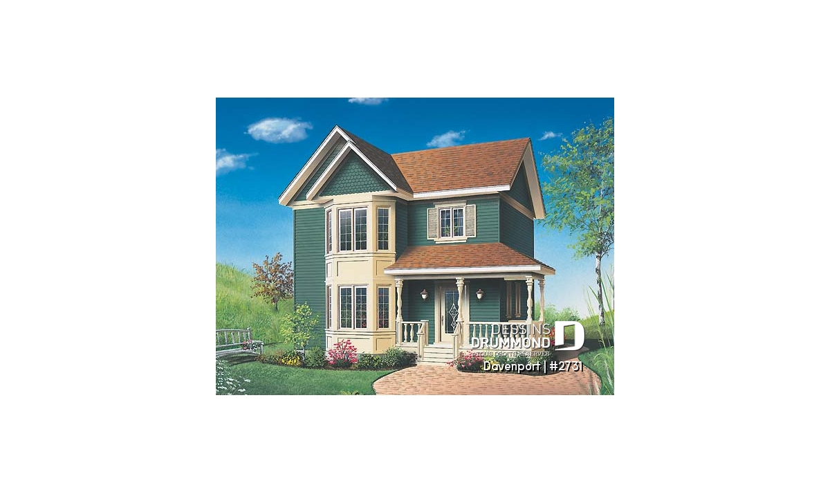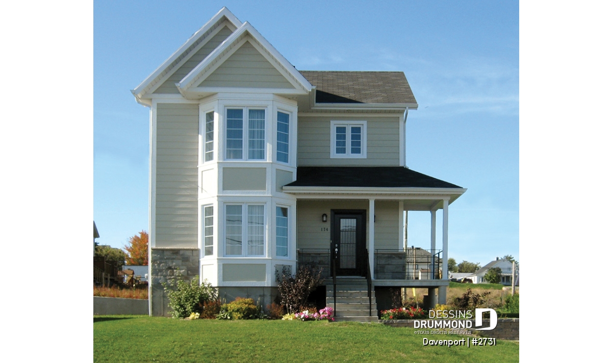 De format budgétaire, si on peut dire, ce cottage se veut tout de même fort élégant avec sa façade agrémentée d’une belle galerie débordant sur le côté droit de la maison ainsi que d’une fenêtre en baie allongée sur deux étages et jumelée à de chics panneaux en retrait. À cela s’ajoute un déclin champêtre de teinte relevée et de qualité supérieure et des bardeaux décoratifs en forme d’écailles de poisson au pignon du volume en baie.