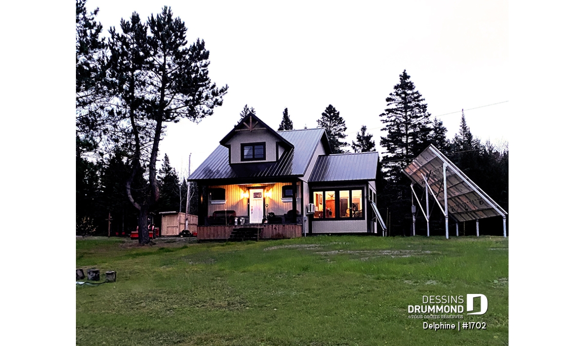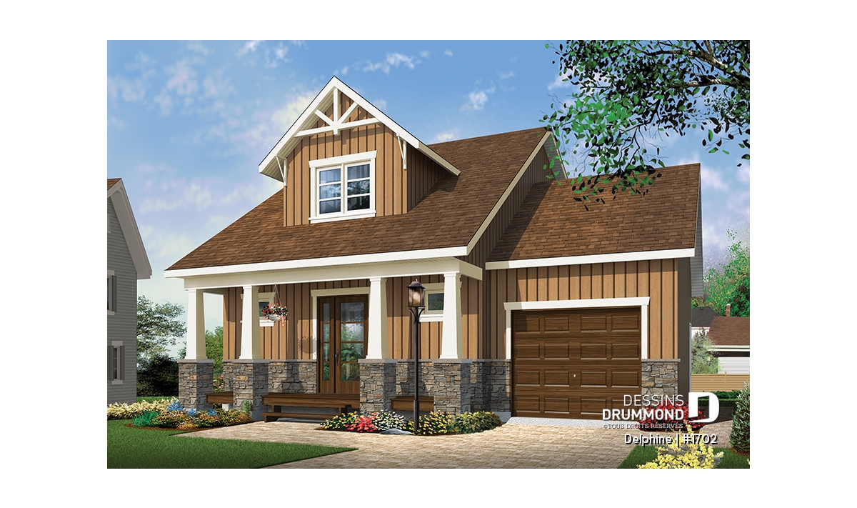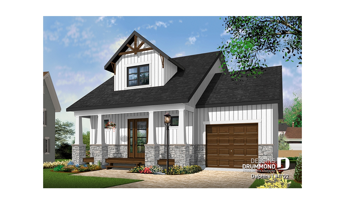 Le mariage de pierres, de colonnes et de garnitures ainsi que le grand balcon couvert à l'avant de ce nouveau modèle de style moderne / rustique, saura assurément vous séduire! En effet, comment ne pas tomber sous le charme de Delphine, avec son allure "mini-maison" luxueuse, son style champêtre et rustique à la fois, et son concept intérieur ultra fonctionnel. De l'entrée principale, vous rencontrez une salle d’eau complétée d’une buanderie avec rangement, puis une grande garde-robe double fort logeable. Dans la section arrière du rez-de-chaussée, le plan de plancher est entièrement à aire ouverte et comporte une cuisine, un espace salle à dîner pour 6+ personnes et une salle familiale très conviviale. Cette section s'étend sur toute la largeur et offre une vue sur la cour arrière et un accès à un balcon sur lequel vous serez heureux de recevoir famille & amis, ou d’y cuisiner un BBQ à l’occasion. Il y a un accès direct au garage, et un grand rangement est prévu dans ce secteur. Deux belles chambres à coucher à l'étage, bien fenêtrées, comportent chacune une grande garde-robe et se partagent une salle de bain complète avec vanité double. Le garage est prévu pour une voiture, et le sous-sol est aménageable. Il est à noter que plusieurs options de fondation sont disponibles, contactez le service à la clientèle pour information. De plus, ce modèle est facilement modifiable en ligne.