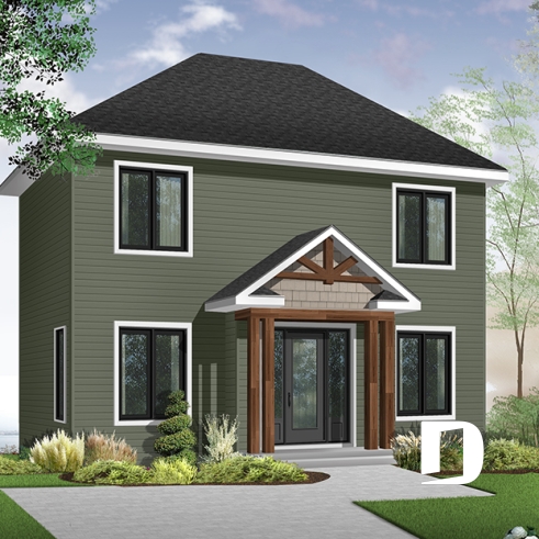 Plan de maison à étage, petit budget. 2 chambres avec walk-in, salle de lavage à l’étage, cuisine avec îlot.
