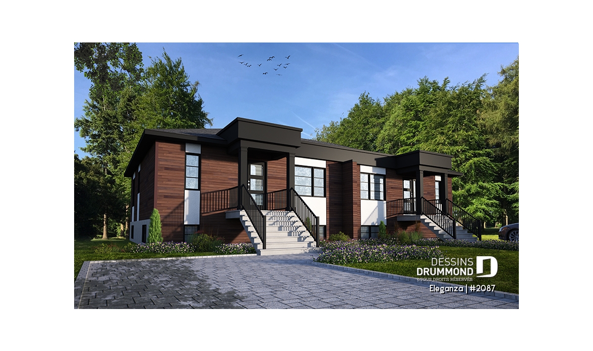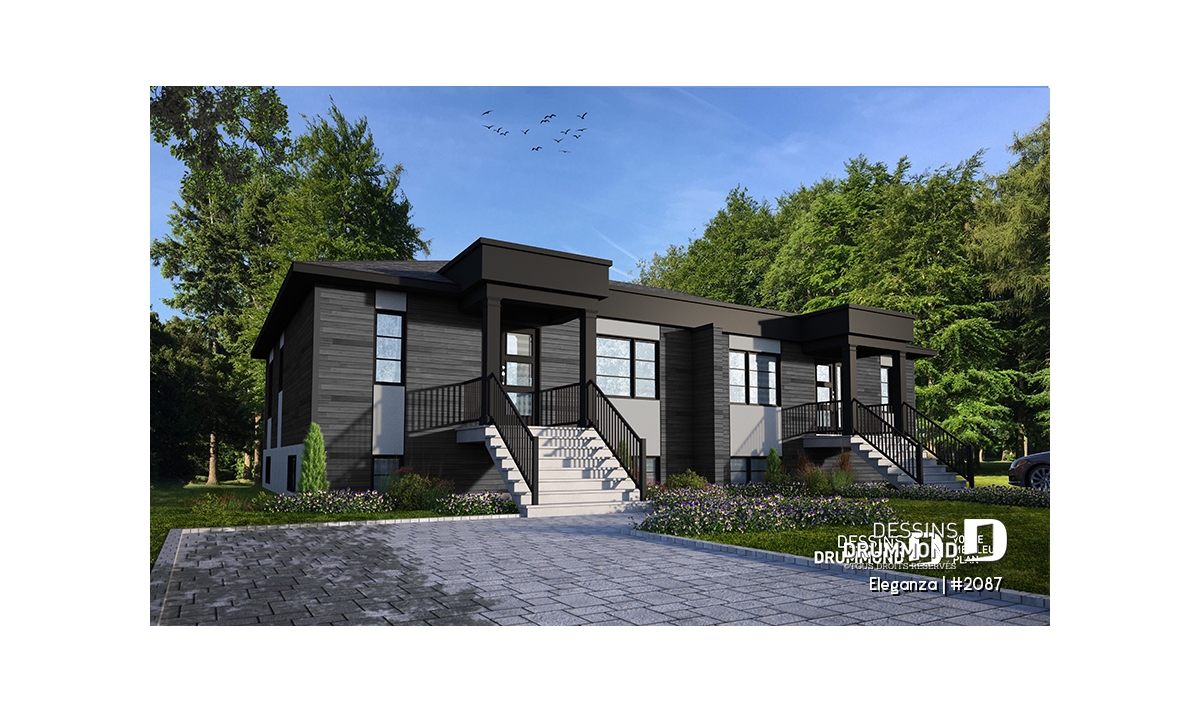 Vue avant - MODÈLE DE BASE - Plan de jumelé moderne mid-century, 1 à 3 chambres, superbe cuisine, salle à manger et salon à aire ouverte  - Eleganza