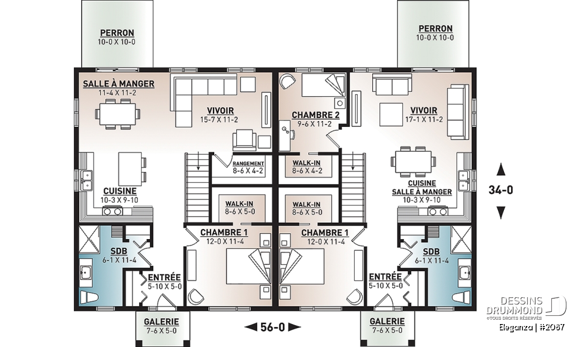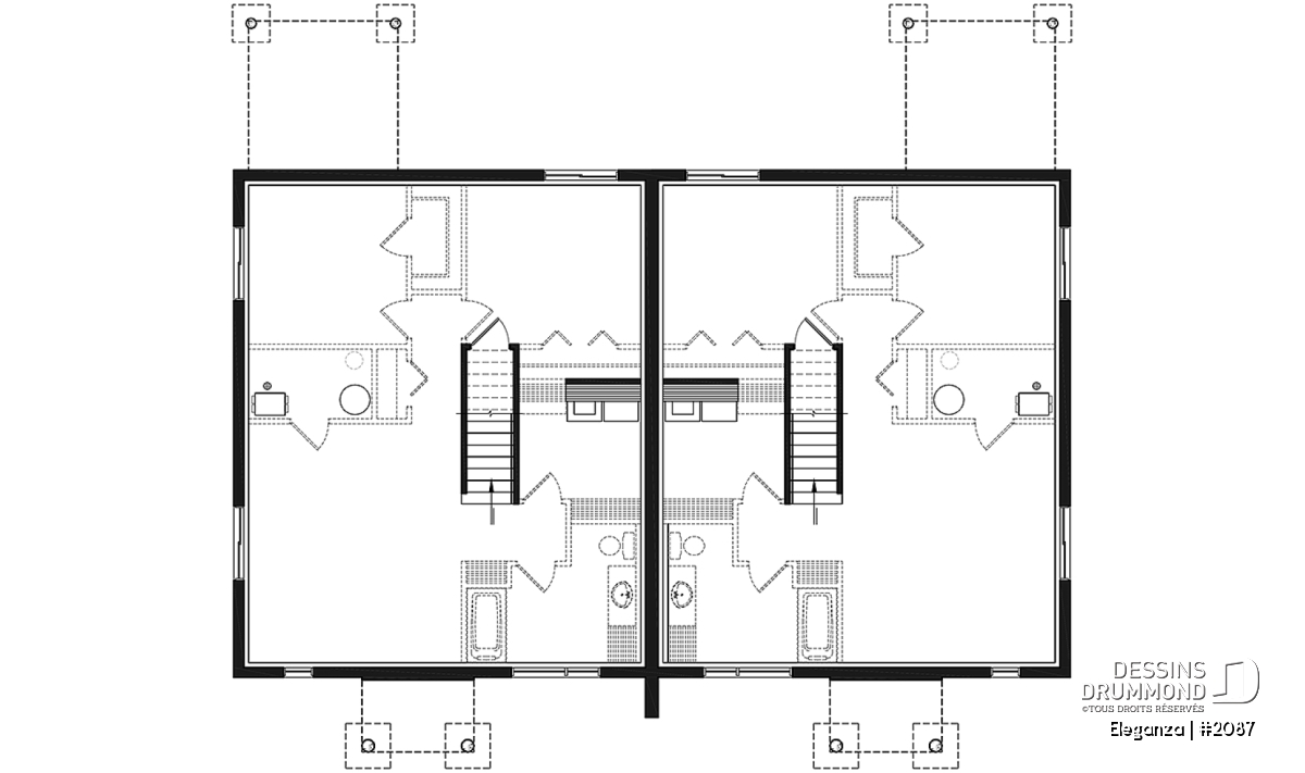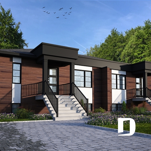 Plan de jumelé moderne avec options 1 et 2 chambres par unité incluses au plan.