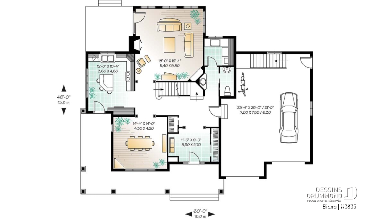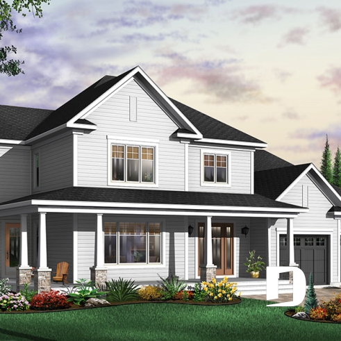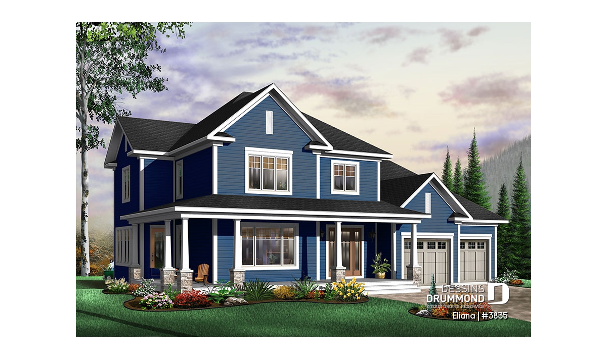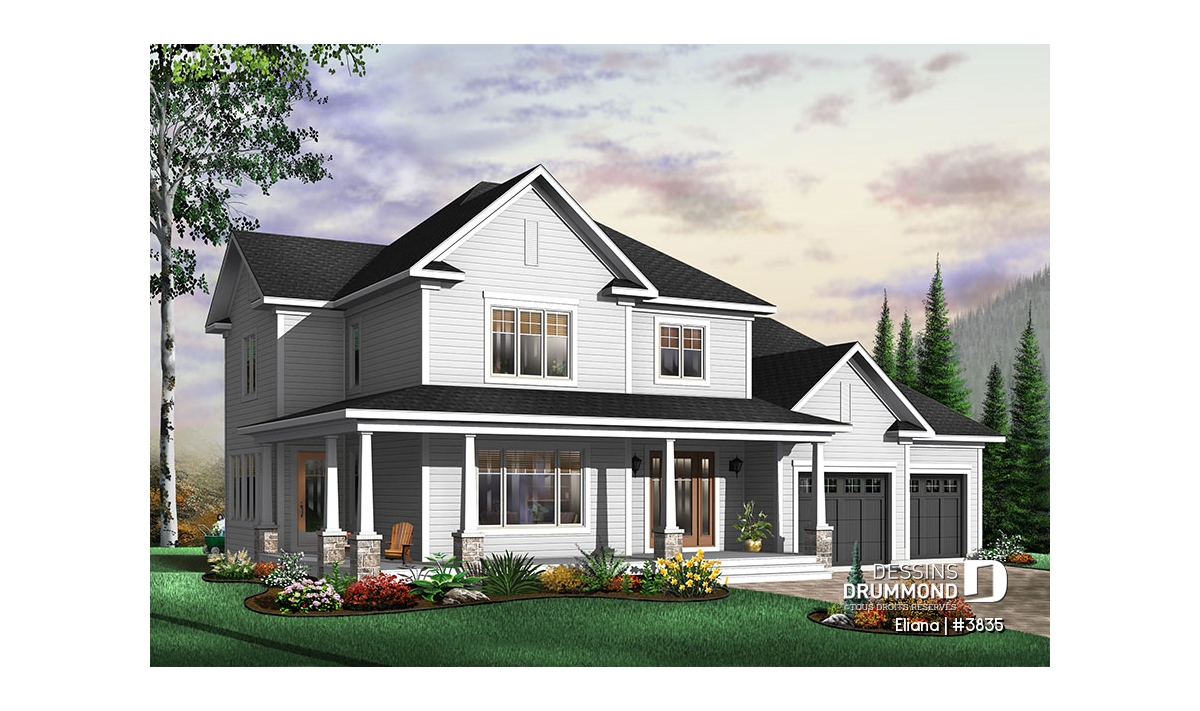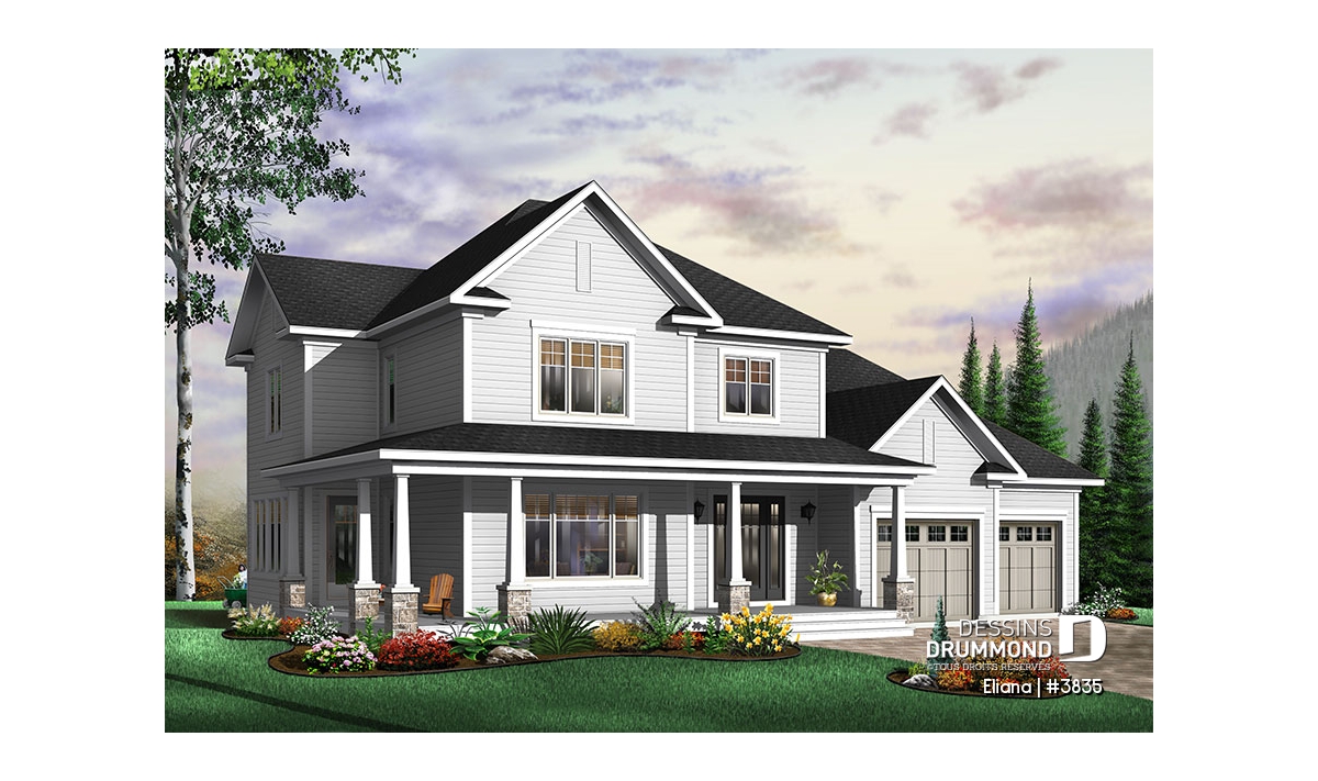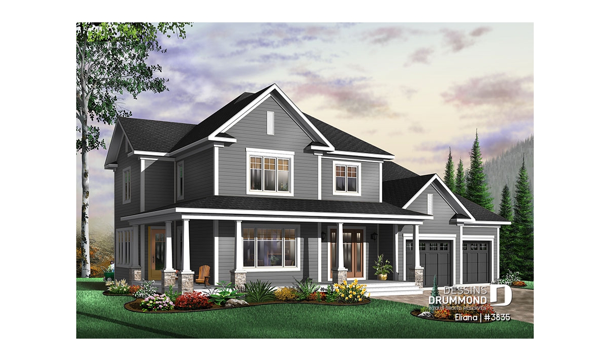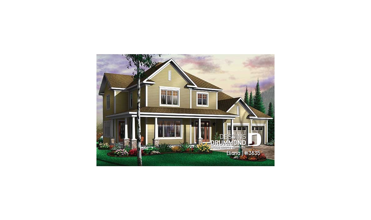 Plafond à 8pi.8po. au rez-de-chaussée, grande galerie couverte reliant l'entrée principale à l'entrée de service de la cuisine, garage double avec descente au sous-sol et 4 chambres prévues à l'étage.