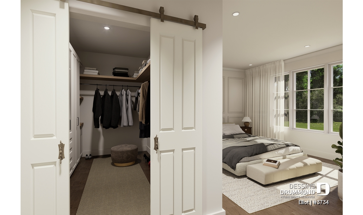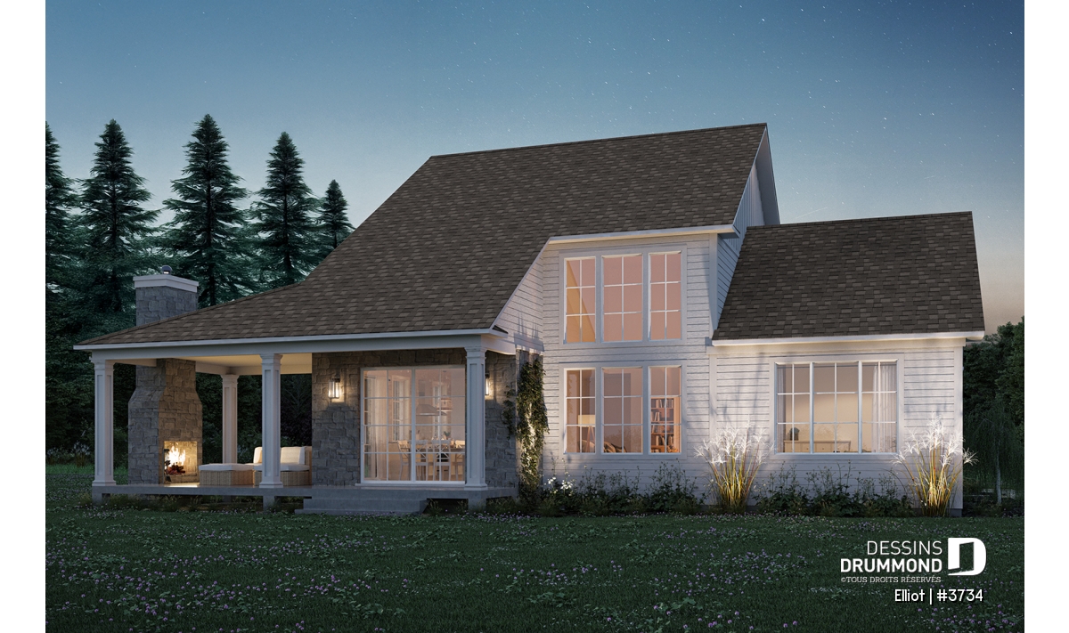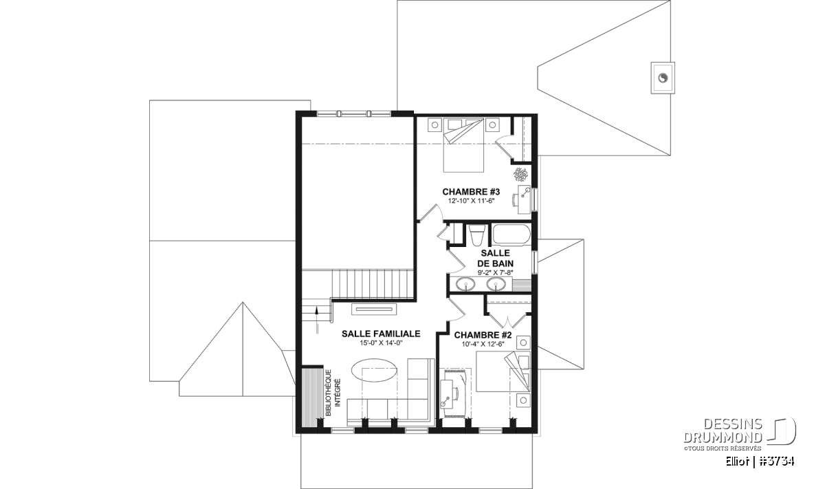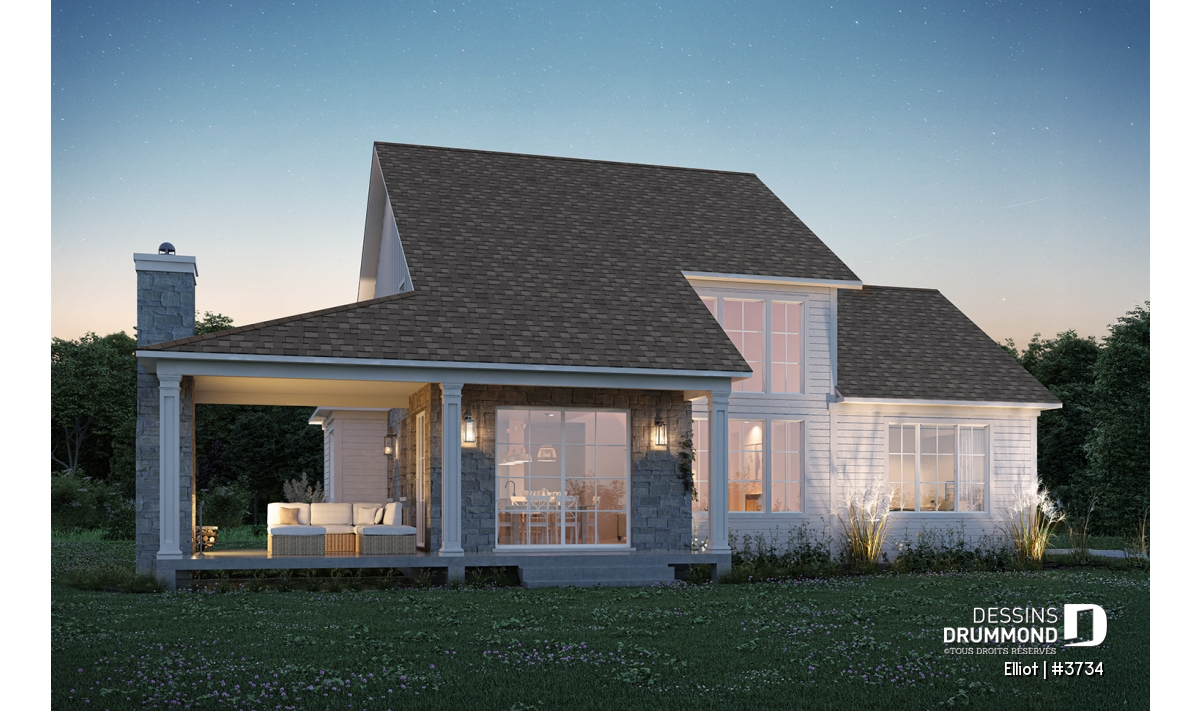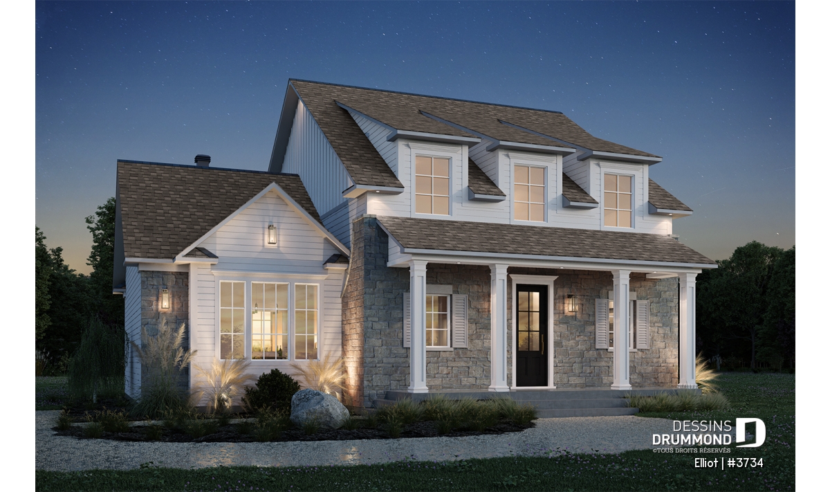 Le plan de maison ELLIOT (#3734) propose 2 268 pi² aménagés sur deux étages, avec un sous-sol non fini ajoutant 1 582 pi² supplémentaires.