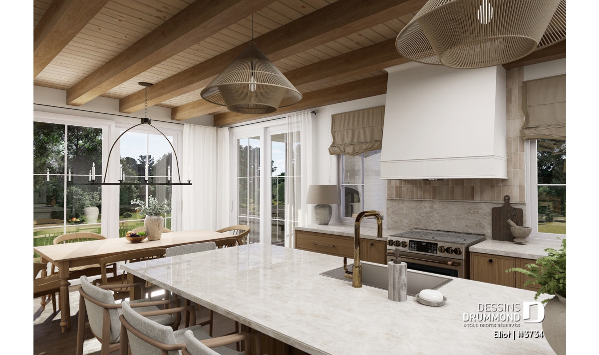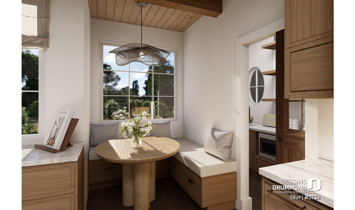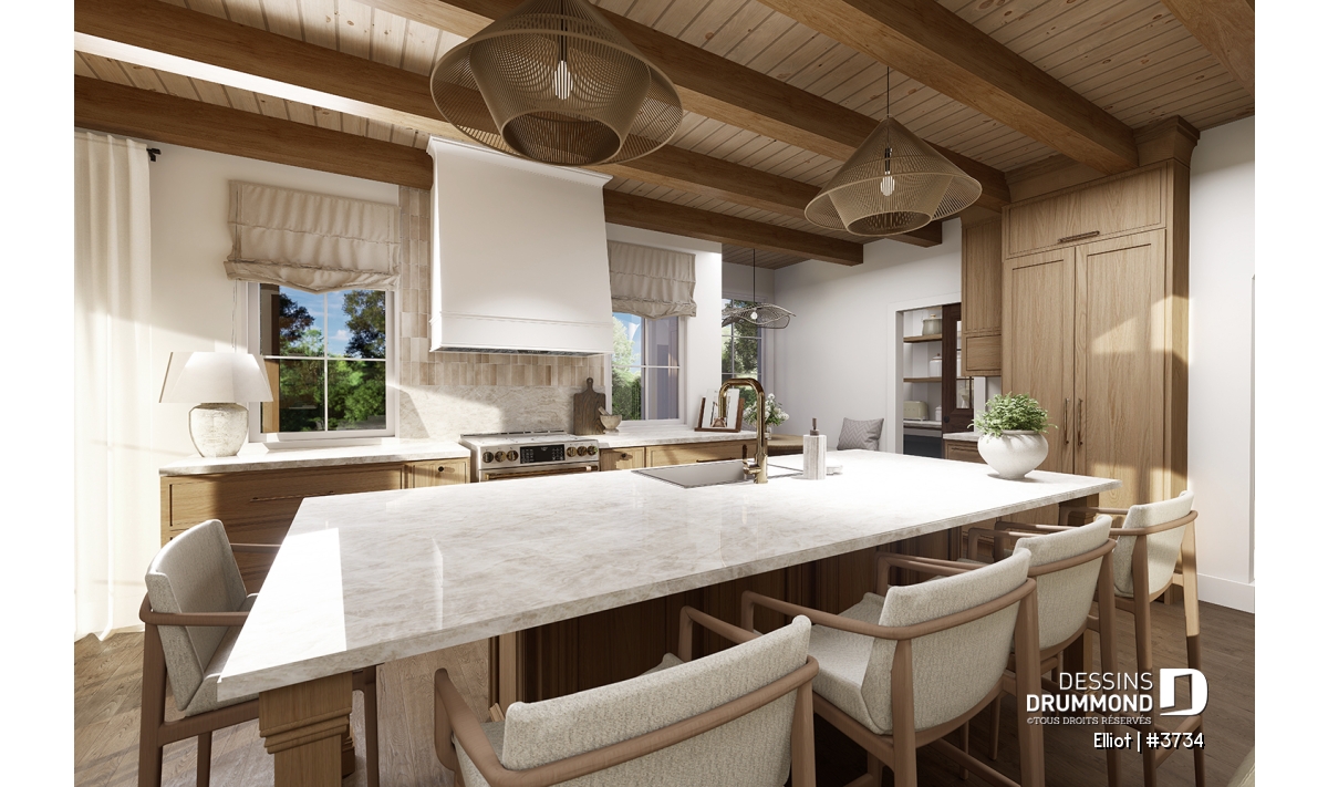 La cuisine, ouverte sur la salle à manger et le salon, regroupe plusieurs éléments qui feront le bonheur du chef de la maison ! À droite, une charmante dînette avec table ronde et banquette peut accueillir confortablement deux à trois personnes. Le garde-manger, quant à lui, inclut un évier, un cellier et un vaste espace de rangement pour vos denrées. Au cœur de la cuisine, un grand îlot de 9' x 3'6'' deviendra un lieu de rassemblement privilégié, que ce soit pour les enfants à l'heure des devoirs ou pour les adultes lors de l’apéro.