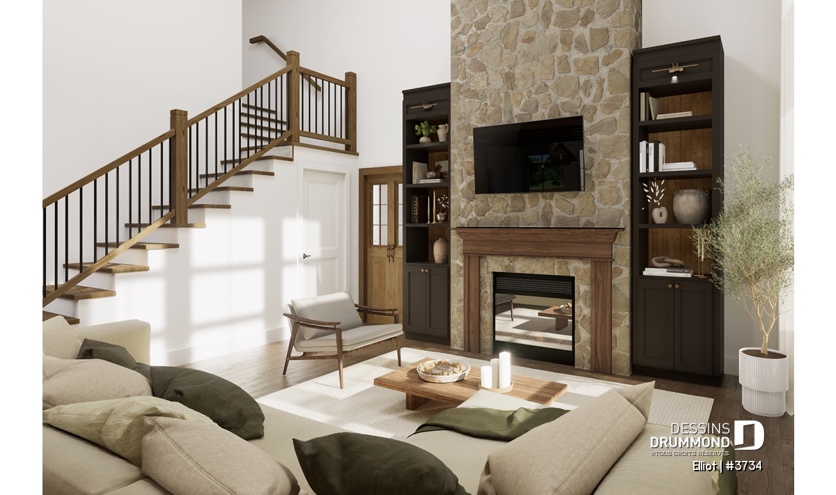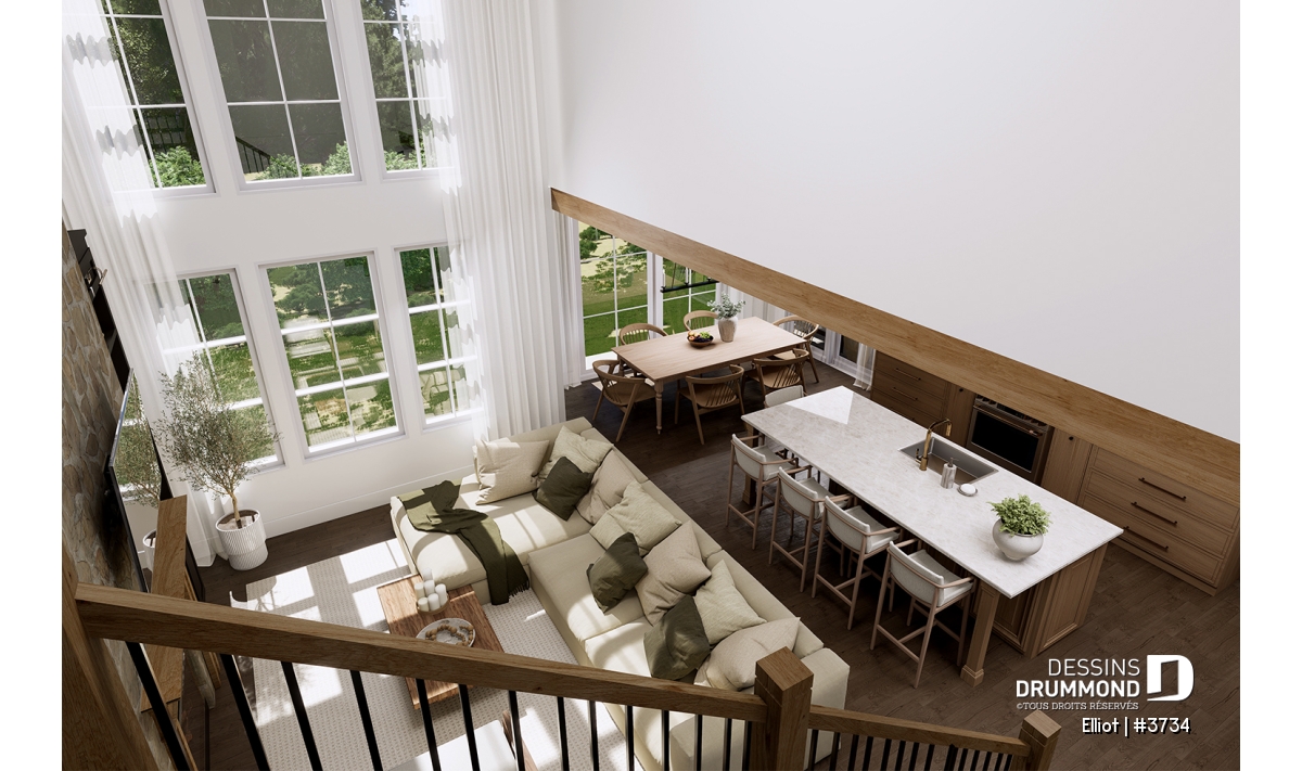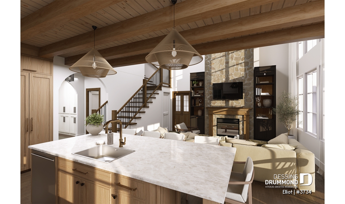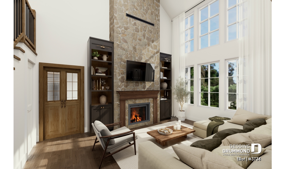 La cuisine s’ouvre sur un salon majestueux au plafond de 18'4", apportant une impressionnante sensation de grandeur. Au cœur de cet espace trône un foyer central, véritable signature du plan. Le modèle proposé, le foyer à bois STÛV s21, combine performance et design élégant. Il devient le point focal du séjour en apportant chaleur, ambiance scandinave et charme intemporel aux soirées en famille ou entre amis. De grandes fenêtres donnant sur la cour arrière baignent la pièce de lumière naturelle et renforcent cette atmosphère conviviale.