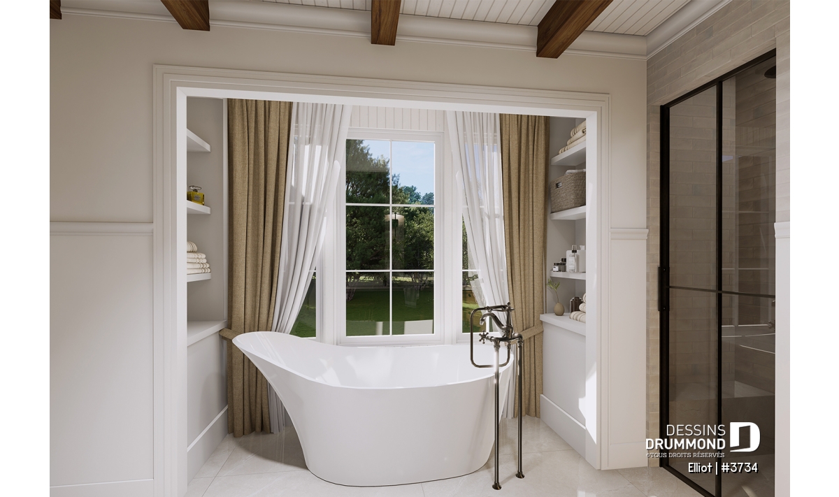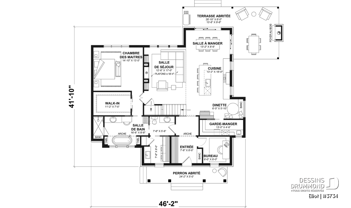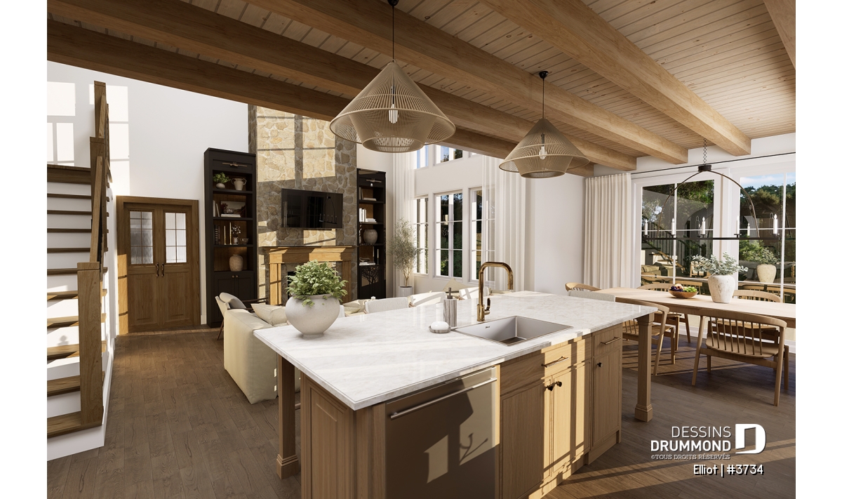 Arche, Dinette / Coin déjeuner, Foyer, Galerie 2-3 côtés, Garde-manger, Ouvert sur 2 étages, Banquette, Bureau / Salle étude, Bain et douche séparés, Suite des maîtres au rdc, Walk-in ch. maîtres, Meuble(s) encastré(s), Aire ouverte, Ilôt, Plafond à plus de 8', Terrasse abritée, Lavabo double, Tablettes, Plafond en pente