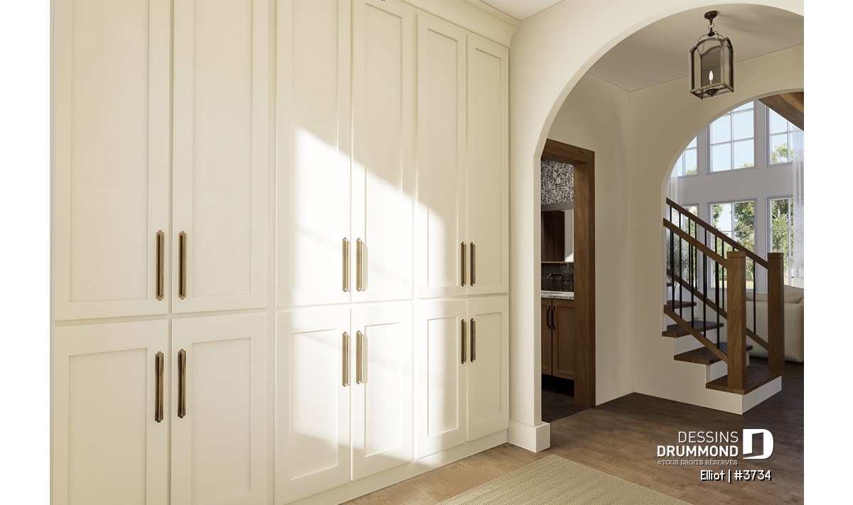 Dès l’entrée, la disposition des espaces a été pensée pour allier praticité et élégance. À droite, un bureau fonctionnel a été aménagé, accompagné d’une grande garde-robe et d’un banc. La transition vers la cuisine est marquée par une élégante arche architecturale, annonçant ainsi le ton des magnifiques éléments de design qui suivront.
