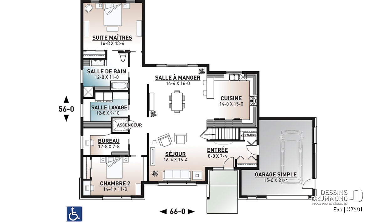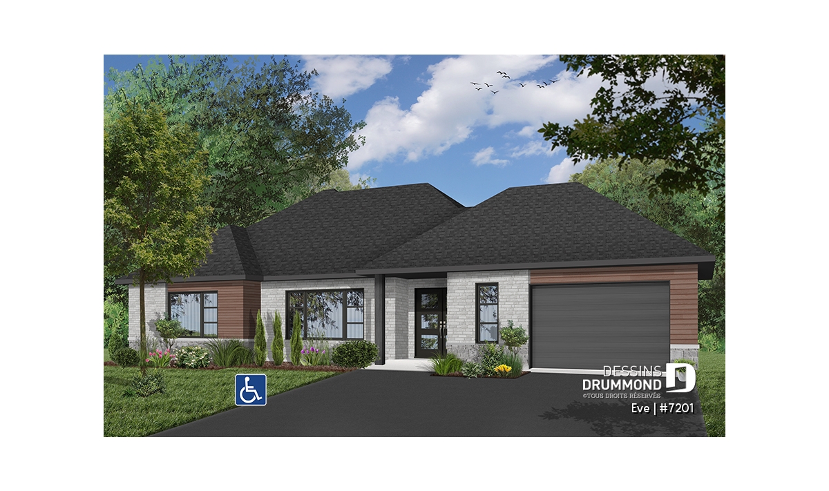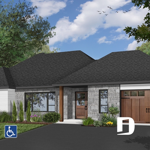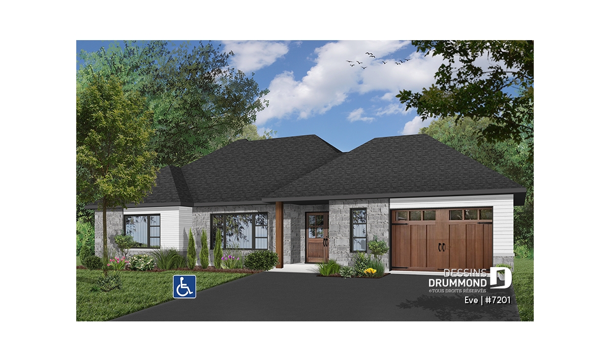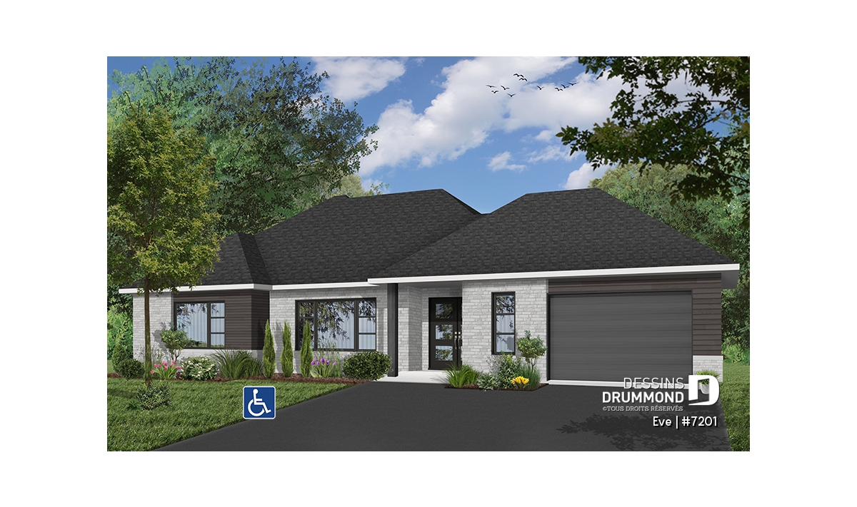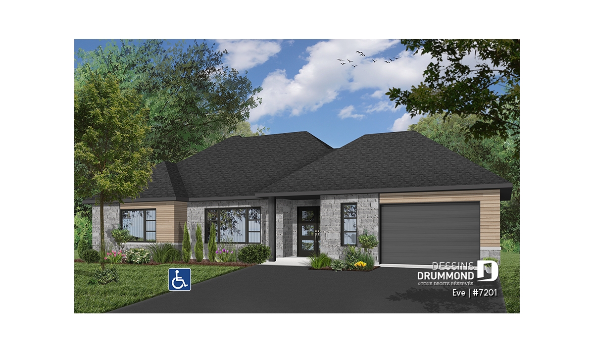 Découvrez notre nouveau plan de maison de plain-pied contemporain # 7201 de Dessins Drummond, aussi appelé Ève. Ce nouveau plan de plain-pied contemporain avec garage propose un plancher entièrement adapté pour fauteuil roulant. De plus, un ascenseur est localisé au cœur de la maison permettant l’accès aisé au sous-sol au personne à mobilité réduite ou en chaise roulante.