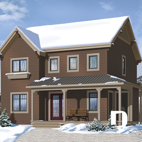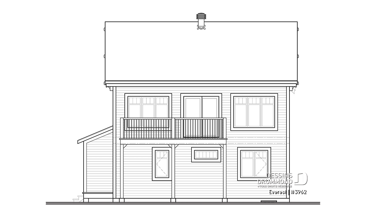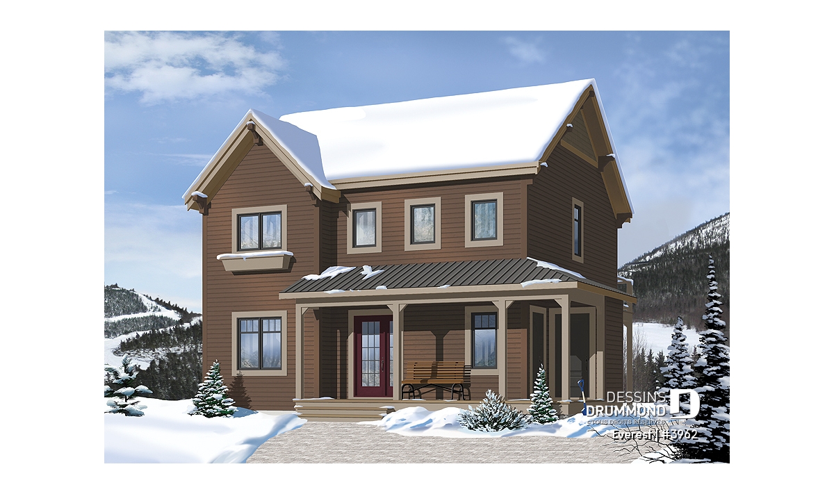 Vue avant - MODÈLE DE BASE - Maison genre chalet de ski, plancher inversé, aire ouverte à l'étage, foyer pour cuisine et salon, 3 chambres - Everest