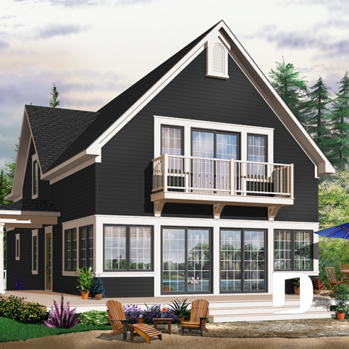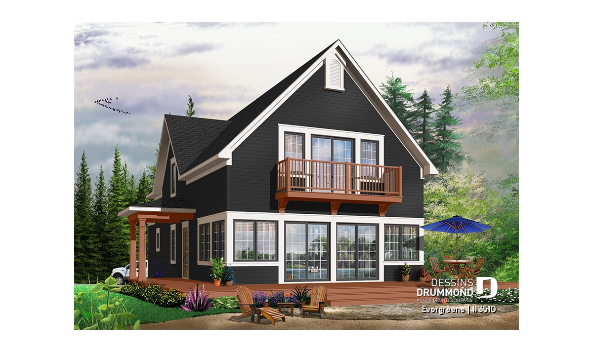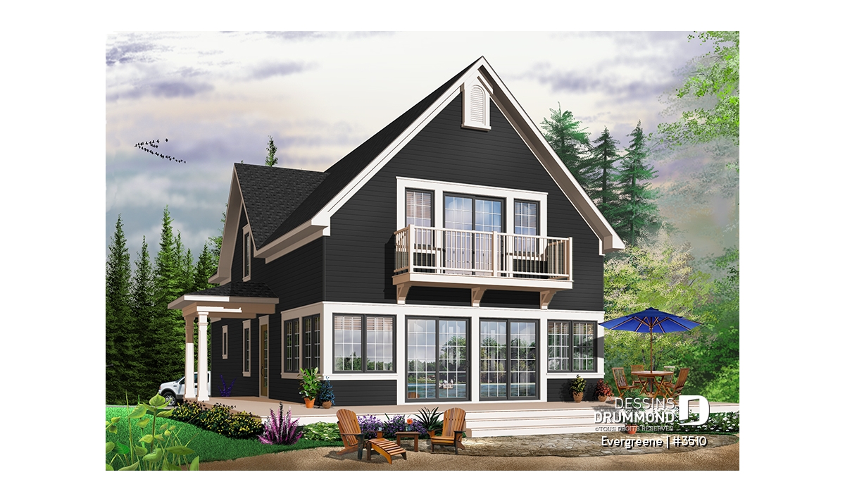 Cette maison champêtre rustique, ou chalet, propose une fenestration plus qu’abondante et sans équivoque quant à la vocation de la maison. De plus, ce balcon élargi à l’étage et appartenant à la chambre des maîtres, vient amplifier le fait que la maison est définitivement prévue pour un site panoramique.