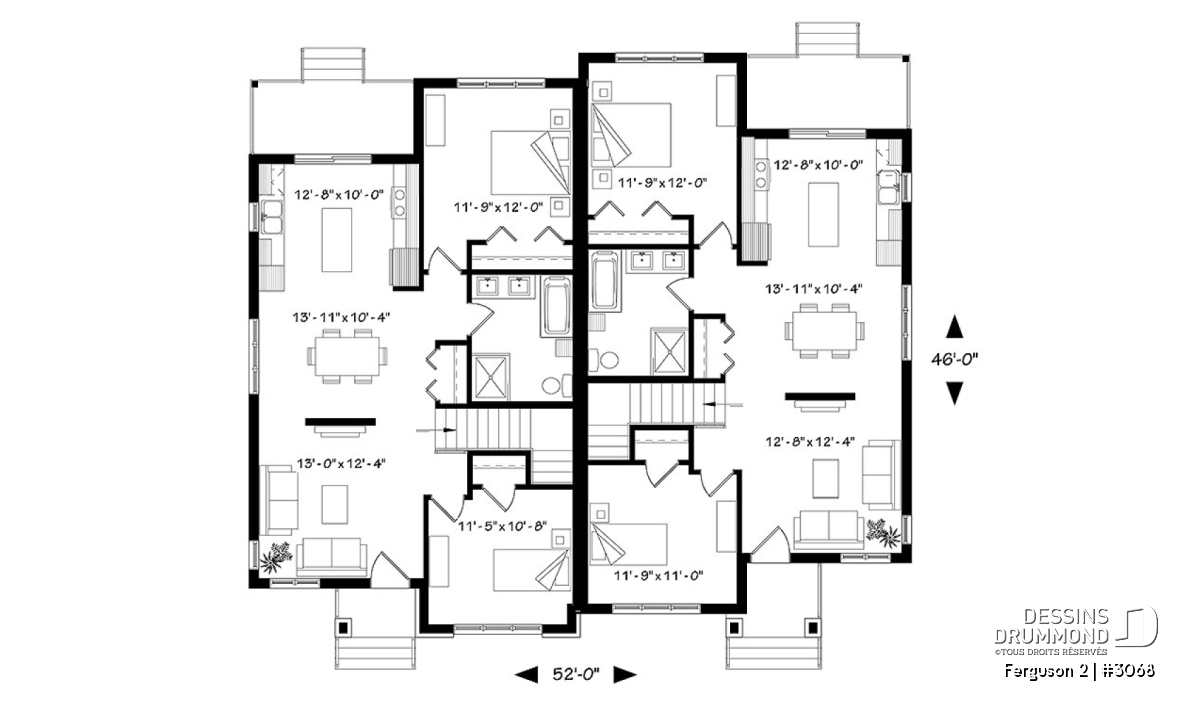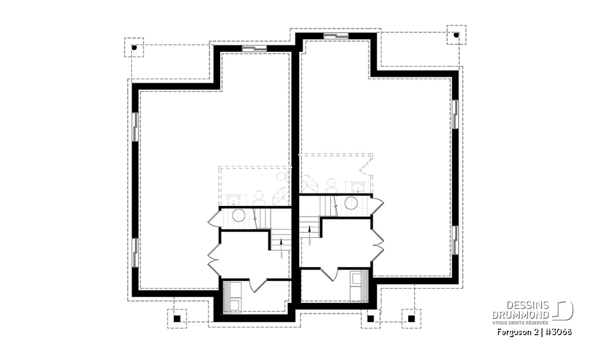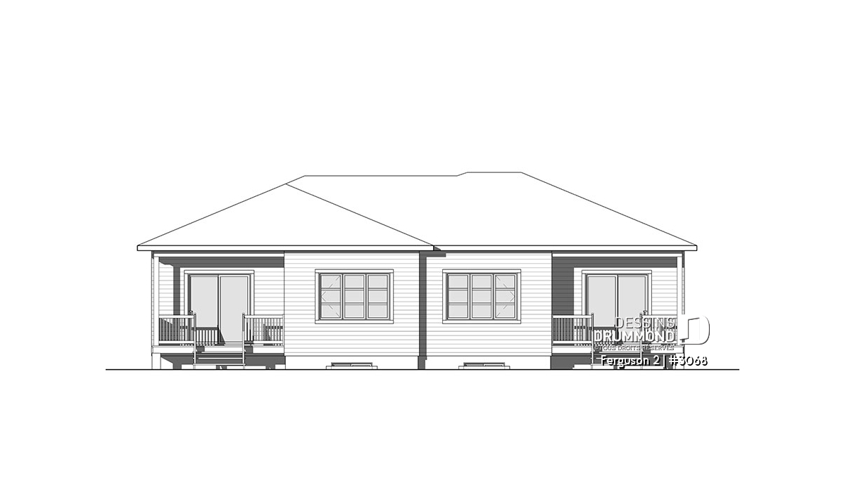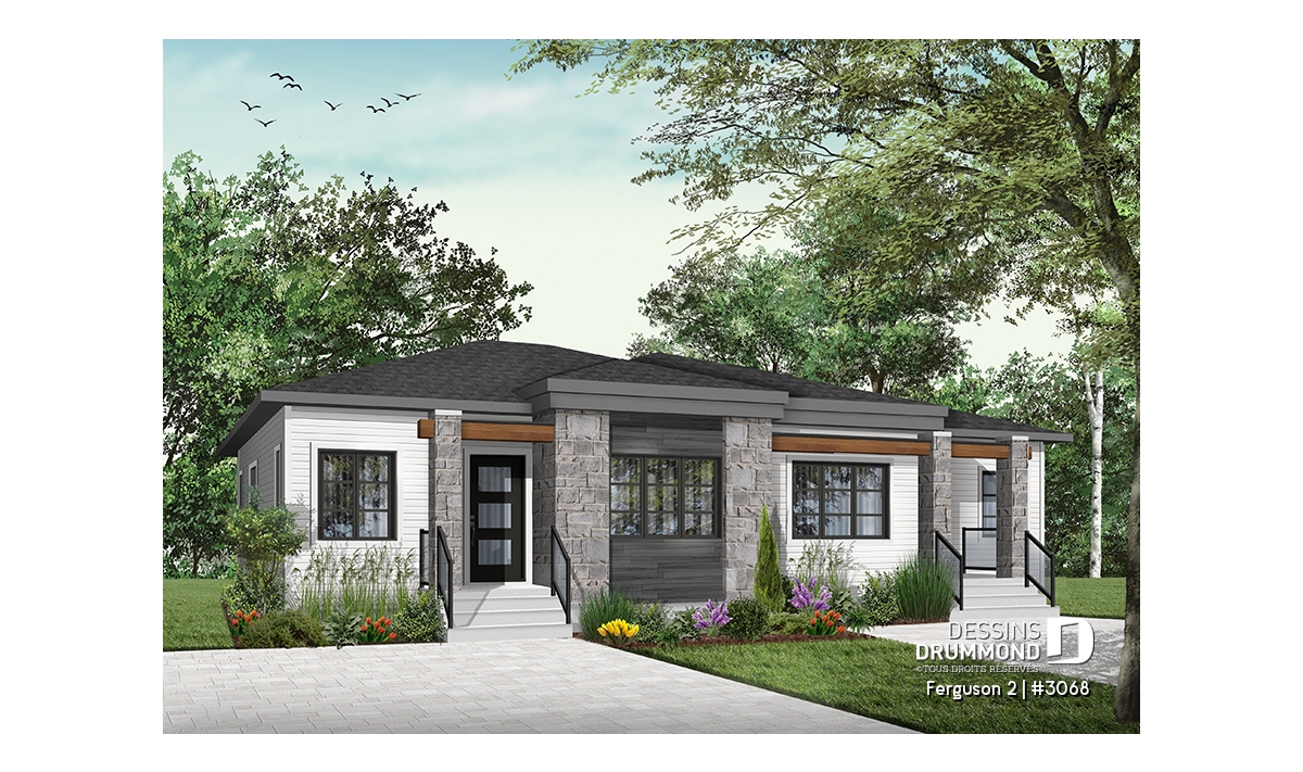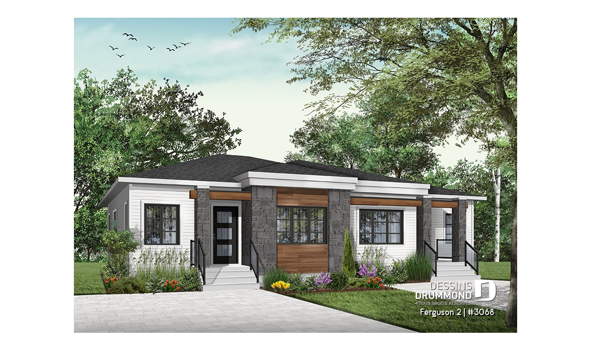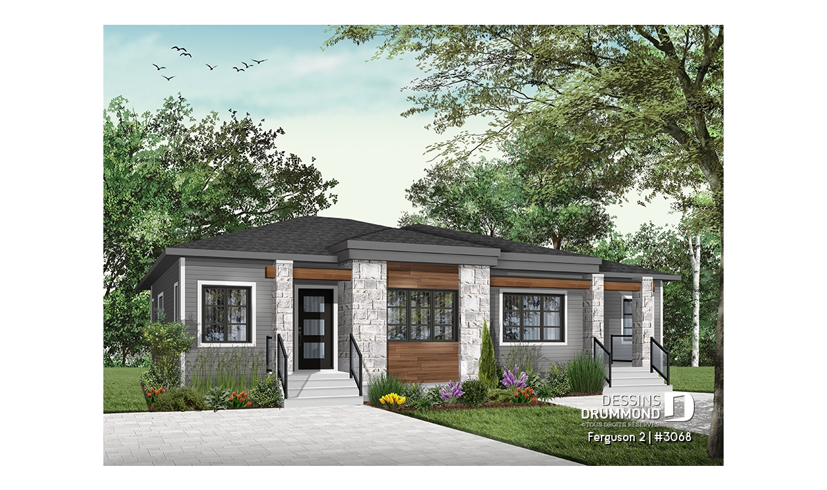 Voici un modèle de jumelé de style contemporain, le nouveau plan # 3068 de Dessins Drummond, vous offrant de beaux espaces et un potentiel au sous-sol pour le futur! Le modèle Ferguson 2, qui est un dérivé du plan # 3067, propose un sous-sol à aménager et une seule salle de bain au rez-de-chaussée au lieu de deux comme son modèle de base. Cette version # 3068 du modèle de base a été pensée pour un couple ou famille souhaitant utiliser l’espace du sous-sol afin d’ajouter des chambres ou une salle familiale. Il est à noter que le plafond du rez-de-chaussée est à 9 pieds partout, ce qui donne une amplitude non négligeable aux pièces.